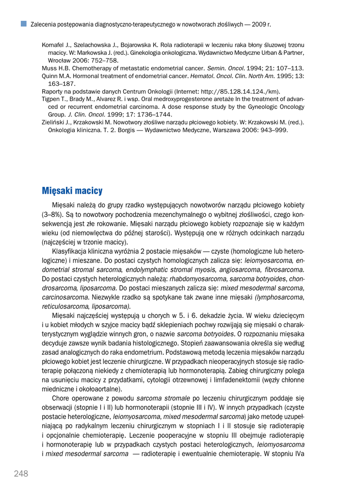Zalecenia postępowania diagnostyczno−terapeutycznego w nowotworach złośliwych — 2009 r. Kornafel J., Szelachowska J., Bojarowska K. Rola radioterapii w leczeniu raka błony śluzowej trzonu macicy. W: Markowska J. (red.). Ginekologia onkologiczna. Wydawnictwo Medyczne Urban & Partner, Wrocław 2006: 752–758. Muss H.B. Chemotherapy of metastatic endometrial cancer. Semin. Oncol. 1994; 21: 107–113. Quinn M.A. Hormonal treatment of endometrial cancer. Hematol. Oncol. Clin. North Am. 1995; 13: 163–187. Raporty na podstawie danych Centrum Onkologii (Internet: http://85.128.14.124./km). Tigpen T., Brady M., Alvarez R. i wsp. Oral medroxyprogesterone aretaże In the treatment of advan− ced or recurrent endometrial carcinoma. A dose response study by the Gyneologic Oncology Group. J. Clin. Oncol. 1999; 17: 1736–1744. Zieliński J., Krzakowski M. Nowotwory złośliwe narządu płciowego kobiety. W: Krzakowski M. (red.). Onkologia kliniczna. T. 2. Borgis — Wydawnictwo Medyczne, Warszawa 2006: 943–999. Mięsaki macicy Mięsaki należą do grupy rzadko występujących nowotworów narządu płciowego kobiety (3–8%). Są to nowotwory pochodzenia mezenchymalnego o wybitnej złośliwości, czego kon− sekwencją jest złe rokowanie. Mięsaki narządu płciowego kobiety rozpoznaje się w każdym wieku (od niemowlęctwa do późnej starości). Występują one w różnych odcinkach narządu (najczęściej w trzonie macicy). Klasyfikacja kliniczna wyróżnia 2 postacie mięsaków — czyste (homologiczne lub hetero− logiczne) i mieszane. Do postaci czystych homologicznych zalicza się: leiomyosarcoma, en− dometrial stromal sarcoma, endolymphatic stromal myosis, angiosarcoma, fibrosarcoma. Do postaci czystych heterologicznych należą: rhabdomyosarcoma, sarcoma botryoides, chon− drosarcoma, liposarcoma. Do postaci mieszanych zalicza się: mixed mesodermal sarcoma, carcinosarcoma. Niezwykle rzadko są spotykane tak zwane inne mięsaki (lymphosarcoma, reticulosarcoma, liposarcoma). Mięsaki najczęściej występują u chorych w 5. i 6. dekadzie życia. W wieku dziecięcym i u kobiet młodych w szyjce macicy bądź sklepieniach pochwy rozwijają się mięsaki o charak− terystycznym wyglądzie winnych gron, o nazwie sarcoma botryoides. O rozpoznaniu mięsaka decyduje zawsze wynik badania histologicznego. Stopień zaawansowania określa się według zasad analogicznych do raka endometrium. Podstawową metodą leczenia mięsaków narządu płciowego kobiet jest leczenie chirurgiczne. W przypadkach nieoperacyjnych stosuje się radio− terapię połączoną niekiedy z chemioterapią lub hormonoterapią. Zabieg chirurgiczny polega na usunięciu macicy z przydatkami, cytologii otrzewnowej i limfadenektomii (węzły chłonne miedniczne i okołoaortalne). Chore operowane z powodu sarcoma stromale po leczeniu chirurgicznym poddaje się obserwacji (stopnie I i II) lub hormonoterapii (stopnie III i IV). W innych przypadkach (czyste postacie heterologiczne, leiomyosarcoma, mixed mesodermal sarcoma) jako metodę uzupeł− niającą po radykalnym leczeniu chirurgicznym w stopniach I i II stosuje się radioterapię i opcjonalnie chemioterapię. Leczenie pooperacyjne w stopniu III obejmuje radioterapię i hormonoterapię lub w przypadkach czystych postaci heterologicznych, leiomyosarcoma i mixed mesodermal sarcoma — radioterapię i ewentualnie chemioterapię. W stopniu IVa 248 Ginekologia onkologiczna leczenie polega na radioterapii z chemioterapią lub hormonoterapią, a w stopniu IVb stosuje się wyłącznie leczenie systemowe w zależności od typu histologicznego. Leczenie nawrotów jest ściśle związane z rodzajem pierwotnie stosowanych metod (preferowane jest leczenie chirurgiczne). W przypadku pojedynczych przerzutów odległych należy rozważyć ich wycięcie. Chore poza zasięgiem ratującego leczenia chirurgicznego powinny być poddawane w miarę możliwości paliatywnej radioterapii, chemioterapii lub hormonoterapii. Nowotwory złośliwe jajnika Raki Epidemiologia i etiologia W Polsce w 2006 roku zarejestrowano 3291 nowych zachorowań na nowotwory złośliwe jajnika (wskaźnik struktury — 5,31%, standaryzowany współczynnik zachorowalności — 10,80/ /105 ). W tym samym roku z powodu nowotworów złośliwych jajnika zmarło w Polsce 2390 chorych (wskaźnik struktury — 6,0%, standaryzowany współczynnik umieralności — 7,0/105). W etiologii raka jajnika znaczenie mają następujące czynniki podwyższonego ryzyka za− chorowania: — nosicielstwo mutacji genów BRCA1 i BRCA2 (dotyczy jedynie 5–10% wszystkich przypad− ków raka jajnika i wiąże się z rodzinnym występowaniem tego nowotworu); — przebyte leczenie z powodu raka piersi; — rodzinne występowanie dziedzicznego niepolipowatego raka okrężniczo−odbytniczego lub zespołu Lynch (wczesny niepolipowaty rak okrężniczo−odbytniczy, rak endometrium, rak górnego odcinka układu pokarmowego, rak urotelialny moczowodu); — zaburzenia czynności hormonalnej jajników oraz leczenie środkami stymulującymi owulację; — bezdzietność i urodzenie pierwszego dziecka powyżej 35. roku życia. Diagnostyka Wykrycie raka ograniczonego jedynie do jajników zdarza się tylko u 25% chorych. U 50– –75% chorych w chwili rozpoznania nowotworu są stwierdzane przerzuty. W celu ustalenia rozpoznania raka jajnika należy wykonać następujące badania: — pełne badanie lekarskie (podmiotowe i przedmiotowe), ze szczególnym uwzględnieniem badania dostępnych węzłów chłonnych; — badanie ginekologiczne per vaginam i per rectum wraz z badaniem we wziernikach po− chwowych (do szczególnie istotnych zmian należą powiększenie jajnika, mała ruchomość i nikła bolesność wykrytego guza, twarde guzki w zatoce Douglasa); — USG jamy brzusznej i USG przezpochwowa; — ocena stężenia antygenu CA125 w surowicy krwi; — podstawowe badania krwi i moczu; — gastroskopia lub kolonoskopia oraz badanie piersi i 