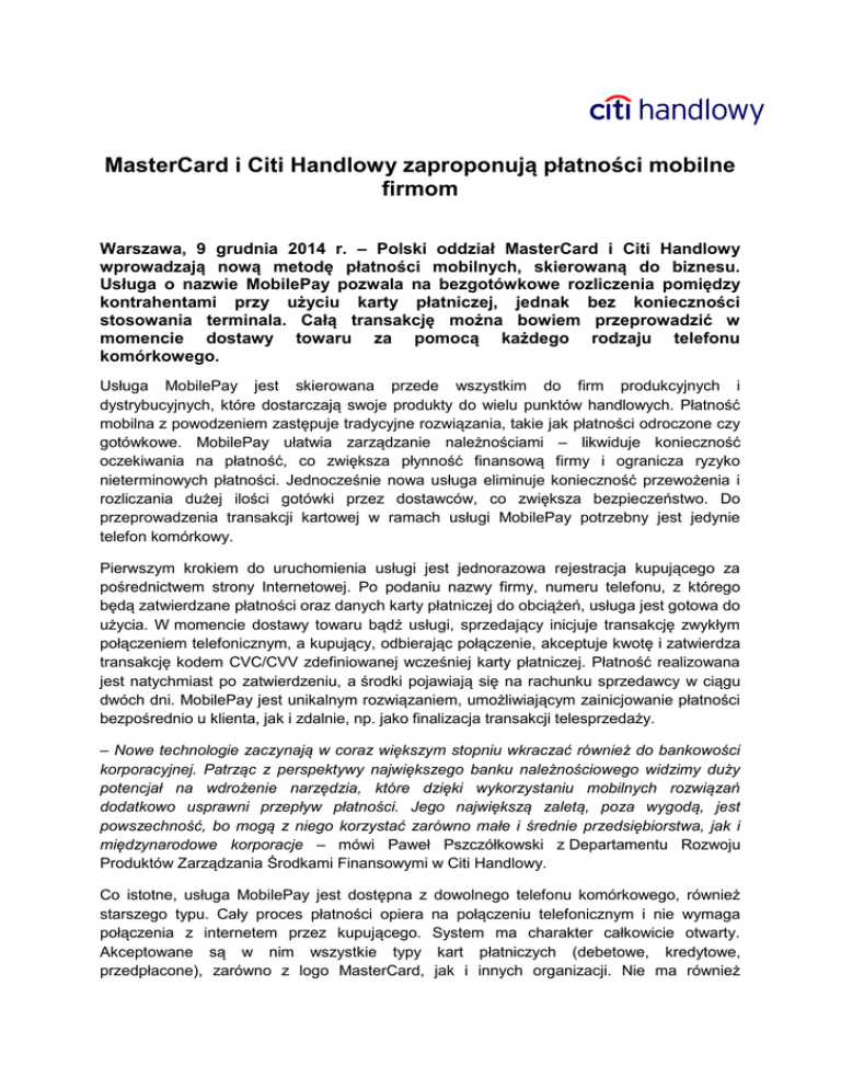 MasterCard i Citi Handlowy zaproponują płatności mobilne firmom Warszawa, 9 grudnia 2014 r. – Polski oddział MasterCard i Citi Handlowy wprowadzają nową metodę płatności mobilnych, skierowaną do biznesu. Usługa o nazwie MobilePay pozwala na bezgotówkowe rozliczenia pomiędzy kontrahentami przy użyciu karty płatniczej, jednak bez konieczności stosowania terminala. Całą transakcję można bowiem przeprowadzić w momencie dostawy towaru za pomocą każdego rodzaju telefonu komórkowego. Usługa MobilePay jest skierowana przede wszystkim do firm produkcyjnych i dystrybucyjnych, które dostarczają swoje produkty do wielu punktów handlowych. Płatność mobilna z powodzeniem zastępuje tradycyjne rozwiązania, takie jak płatności odroczone czy gotówkowe. MobilePay ułatwia zarządzanie należnościami – likwiduje konieczność oczekiwania na płatność, co zwiększa płynność finansową firmy i ogranicza ryzyko nieterminowych płatności. Jednocześnie nowa usługa eliminuje konieczność przewożenia i rozliczania dużej ilości gotówki przez dostawców, co zwiększa bezpieczeństwo. Do przeprowadzenia transakcji kartowej w ramach usługi MobilePay potrzebny jest jedynie telefon komórkowy. Pierwszym krokiem do uruchomienia usługi jest jednorazowa rejestracja kupującego za pośrednictwem strony Internetowej. Po podaniu nazwy firmy, numeru telefonu, z którego będą zatwierdzane płatności oraz danych karty płatniczej do obciążeń, usługa jest gotowa do użycia. W momencie dostawy towaru bądź usługi, sprzedający inicjuje transakcję zwykłym połączeniem telefonicznym, a kupujący, odbierając połączenie, akceptuje kwotę i zatwierdza transakcję kodem CVC/CVV zdefiniowanej wcześniej karty płatniczej. Płatność realizowana jest natychmiast po zatwierdzeniu, a środki pojawiają się na rachunku sprzedawcy w ciągu dwóch dni. MobilePay jest unikalnym rozwiązaniem, umożliwiającym zainicjowanie płatności bezpośrednio u klienta, jak i zdalnie, np. jako finalizacja transakcji telesprzedaży. – Nowe technologie zaczynają w coraz większym stopniu wkraczać również do bankowości korporacyjnej. Patrząc z perspektywy największego banku należnościowego widzimy duży potencjał na wdrożenie narzędzia, które dzięki wykorzystaniu mobilnych rozwiązań dodatkowo usprawni przepływ płatności. Jego największą zaletą, poza wygodą, jest powszechność, bo mogą z niego korzystać zarówno małe i średnie przedsiębiorstwa, jak i międzynarodowe korporacje – mówi Paweł Pszczółkowski z Departamentu Rozwoju Produktów Zarządzania Środkami Finansowymi w Citi Handlowy. Co istotne, usługa MobilePay jest dostępna z dowolnego telefonu komórkowego, również starszego typu. Cały proces płatności opiera na połączeniu telefonicznym i nie wymaga połączenia z internetem przez kupującego. System ma charakter całkowicie otwarty. Akceptowane są w nim wszystkie typy kart płatniczych (debetowe, kredytowe, przedpłacone), zarówno z logo MasterCard, jak i innych organizacji. Nie ma również ograniczeń co do wyboru banku – w MobilePay akceptowane są płatności kartami wydanymi przez każdy bank. - Cieszymy się, że wspólnie z bankiem Citi Handlowy możemy zaoferować tak innowacyjne rozwiązanie płatnicze firmom. Wierzymy, że możliwość poprawy płynności finansowej, ograniczenie ryzyka związanego z obsługą płatności gotówkowych, czy wreszcie zmniejszenie biurokracji związanej z płatnościami z odroczonym terminem, będą dobrymi argumentami przemawiającymi za tym, by polscy przedsiębiorcy docenili MobilePay jako optymalne narzędzie dla ich firm – mówi Tomasz Łuczak, odpowiedzialny w MasterCard za produkty dla firm w regionie CEE. Partnerami strategicznymi przedsięwzięcia są firmy eCard, odpowiedzialna za rozliczanie transakcji oraz CallPay, zapewniająca infrastrukturę techniczną. Rozwiązanie MobilePay opiera się na technologii MasterPass, globalnej platformy do płatności mobilnych, zbudowanej i rozwijanej przez MasterCard również w Polsce. – Chcemy być dla klientów korporacyjnych bankiem pierwszego wyboru w zakresie mobilnej obsługi należności. Jesteśmy przekonani, że MobilePay spotka się z dużym zainteresowaniem polskich przedsiębiorców – dodaje Paweł Pszczółkowski. *** O MasterCard Worldwide: MasterCard (NYSE:MA), www.mastercard.com jest firmą technologiczną działającą w globalnym obszarze płatności. Obsługujemy najszybszą światową sieć przetwarzania płatności, łączącą konsumentów, instytucje finansowe, punkty handlowo-usługowe, rządy i przedsiębiorstwa w ponad 210 krajach i terytoriach. Produkty i rozwiązania MasterCard ułatwiają codzienne funkcjonowanie działalności handlowej, takiej jak zakupy, podróże, prowadzenie firmy i zarządzanie finansami. Sprawiają, że są one bezpieczniejsze i sprawniejsze dla każdego użytkownika. Śledź nas na Twitterze @MasterCardNews, przyłącz się do dyskusji na CashlessPioneers Blog oraz zapisz się, aby otrzymywać najnowszy biuletyn od Engagement Bureau. Bank Handlowy w Warszawie SA to jedna z największych instytucji finansowych w Polsce, oferująca pod marką Citi Handlowy bogaty i nowoczesny asortyment produktów i usług bankowości korporacyjnej, inwestycyjnej i detalicznej. Bank Handlowy obsługuje 7,5 tys. klientów korporacyjnych i 776,5 tys. klientów indywidualnych poprzez nowoczesne kanały dystrybucji oraz sieć 60 oddziałów. W skład grupy kapitałowej Banku wchodzą takie podmioty jak: Dom Maklerski Banku Handlowego i Handlowy Leasing. Przynależność do Citigroup, największej na świecie instytucji finansowej, zapewnia klientom Banku Handlowego dostęp do usług finansowych w ponad 100 krajach. Citi (NYSE:C) to wiodąca globalna instytucja finansowa, mająca około 200 milionów klientów w ponad 140 krajach. Poprzez swoje dwie odrębne jednostki operacyjne: Citicorp i Citi Holdings, 