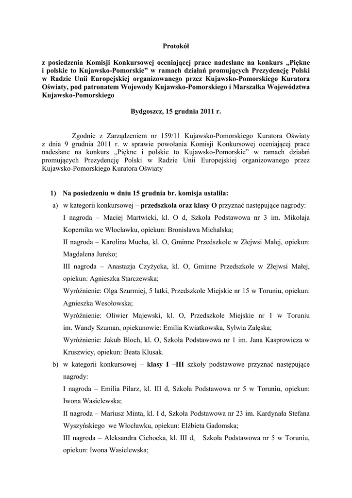 Protokół z posiedzenia Komisji Konkursowej oceniającej prace nadesłane na konkurs „Piękne i polskie to Kujawsko-Pomorskie” w ramach działań promujących Prezydencję Polski w Radzie Unii Europejskiej organizowanego przez Kujawsko-Pomorskiego Kuratora Oświaty, pod patronatem Wojewody Kujawsko-Pomorskiego i Marszałka Województwa Kujawsko-Pomorskiego Bydgoszcz, 15 grudnia 2011 r. Zgodnie z Zarządzeniem nr 159/11 Kujawsko-Pomorskiego Kuratora Oświaty z dnia 9 grudnia 2011 r. w sprawie powołania Komisji Konkursowej oceniającej prace nadesłane na konkurs „Piękne i polskie to Kujawsko-Pomorskie” w ramach działań promujących Prezydencję Polski w Radzie Unii Europejskiej organizowanego przez Kujawsko-Pomorskiego Kuratora Oświaty 1) Na posiedzeniu w dniu 15 grudnia br. komisja ustaliła: a) w kategorii konkursowej – przedszkola oraz klasy O przyznać następujące nagrody: I nagroda – Maciej Martwicki, kl. O d, Szkoła Podstawowa nr 3 im. Mikołaja Kopernika we Włocławku, opiekun: Bronisława Michalska; II nagroda – Karolina Mucha, kl. O, Gminne Przedszkole w Złejwsi Małej, opiekun: Magdalena Jureko; III nagroda – Anastazja Czyżycka, kl. O, Gminne Przedszkole w Złejwsi Małej, opiekun: Agnieszka Starczewska; Wyróżnienie: Olga Szurmiej, 5 latki, Przedszkole Miejskie nr 15 w Toruniu, opiekun: Agnieszka Wesołowska; Wyróżnienie: Oliwier Majewski, kl. O, Przedszkole Miejskie nr 1 w Toruniu im. Wandy Szuman, opiekunowie: Emilia Kwiatkowska, Sylwia Załęska; Wyróżnienie: Jakub Bloch, kl. O, Szkoła Podstawowa nr 1 im. Jana Kasprowicza w Kruszwicy, opiekun: Beata Klusak. b) w kategorii konkursowej – klasy I –III szkoły podstawowe przyznać następujące nagrody: I nagroda – Emilia Pilarz, kl. III d, Szkoła Podstawowa nr 5 w Toruniu, opiekun: Iwona Wasielewska; II nagroda – Mariusz Minta, kl. I d, Szkoła Podstawowa nr 23 im. Kardynała Stefana Wyszyńskiego we Włocławku, opiekun: Elżbieta Gadomska; III nagroda – Aleksandra Cichocka, kl. III d, opiekun: Iwona Wasielewska; Szkoła Podstawowa nr 5 w Toruniu, Wyróżnienie: Kamil Śliwa, kl. II, Zespół Szkół im. Kazimierza Górskiego w Dobrczu, opiekun Violetta Wasilewska; Wyróżnienie: Jan Kępiński, kl. II c, Szkoła Podstawowa nr 46 w Bydgoszczy, opiekun: Beata Stafiej; Wyróżnienie: Paweł Sawków, kl. I a, Szkoła Podstawowa nr 46 w Bydgoszczy, opiekun: Maria Strabel. c) w kategorii konkursowej – klasy IV – VI szkoły podstawowe przyznać następujące nagrody: I nagroda - Weronika Krajczyńska, kl. V a, Szkoła Podstawowa nr 2 w Golubiu Dobrzyniu, opiekun: Alicja Foksińska; II nagroda - Marta Kaczyńska, kl. VI b, Szkoła Podstawowa nr 8 w Toruniu, opiekun: Dorota Szymeczko; III nagroda – Kinga Racińska, kl. V, Szkoła Podstawowa im. Tadeusza Kościuszki w Nowogrodzie, opiekun: Maria Wrzesińska; Wyróżnienie: Katarzyna Niedziałkowska, kl. V d, Szkoła Podstawowa nr 23 im. Kardynała Stefana Wyszyńskiego we Włocławku, opiekun: Marzena Kopczyńska; Wyróżnienie: Maja Paprocka, kl. V d, Szkoła Podstawowa nr 2 w Golubiu Dobrzyniu, opiekun: Alicja Foksińska; Wyróżnienie: Katarzyna Helena Sopolińska, kl. VI e, Szkoła Podstawowa nr 11 im. Stefana Batorego w Inowrocławiu, opiekun: Ewa Klimaszewska. d) w kategorii konkursowej – gimnazja przyznać następujące nagrody: I nagroda – Bartosz Falkowski, kl. II, zespół edukacyjno-terapeutyczny, Specjalny Ośrodek Szkolno-Wychowawczy w Tucholi, opiekun: Wiesława Kłosowska; II nagroda – Lidia Ruczewska, kl. III, Zespół Szkół z Oddziałami Integracyjnymi im. Janusz Korczaka w Smólniku, opiekun: Krzysztof Jarębski; III nagroda – Dominika Bogdańska, kl. II b, Gimnazjum w Jeżewie, opiekun: Jolanta Piekarska; Wyróżnienie: Jakub Banaszak, kl. I, Gimnazjum Towarzystwa Salezjańskiego w Toruniu, opiekun: Małgorzata Zalewa; Wyróżnienie: Oktawia Kilanowska, kl. I a, Zespół Szkół z Oddziałami Integracyjnymi im. Polskich Noblistów w Kruszynie, opiekun: Dorota Ryniec-Kilanowska; Wyróżnienie: Roksana Gulan, kl. I b, Zespół Szkół nr 10 w Bydgoszczy, opiekun: Krzysztof Pałuczak. e) w kategorii konkursowej – szkoły ponadgimnazjalne przyznać następujące nagrody: I nagroda – Kamil Nejman, kl. IV TD, Zespól Szkół Elektrycznych we Włocławku, opiekun: Kamil Zapała; II nagroda – Karolina Lewandowska, kl. I b, VI Liceum Ogólnokształcące im. Zesłańców Sybiru w Toruniu, opiekun: Beata Papińska; III nagroda – nie przyznano. 2) Przyznano również nagrody: Nagrodę Specjalną Wojewody Kujawsko-Pomorskiego – Hubert Ruszkiewicz, kl. V, Publiczna Szkoła Podstawowa im . Powstańców Wielkopolskich w Wójcinie, opiekun: Dorota Jąkalska; Nagrodę Marszałka Województwa Kujawsko-Pomorskiego – Karolina Napieralska, kl. IIIb, Gimnazjum nr 2 im. Tadeusza Kościuszki w Chełmnie, opiekun: Janusz Murzyn; Nagrodę Główną Kujawsko-Pomorskiego Kuratora Oświaty – Hanna Wróblewska, kl. O, Publiczna Szkoła Podstawowa im . Powstańców Wielkopolskich w Wójcinie, opiekun: Danuta Myślińska. 3) Komisja Konkursowa wyróżniła dwie prace poza regulaminem: Stanisław Cuske, kl. III gimnazjum, Zespół Szkół nr 10 w Bydgoszczy, opiekun: Krzysztof Pałuczak; Jakub Korzeniewski, kl. VI b, Szkoła Podstawowa nr 23 im. Kardynała Stefana Wyszyńskiego we Włocławku, opiekun: Marzena Kopczyńska. 4) Komisja konkursowa oceniając prace kierowała się następującymi kryteriami: a) samodzielność przy wykonaniu folderu; b) zgodność z tematyką i formą; c) oryginalność; d) wykorzystanie różnych, w tym niekonwencjonalnych technik; e) wykorzystanie technologii informacyjnej; f) atrakcyjność przekazu pod względem estetycznym i technicznym; g) ciekawa kompozycja. 5) Wyniki zostaną opublikowane na stronie internetowej Kuratorium Oświaty w Bydgoszczy najpóźniej do 5 stycznia 2012 r. 6) Wręczenie nagród nastąpi w styczniu 2012 r. Konkretny dzień, godzina i miejsce zostaną podane na stronie