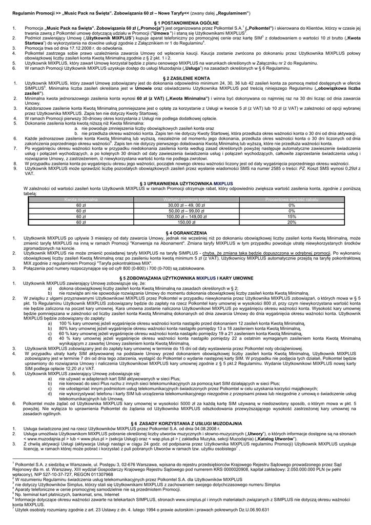 Promocja „Music Pack na Święta”. Zobowiązania 60 zł („Promocja”) jest organizowana przez Polkomtel S.A.1 („Polkomtel”) i skierowana do Klientów, którzy w czasie jej