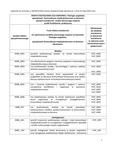 Załącznik do Uchwały nr 40/2015/2016 Senatu Akademickiego Ignatianum z dnia 23 maja 2016 roku EFEKTY KSZTAŁCENIA DLA KIERUNKU: Filologia angielska specjalność: Komunikacja międzykulturowa w biznesie poziom kształcenia: studia pierwszego stopnia profil kształcenia: praktyczny Treść efektu kształcenia Symbol efektu specjalnościowego Po ukończeniu studiów pierwszego stopnia na kierunku Filologia angielska, specjalność Komunikacja międzykulturowa w biznesie absolwent: KMB_W01 KMB_W02 KMB_W03 Wiedza posiada podstawową wiedzę na temat komunikacji międzykulturowej zna elementarne pojęcia i terminy związane z komunikacją międzykulturową w biznesie zna podstawowe zasady i terminologię z zakresu redakcji tekstów specjalistycznych Odniesienie do efektów kształcenia w obszarach kształcenia w zakresie nauk humanistycznych i społecznych H1P_W02 S1P_W02 H1P_W03 H1P_W02 H1P_W03 H1P_W02 KMB_W04 zna specyfikę różnych form wypowiedzi w języku angielskim w obszarze komunikacji biznesowej oraz wpływ decyzji stylistycznych na funkcję komunikacyjną tekstu KMB_W05 zna i rozumie podstawowe zasady i pojęcia z zakresu zarządzania konfliktem i negocjacji w wymiarze międzykulturowym H1P_W02 H1P_W03 H1P_W07 S1P_W04 KMB_W06 ma podstawową wiedzę na temat wybranych aspektów teorii organizacji ze szczególnym uwzględnieniem komunikacji międzykulturowej H1P_W02 H1P_W03 H1P_W05 KMB_W7 ma podstawową wiedzę na temat sposobów wykorzystania mediów społecznościowych w komunikacji międzykulturowej w biznesie H1P_W02 H1P_W04 H1P_W05 KMB_U01 KMB _U02 Umiejętności potrafi rozpoznać podstawowe rodzaje i style komunikacji międzykulturowej ze szczególnym uwzględnieniem specyfiki i profilu kulturowego krajów anglosaskich potrafi redagować teksty biznesowe w języku angielskim oraz korygować podstawowe błędy stylistyczno- retoryczne H1P_U03 H1P_U01 1 i argumentacyjne w wybranych tekstach anglojęzycznych H1P_U03 Potrafi inicjować, diagnozować błędy oraz usprawniać komunikację międzykulturową w kontekście biznesowym w formie ustnej i pisemnej z wykorzystaniem technik negocjacyjnych oraz zarządzania konfliktem H1P_U03 H1P_U04 H1P_U09 H1P_U10 KMB _U03 potrafi zredagować specjalistyczny tekst biznesowy w języku angielskim na potrzebę zróżnicowanych grup odbiorców H1P_U11 H1P_U01 H1P_U02 H1P_U11 H1P_U012 KMB _U04 potrafi wykorzystywać różne media społecznościowe w celu usprawnienia komunikacji w organizacji międzynarodowej S1P_U07 H1P_U01 H1P_U04 H1P_U11 KMB _K01 KMB _K02 KMB _K03 Kompetencje społeczne zachowuje otwartość na potrzebę pogłębiania zagadnień związanych z komunikacją międzykulturową w biznesie rozumie potrzebę dokształcania się i aktualizowania wiedzy przez całe życie uczestniczy w życiu społeczno-kulturalnym, korzystając z różnych mediów i różnych jego form z poszanowaniem prawa własności intelektualnej H1P_K01 H2P_K03 H2P_K04 H1P_K01 H1P_05 H1P_06 2