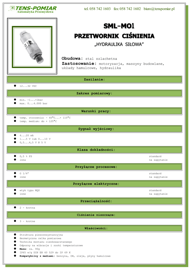 tel. 058 742 1603 fax: 058 742 1602 [email protected] SML-MO1 PRZETWORNIK CIŚNIENIA „HYDRAULIKA SIŁOWA” Obudowa: stal szlachetna Zastosowanie: motoryzacja, maszyny budowlane, układy hamulcowe, hydraulika Zasilanie: ● 12...32 VDC Zakres pomiarowy: ● ● min. -1...+1bar max. 0...4.000 bar Warunki pracy: ● ● temp. otoczenia: - 40°C...+ 110°C temp. medium: do + 125°C Sygnał wyjściowy: ● ● ● 4...20 mA 1...5 V lub 0...10 V 0,5...4,5 V @ 5 V Klasa dokładności: ● ● 0,5 % FS inna standard na zapytanie Przyłącze procesowe: ● ● G 1/4” inne standard na zapytanie Przyłącze elektryczne: ● ● wtyk typu MQS inne standard na zapytanie Przeciążalność: ● 2 - krotna Ciśnienie niszczące: ● 3 – krotne Właściwości: ● ● ● ● ● ● ● Struktura piezorezystancyjna Hermetyczna celka pomiarowa Technika montażu cienkowarstwowego Odporny na wibracje i szoki temperaturowe Masa: ca. 90g IP65 w/g DIN EN 60 529 do IP 69 K Kompatybilny z mediami: benzyna, ON, oleje, płyny hamulcowe