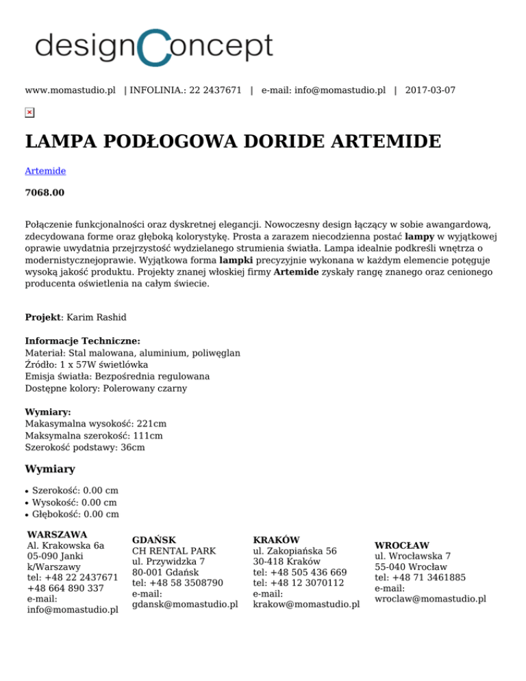 www.momastudio.pl | INFOLINIA.: 22 2437671 | e-mail: [email protected] | 2017-03-07 LAMPA PODŁOGOWA DORIDE ARTEMIDE Artemide 7068.00 Połączenie funkcjonalności oraz dyskretnej elegancji. Nowoczesny design łączący w sobie awangardową, zdecydowana forme oraz głęboką kolorystykę. Prosta a zarazem niecodzienna postać lampy w wyjątkowej oprawie uwydatnia przejrzystość wydzielanego strumienia światła. Lampa idealnie podkreśli wnętrza o modernistycznejoprawie. Wyjątkowa forma lampki precyzyjnie wykonana w każdym elemencie potęguje wysoką jakość produktu. Projekty znanej włoskiej firmy Artemide zyskały rangę znanego oraz cenionego producenta oświetlenia na całym świecie. Projekt: Karim Rashid Informacje Techniczne: Materiał: Stal malowana, aluminium, poliwęglan Źródło: 1 x 57W świetlówka Emisja światła: Bezpośrednia regulowana Dostępne kolory: Polerowany czarny Wymiary: Makasymalna wysokość: 221cm Maksymalna szerokość: 111cm Szerokość podstawy: 36cm Wymiary ● ● ● Szerokość: 0.00 cm Wysokość: 0.00 cm Głębokość: 0.00 cm WARSZAWA Al. Krakowska 6a 05-090 Janki k/Warszawy tel: +48 22 2437671 +48 664 890 337 e-mail: [email protected] GDAŃSK CH RENTAL PARK ul. Przywidzka 7 80-001 Gdańsk tel: +48 58 3508790 e-mail: [email protected] KRAKÓW ul. Zakopiańska 56 30-418 Kraków tel: +48 505 436 669 tel: +48 12 3070112 e-mail: [email protected] WROCŁAW ul. Wrocławska 7 55-040 Wrocław tel: +48 71 3461885 e-mail: [email protected]