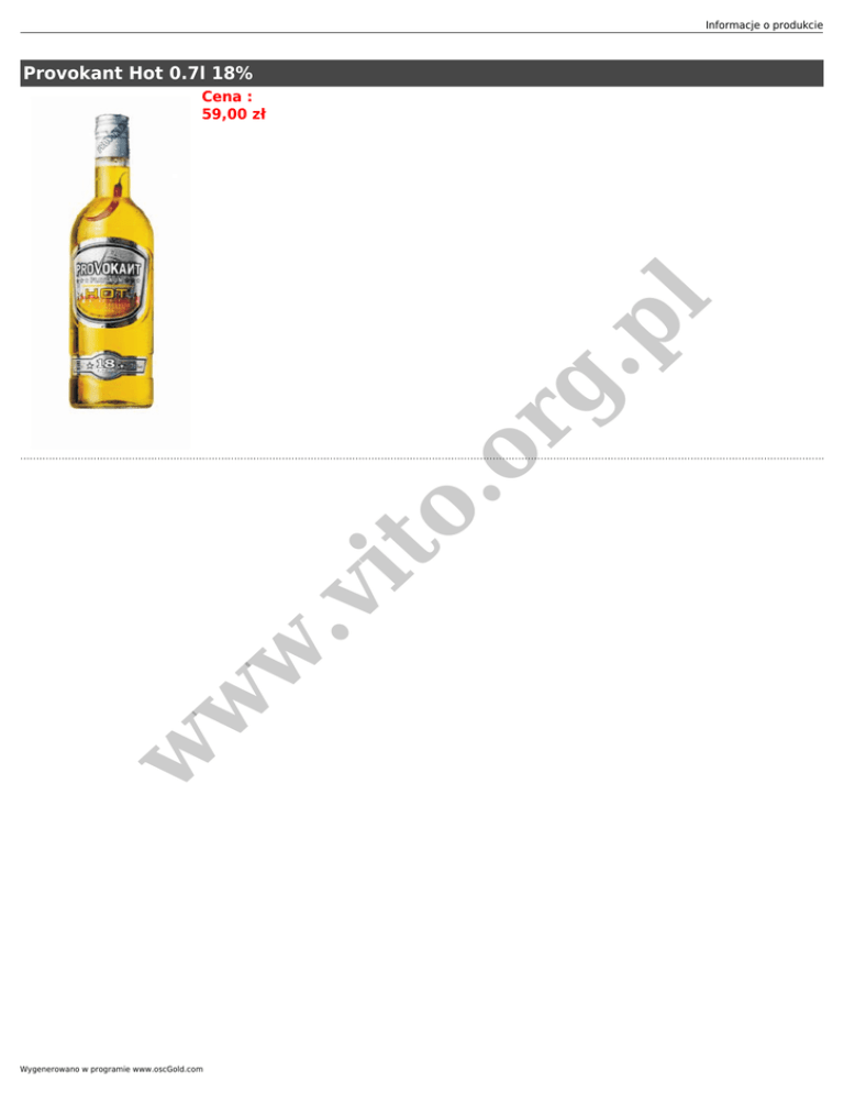 Informacje o produkcie Provokant Hot 0.7l 18% w w w .v it o. or g. pl Cena : 59,00 zł Wygenerowano w programie www.oscGold.com Hot Cosmo 30 ml wódki Provokant Hot 10 ml Triple Sec 10 ml soku z limonki 30 ml soku żurawinowego 1 plasterek limonki Wymieszaj w shakerze i podawaj w szklance koktajlowej, wyciśnij do szklanki plasterek limonki. w .v it o. or g. pl Hotini 20 ml wódki Provokant Hot 40 ml Ginu 1 oliwka Wymieszaj w shakerze i podawaj w szklance koktajlowej, udekoruj oliwką . w w Hot Provokant Sex 30 ml wódki Provokant Hot 20 ml likieru brzoskwiniowego 40 ml soku pomarańczowego 80 ml soku żurawinowego Wymieszaj w shakerze i podawaj w wysokiej szklance z lodem i słomką . Hot Game 30 ml wódki Provokant Hot 10 ml likieru brzoskwiniowego 20 ml zielonego banana 20 ml soku cytrynowego 80 ml soku ananasowego Wymieszaj w shakerze i podawaj w wysokiej szklance z lodem i słomką .