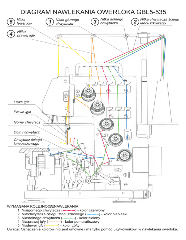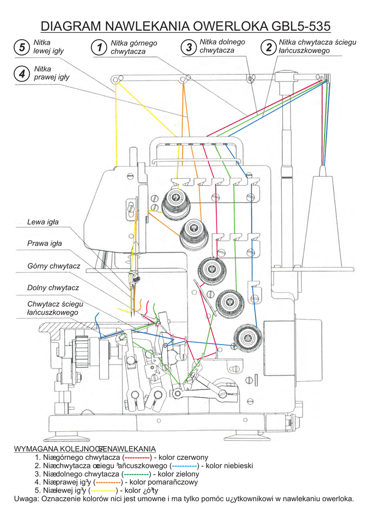 DIAGRAM NAWLEKANIA OWERLOKA GBL5-535 5 Nitka lewej ig³y 4 Nitka prawej ig³y 1 Nitka górnego chwytacza 3 Nitka dolnego chwytacza 2 Nitka chwytacza œciegu ³añcuszkowego Lewa ig³a Prawa ig³a Górny chwytacz Dolny chwytacz Chwytacz œciegu ³añcuszkowego WYMAGANA KOLEJNOŒÆ NAWLEKANIA 1. Niæ górnego chwytacza (----------) - kolor czerwony 2. Niæ chwytacza œciegu ³añcuszkowego (----------) - kolor niebieski 3. Niæ dolnego chwytacza (----------) - kolor zielony 4. Niæ prawej ig³y (----------) - kolor pomarañczowy 5. Niæ lewej ig³y (----------) - kolor ¿ó³ty Uwaga: Oznaczenie kolorów nici jest umowne i ma tylko pomóc u¿ytkownikowi w nawlekaniu owerloka.