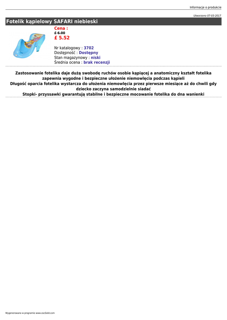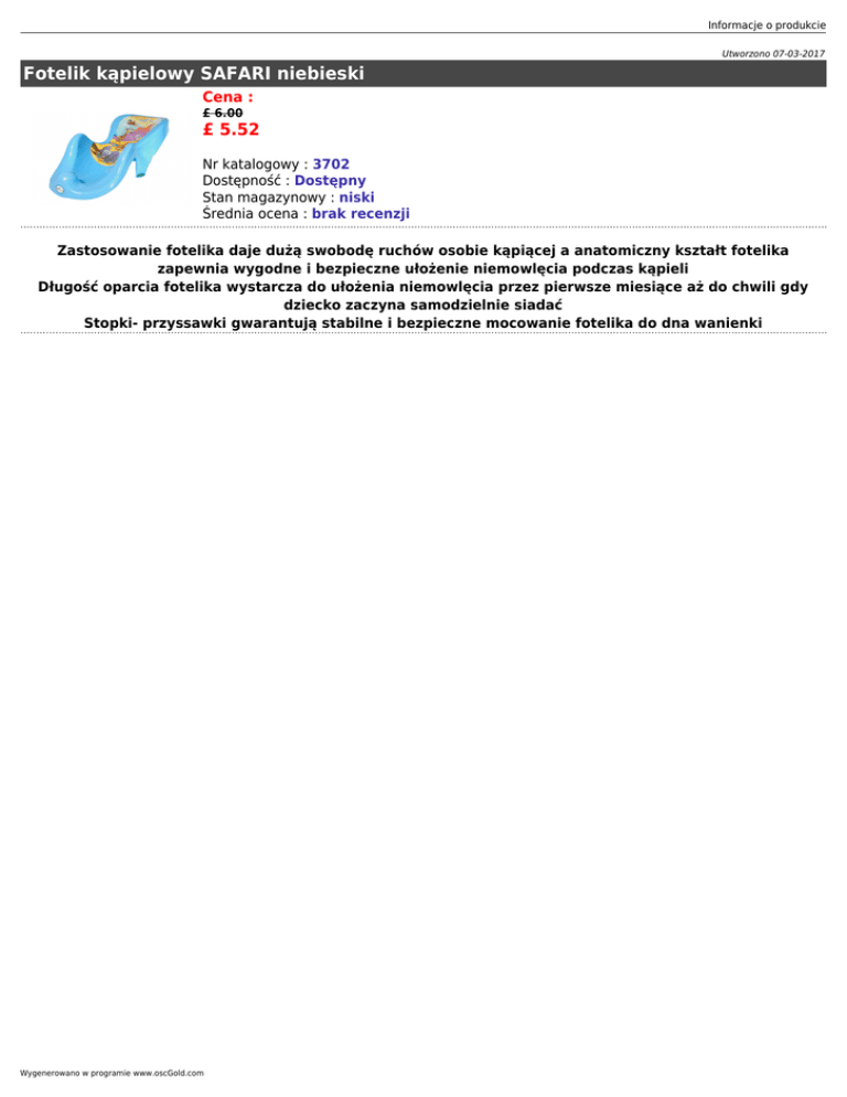 Informacje o produkcie Utworzono 07-03-2017 Fotelik kąpielowy SAFARI niebieski Cena : £ 6.00 £ 5.52 Nr katalogowy : 3702 Dostępność : Dostępny Stan magazynowy : niski Średnia ocena : brak recenzji Zastosowanie fotelika daje dużą swobodę ruchów osobie kąpiącej a anatomiczny kształt fotelika zapewnia wygodne i bezpieczne ułożenie niemowlęcia podczas kąpieli Długość oparcia fotelika wystarcza do ułożenia niemowlęcia przez pierwsze miesiące aż do chwili gdy dziecko zaczyna samodzielnie siadać Stopki- przyssawki gwarantują stabilne i bezpieczne mocowanie fotelika do dna wanienki Wygenerowano w programie www.oscGold.com