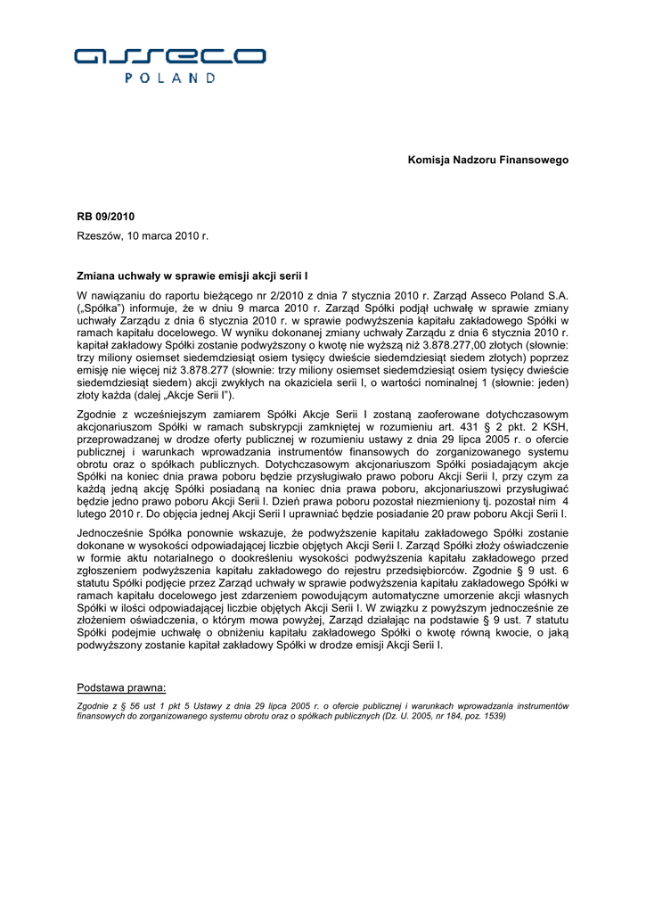 Komisja Nadzoru Finansowego RB 09/2010 Rzeszów, 10 marca 2010 r. Zmiana uchwały w sprawie emisji akcji serii I W nawiązaniu do raportu bieżącego nr 2/2010 z dnia 7 stycznia 2010 r. Zarząd Asseco Poland S.A. („Spółka”) informuje, że w dniu 9 marca 2010 r. Zarząd Spółki podjął uchwałę w sprawie zmiany uchwały Zarządu z dnia 6 stycznia 2010 r. w sprawie podwyższenia kapitału zakładowego Spółki w ramach kapitału docelowego. W wyniku dokonanej zmiany uchwały Zarządu z dnia 6 stycznia 2010 r. kapitał zakładowy Spółki zostanie podwyższony o kwotę nie wyższą niż 3.878.277,00 złotych (słownie: trzy miliony osiemset siedemdziesiąt osiem tysięcy dwieście siedemdziesiąt siedem złotych) poprzez emisję nie więcej niż 3.878.277 (słownie: trzy miliony osiemset siedemdziesiąt osiem tysięcy dwieście siedemdziesiąt siedem) akcji zwykłych na okaziciela serii I, o wartości nominalnej 1 (słownie: jeden) złoty każda (dalej „Akcje Serii I”). Zgodnie z wcześniejszym zamiarem Spółki Akcje Serii I zostaną zaoferowane dotychczasowym akcjonariuszom Spółki w ramach subskrypcji zamkniętej w rozumieniu art. 431 § 2 pkt. 2 KSH, przeprowadzanej w drodze oferty publicznej w rozumieniu ustawy z dnia 29 lipca 2005 r. o ofercie publicznej i warunkach wprowadzania instrumentów finansowych do zorganizowanego systemu obrotu oraz o spółkach publicznych. Dotychczasowym akcjonariuszom Spółki posiadającym akcje Spółki na koniec dnia prawa poboru będzie przysługiwało prawo poboru Akcji Serii I, przy czym za każdą jedną akcję Spółki posiadaną na koniec dnia prawa poboru, akcjonariuszowi przysługiwać będzie jedno prawo poboru Akcji Serii I. Dzień prawa poboru pozostał niezmieniony tj. pozostał nim 4 lutego 2010 r. Do objęcia jednej Akcji Serii I uprawniać będzie posiadanie 20 praw poboru Akcji Serii I. Jednocześnie Spółka ponownie wskazuje, że podwyższenie kapitału zakładowego Spółki zostanie dokonane w wysokości odpowiadającej liczbie objętych Akcji Serii I. Zarząd Spółki złoży oświadczenie w formie aktu notarialnego o dookreśleniu wysokości podwyższenia kapitału zakładowego przed zgłoszeniem podwyższenia kapitału zakładowego do rejestru przedsiębiorców. Zgodnie § 9 ust. 6 statutu Spółki podjęcie przez Zarząd uchwały w sprawie podwyższenia kapitału zakładowego Spółki w ramach kapitału docelowego jest zdarzeniem powodującym automatyczne umorzenie akcji własnych Spółki w ilości odpowiadającej liczbie objętych Akcji Serii I. W związku z powyższym jednocześnie ze złożeniem oświadczenia, o którym mowa powyżej, Zarząd działając na podstawie § 9 ust. 7 statutu Spółki podejmie uchwałę o obniżeniu kapitału zakładowego Spółki o kwotę równą kwocie, o jaką podwyższony zostanie kapitał zakładowy Spółki w drodze emisji Akcji Serii I. Podstawa prawna: Zgodnie z § 56 ust 1 pkt 5 Ustawy z dnia 29 lipca 2005 r. o ofercie publicznej i warunkach wprowadzania instrumentów finansowych do zorganizowanego systemu obrotu oraz o spółkach publicznych (Dz. U. 2005, nr 184, poz. 1539)