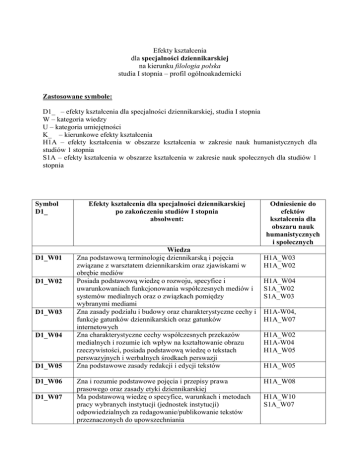 Efekty kształcenia dla specjalności dziennikarskiej na kierunku filologia polska studia I stopnia – profil ogólnoakademicki Zastosowane symbole: D1_ – efekty kształcenia dla specjalności dziennikarskiej, studia I stopnia W – kategoria wiedzy U – kategoria umiejętności K_ – kierunkowe efekty kształcenia H1A – efekty kształcenia w obszarze kształcenia w zakresie nauk humanistycznych dla studiów 1 stopnia S1A – efekty kształcenia w obszarze kształcenia w zakresie nauk społecznych dla studiów 1 stopnia Symbol D1_ D1_W01 D1_W02 D1_W03 D1_W04 D1_W05 D1_W06 D1_W07 Efekty kształcenia dla specjalności dziennikarskiej po zakończeniu studiów I stopnia absolwent: Wiedza Zna podstawową terminologię dziennikarską i pojęcia związane z warsztatem dziennikarskim oraz zjawiskami w obrębie mediów Posiada podstawową wiedzę o rozwoju, specyfice i uwarunkowaniach funkcjonowania współczesnych mediów i systemów medialnych oraz o związkach pomiędzy wybranymi mediami Zna zasady podziału i budowy oraz charakterystyczne cechy i funkcje gatunków dziennikarskich oraz gatunków internetowych Zna charakterystyczne cechy współczesnych przekazów medialnych i rozumie ich wpływ na kształtowanie obrazu rzeczywistości, posiada podstawową wiedzę o tekstach perswazyjnych i werbalnych środkach perswazji Zna podstawowe zasady redakcji i edycji tekstów Zna i rozumie podstawowe pojęcia i przepisy prawa prasowego oraz zasady etyki dziennikarskiej Ma podstawową wiedzę o specyfice, warunkach i metodach pracy wybranych instytucji (jednostek instytucji) odpowiedzialnych za redagowanie/publikowanie tekstów przeznaczonych do upowszechniania Odniesienie do efektów kształcenia dla obszaru nauk humanistycznych i społecznych H1A_W03 H1A_W02 H1A_W04 S1A_W02 S1A_W03 H1A-W04, H1A_W07 H1A_W02 H1A-W04 H1A_W05 H1A_W05 H1A_W08 H1A_W10 S1A_W07 D1_U01 D1_U02 D1_U03 D1_U04 D1_U05 D1_U06 D1_U07 Umiejętności Potrafi scharakteryzować i porównać współczesne media i różne systemy medialne, uwzględniając ich specyfikę oraz społeczno – polityczne uwarunkowania funkcjonowania mediów Potrafi analizować i interpretować teksty medialne; rozpoznać gatunki dziennikarskie i podstawowe gatunki internetowe, wskazać charakterystyczne cechy (gatunkowe, stylistyczne, językowe) i funkcje tekstów medialnych Potrafi zredagować i edytować teksty realizujące wzorce wybranych, dziennikarskich gatunków informacyjnych i publicystycznych, zredagować teksty perswazyjne oraz teksty internetowe, a także zaprojektować makietę gazety i prosty portal internetowy Potrafi wyszukać, w tekstach medialnych potrzebne informacje, odróżniając je od opinii i ocen Przestrzega przepisów prawa prasowego oraz zasad etyki dziennikarskiej, stosuje się do reguł zawodowych poznanych w trakcie praktyki Potrafi skutecznie porozumiewać się przy użyciu różnych kanałów i technik komunikacyjnych oraz współpracuje ze specjalistami w zakresie mediów Potrafi opracować i zaprezentować wybrane zagadnienie dotyczące mediów i komunikacji medialnej (tekstów medialnych) H1A_U09 S1A_U03 H1A_U01, H1A_U05 S1A_U03 H1A_U01 H1A_U06 H1A_U08 H1A_U01 S1A_U05 S1A_U06 H1A_U07 H1A_U03 H1A_U08 H1A_U09 Efekty kształcenia dla specjalności dziennikarskiej na kierunku filologia polska studia II stopnia – profil ogólnoakademicki Zastosowane symbole: D2_ – efekty kształcenia dla specjalności dziennikarskiej, studia II stopnia W – kategoria wiedzy U – kategoria umiejętności K_ – kierunkowe efekty kształcenia H2A – efekty kształcenia w obszarze kształcenia w zakresie nauk humanistycznych dla studiów 2 stopnia S2A – efekty kształcenia w obszarze kształcenia w zakresie nauk społecznych dla studiów 2 stopnia Symbol D2_ D2_W01 Efekty kształcenia dla specjalności dziennikarskiej po zakończeniu studiów II stopnia na kierunku filologia polska absolwent: Wiedza Zna terminologię związaną z warsztatem dziennikarskim oraz komunikacją medialną, w tym reklamą Odniesienie do efektów kształcenia dla obszaru nauk humanistycznych i społecznych H2A_W03 D2_W02 Zna organizację i metody pracy redakcji, etapy powstawania i zasady redagowania tekstów dziennikarskich, prasowych i internetowych oraz specyfikę tworzenia przekazów medialnych w wybranej instytucji, zna sposoby ich upowszechniania i zasady współpracy z mediami H2A_W10 S2A_W02, S2A_W03 D2_W03 Zna i rozumie zasady publikacji tekstów oraz zarządzania informacją i własnością intelektualną H2A_W08 S2A_W10 D2_W04 Zna i rozumie mechanizmy zachodzące w obrębie H2A_W04 wypowiedzi publicznych, oddziaływanie tekstów H2A_W05 medialnych na kulturę oraz kulturowe uwarunkowania treści, S2A_W04 stylu i języka przekazów medialnych D2_W05 Zna wyróżniki gatunkowe, cechy kompozycji, stylu i języka dziennikarskich gatunków prasowych i gatunków internetowych; zna sposoby kształtowania tekstów medialnych stosownie do potrzeb komunikacyjnych H2A_W04 H2A_W05, H2A_W07 D2_U01 D2_U02 D2_U03 D2_U04 D2_U05 D2_U06 D2_U07 Umiejętności Potrafi porozumiewać się i osiągać zamierzone cele komunikacyjne, wykorzystując wiedzę o mediach i komunikacji medialnej Potrafi wnikliwie analizować i interpretować teksty medialne, rozpoznając ich cechy gatunkowe, wskazując funkcje oraz uwarunkowania społeczne i kulturowe Potrafi tworzyć teksty (przekazy) medialne, w tym redagować teksty realizujące wzorce dziennikarskich gatunków prasowych i gatunków internetowych oraz ich wariantów, z zastosowaniem rozmaitych kanałów komunikacyjnych Potrafi wyszukać, analizować, oceniać, selekcjonować i wykorzystywać oraz integrować informacje z tekstów (przekazów) medialnych a także formułować na tej podstawie krytyczne sądy, potrafi zaplanować i przeprowadzić kampanię promocyjną Posiada umiejętność formułowania opinii krytycznych dotyczących współczesnych mediów i tekstów medialnych, w tym opinii na temat ukazywanego w tekstach m