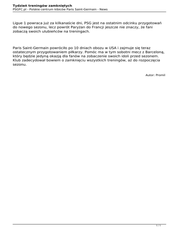 Tydzień treningów zamkniętych PSGFC.pl - Polskie centrum kibiców Paris Saint-Germain - News Ligue 1 powraca już za kilkanaście dni, PSG jest na ostatnim odcinku przygotowań do nowego sezonu, lecz powrót Paryżan do Francji jeszcze nie znaczy, że fani zobaczą swoich ulubieńców na treningach. Paris Saint-Germain powróciło po 10 dniach obozu w USA i zajmuje się teraz ostatecznym przygotowaniem piłkarzy. Pomóc ma w tym sobotni mecz z Barceloną, który będzie jedyną okazją dla fanów na zobaczenie swoich idoli przed sezonem. Klub zadecydował bowiem o zamknięciu wszystkich treningów, aż do rozpoczęcia sezonu. Autor: Promil 1/1 Powered by TCPDF (www.tcpdf.org)