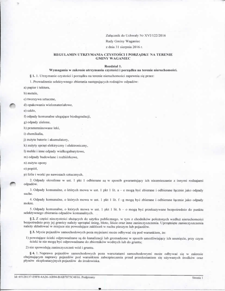 • . . Za}4cznikdoUchwatyNrXVyi22/2016 Rady Gminy Waganiec . '. z dnia 31 sierpnia 2016 r. ^• REGULAMIN UTRZYMANIA C Z Y S T O S C I I P O R Z ^ D K U NA T E R E N I E GMINY WAGANIEC Rozdzial 1. Wymagania w zakresie utrzymania czystosci i porzqdku na terenie nieruchomosci. § 1. 1. Utrzymanie czystosci i porz^dku na terenie nieruchomosci zapewnia si? przez: 1. Prowadzenie selektywnego zbierania nast^puj^cych rodzajow odpadow: a) papier i tektura, b) metale, . • c) tworzywa sztuczne, ; . ] ." d) opakowania wielomaterialowe, e) szklo, f) odpady komunalne ulegaj^ce biodegradacji, . ' g) odpady zielone, h) przeterminowane leki, i) chemikalia, . • . j) zuzyte baterie i akumulatory, k) zuzyty sprz?t elektryczny i elektroniczny, 1) meble i inne odpady wielkogabarytowe, m) odpady budowlane i rozbiorkqwe, n) zuzyte opony ' o) popiot, p) folic i worki po nawozach sztucznych, 2. Odpady okreslone w ust. 1 pkt 1 odbierane s^ w spos6b gwarantuj^cy ich niezmieszanie z innymi rodzajami odpadow. 3. Odpady komunalne, o ktorych mowa w ust. 1 pkt 1 lit. a - e mog^ bye zbierane i odbierane l^cznie jako odpady suche. 4. Odpady komunalne, o ktorych mowa w ust. 1 pkt 1 lit. f -g mog^ bye zbierane i odbierane l^cznie jako odpady mokre. 5. Odpady komunalne, o ktorych mowa w ust. 1 pkt 1 lit. h - o mog^ bye przekazywane bezposrednio do punktu selektywnego zbierania odpadow komunalnych. . § 2. Z cz?sci nieczystosci stuz^cych do uzytku publicznego, w tym z chodnikow polozonych wzdhiz nieruchomosci bezposrednio przy jej granicy nalezy uprz^tac snieg, btoto, liscie oraz inne zanieczyszczenia. Uprz^tni^te zanieczyszczenia nalezy skladowac w miejsce nie powodujqce zakloceii w ruchu pieszym lub pojazdow. § 3. Mycie pojazdow samochodowych poza myjniami moze odbywac si? pod warunkiem, ze: 1) powstajace scieki odprowadzane s^ do kanalizacji lub gromadzone w sposob umozliwiaj^cy ich usuni?cie, przy czym scieki te nie mog^ bye odprowadzane do zbiomikow wodnych lub do gruntu; 2) nie spowoduj^ zanieczyszczen wod i gruntu. § 4 . l.Naprawa pojazdow samochodowych poza warsztatami samochodowymi moze odbywac si? w zakresie obejmuj^cym naprawy pojazdow pod warunkiem zabezpieczenia przed przedostaniem si? uzywanych srodkow oraz plynow eksploatacyjnych pojazdow do srodowiska. Id: 65128137-E9F8-4A26-AB94-BAB7875C4816. Podpisany Strona 1 . 2. Zuzyte cz?sci samochodowe sktadowac w odpowiednich pojemnikach. - •;; Rozdzial 2. Rodzaje i minimalna pojemnosc pojemnikow przeznaczonych do zbierania odpadow komunalnych na terenie nieruchomosci oraz na drogach publicznych, warunki rozmieszczania tych urz^dzen i ich utrzymywania w odpowiednim stanie sanitarnym, porz^dkowym i technicznym. . § 5. Niesegregowane (zmieszane) odpady komunalne, gromadzone sq w pojemnikach o pojemnosci wynosz^cej minimum: 1) 101/ 1 mieszkanca/ tydzieri, jednak co najmniej jeden pojemnik 120 litrow na kazd^ nieruchomosc zamieszkal^; 2) 3 1/1 dziecko, ucznia, pracownika/ 1 tydzieri w zlobkach, przedszkolach, szkotach, jednak co najmniej jeden pojemnik 120 litrow; 3) 10 1/ 1 pracownika/ 1 tydzieri w zakladach rzemieslniczych, ushigowych, produkcyjnych, biurach, urz^dach, przychodniach, jednak co najmniej jeden pojemnik 120 litrow na taka nieruchomosc; 4) 15 1/ 1 miejsce konsumpcyjne / 1 tydzieri w lokalach gastronomicznych jednak co najmniej jeden pojemnik 120 litrow; 5) 15 1/ 1 lozko/ 1 tydzieri w hotelach, gospodarstwach agroturystycznych, jednak co najmniej jeden pojemnik 120 litrow; 6) 15 1/ 1 dzialk?/ 1 tydzieri w ogrodach dzialkowych w okresie od 1 marca do 31 pazdziemika kazdego roku, poza tym okresem minimalna pojemnosc pojemnikow winna bye dostosowana do ilosci powstaj^cych odpadow, jednak co najmniej jeden pojemnik 120 litrow; 7) 20 1/ 1 pracownika/ 1 tydzieri w stacjonamych punktach handlowych, jednak co najmniej jeden pojemnik 120 litrow. § 6. Odpady zbierane selektywnie, o ktorych mowa w § 1 ust. 1 pkt 1 lit. a - g, zbierane s^ w pojemnikach, workach lub kontenerach o minimalnej pojemnosci 60 litrow, z zastosowaniem wymagari okreslonych w § 4, o pojemnosciach zapewniaj^cych zbieranie wszystkich odpadow z terenu nieruchomosci przez okres mi?dzy kolejnymi odbiorami. § 7. Dla potrzeb selektywnej zbiorki odpadow stosuje si? oznakowania pojemnikow lub workow do zbierania odpadow komunalnych z umieszczonym oznakowaniem okreslaj^cym rodzaj gromadzonego wewn^trz odpadu. § 8. Standardy utrzymania pojemnikow do zbierania odpadow komimalnych oraz miejsc zbierania i gromadzenia odpadow: 1) utrzymywania pojemnikow do zbierania odpadow komunalnych w stanie czystosci poprzez mycie w razie potrzeby; 2) pojemniki do zbierania odpadow komunalnych powinny bye nieuszkodzone szczelne i bezpieczne; 3) okresowo nalezy dezynfekowac pojemniki na odpady. § 9 . l . N a terenie nieruchomosci pojemniki do zbierania odpadow komunalnych nalezy ustawic w miejscu wyodr?bnionym, dost?pnym dla przedsi?biorcy uprawnionego do odbierania odpadow komunalnych. 2. W przypadku, gdy niemozliwe jest ustawienie pojemnika do zbierania odpadow komunalnych na wtasnej nieruchomosci dopuszcza si? ich ustawienie na innej nieruchomosci, polozonej w niedalekim s^iedztwie. 3. Wyselekcjonowane odpady budowlane musz^ bye ztozone w odpowiednich umozliwiaj^cym dojazd. pojemnikach, w miejscu § 10. 1. Drogi i place publiczne powinny bye wyposazone w kosze uliczne o pojemnosci co najmniej 10 I . 2. Kosze uliczne powinny bye: 1) rozmieszczone w sposob umozliwiaj^cy bezpieczne i wygodne korzystanie z nich przez uzytkownikow. 2) ustawione w miejscach, ktore nie powodujg zagrozenia dla ruchu pojazdow i pieszych oraz umozliwiaj^cych ich oproznianie. 3) rozmieszczone w odpowiedniej ilosci. Rozdzial 3. Cz?stotliwo$c i sposob pozbywania si? odpadow komunalnych i nieczystosci cieklych z terenu nieruchomosci oraz z terenow przeznaczonych do wspolnego uzytku publicznego. § 11. 1. Odpady niesegregowane (zmieszane) oraz odpady pozostate po wyselekcjonowaniu odpadow suchych nalezy zbierac w pojemnikach do zbierania