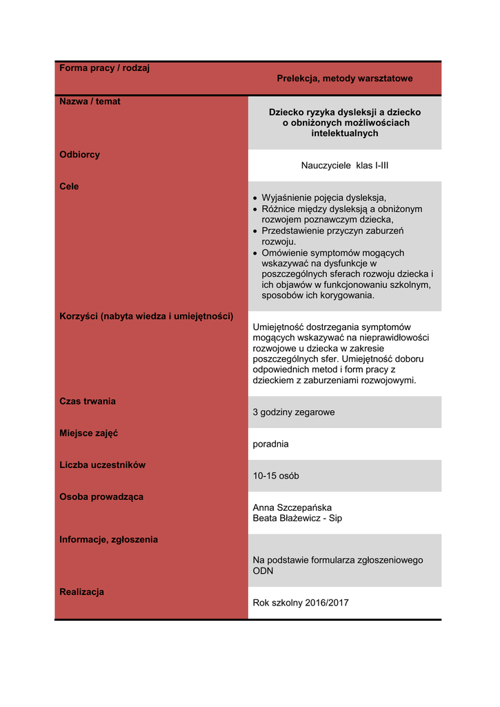 Forma pracy / rodzaj Prelekcja, metody warsztatowe Nazwa / temat Dziecko ryzyka dysleksji a dziecko o obniżonych możliwościach intelektualnych Odbiorcy Nauczyciele klas I-III Cele Wyjaśnienie pojęcia dysleksja, Różnice między dysleksją a obniżonym rozwojem poznawczym dziecka, Przedstawienie przyczyn zaburzeń rozwoju. Omówienie symptomów mogących wskazywać na dysfunkcje w poszczególnych sferach rozwoju dziecka i ich objawów w funkcjonowaniu szkolnym, sposobów ich korygowania. Korzyści (nabyta wiedza i umiejętności) Umiejętność dostrzegania symptomów mogących wskazywać na nieprawidłowości rozwojowe u dziecka w zakresie poszczególnych sfer. Umiejętność doboru odpowiednich metod i form pracy z dzieckiem z zaburzeniami rozwojowymi. Czas trwania 3 godziny zegarowe Miejsce zajęć poradnia Liczba uczestników 10-15 osób Osoba prowadząca Anna Szczepańska Beata Błażewicz - Sip Informacje, zgłoszenia Na podstawie formularza zgłoszeniowego ODN Realizacja Rok szkolny 2016/2017 Forma pracy / rodzaj Warsztaty z elementem prelekcji multimedialnej. Nazwa / temat Jak pomóc uczniom w trafnym wyborze zawodu uwzględniając nową reformą szkolnictwa ponadgimnazjalnego ? Odbiorcy Cele Korzyści (nabyta wiedza i umiejętności) Wychowawcy uczniów klas gimnazjalnych/ szkolni doradcy zawodowi Praktyczne poznanie technik i metod diagnozy predyspozycji zawodowych wychowanków, Poznanie trendów na rynku pracy, Zapoznanie z nową podstawą kształcenia ponadgimnazjalnego. Posiadają wiedzę o aktualnym rynku pracy, Znają możliwe kierunki dalszego kształcenia po ukończeniu gimnazjum, Posiadają informacje o aktualnej ofercie kształcenia ponadgimnazjalnego w rejonie, Posiadają narzędzia do określania predyspozycji i preferencji zawodowych wychowanków, Czas trwania 4 godziny lekcyjne Miejsce zajęć Poradnia (może być przez ODN) Liczba uczestników Według zgłoszeń Osoba prowadząca Anna Szczepańska Informacje, zgłoszenia Sekretariat/ osobiście u osoby prowadzącej Realizacja Luty 2017 Forma pracy / rodzaj Wykład, studium przypadku Nazwa / temat „Ryzyko dysleksji. Problemy i wstępne diagnozowanie – dziecko małe (3-4 lata)”. Odbiorcy Nauczyciele wychowania przedszkolnego grup 3 - 4 latki Cele Świadomość potrzeby wczesnego rozpoznawania ryzyka dysleksji u dziecka. Znajomość przyczyn i uwarunkowań ryzyka dysleksji. Znajomość symptomów ryzyka dysleksji u małego dziecka. Wymiana doświadczeń w pracy z małym dzieckiem z objawami ryzyka dysleksji. Korzyści (nabyta wiedza i umiejętności) Nauczyciel będzie posiadał wiedzę dotyczącą przyczyn i uwarunkowań dysleksji. Nauczyciel będzie miał świadomość potrzeby wczesnego rozpoznania ryzyka dysleksji, potrzeby interwencji oraz skutków nie podjęcia działań diagnostycznych i terapeutycznych dla dalszego rozwoju dziecka. Czas trwania 2 godziny Miejsce zajęć POPPiDM Polkowice Liczba uczestników 10 Osoba prowadząca Psycholog – Katarzyna Fedorczak Pedagog – Renata Pośpiech Informacje, zgłoszenia U prowadzących Realizacja Cały rok * Prosi się nauczycieli o przygotowanie krótkiego opisu ustnego lub pisemnego dziecka oraz jego rysunków, prac plastycznych, wytworów manualnych, którego rozwój percepcyjno – motoryczny budzi zastrzeżenia. Forma pracy / rodzaj Prelekcja Nazwa / temat „Prawidłowy rozwój ruchowy dziecka w wieku przedszkolnym jednym z warunków powodzenia szkolnego.” Odbiorcy Nauczyciele przedszkola Cele - przekazanie informacji na temat charakterystyki rozwoju ruchowego dziecka w wieku 3,4,5,6 lat, - niezgrabność ruchowa, niezręczność manualna, zaburzenia integracji sensorycznej – wyjaśnienie, - omówienie wpływu zaburzeń rozwoju ruchowego na funkcjonowanie dziecka w szkole Korzyści (nabyta wiedza i umiejętności) Umiejętność dostrzegania przez nauczycieli zaburzeń rozwoju ruchowego mogących mieć negatywny wpływ na funkcjonowanie dziecka w szkole. Czas trwania 90 minut Miejsce zajęć Przedszkole, poradnia Liczba uczestników 10 - 15 Osoba prowadząca Zuzanna Górska Informacje, zgłoszenia Realizacja Rok szkolny 2016/2017 Forma pracy / rodzaj Warsztaty dla nauczycieli Nazwa / temat Konsultacje dla nauczycieli kształcenia specjalnego ze szkół ogólnodostępnych. Odbiorcy Nauczyciele pracujący z dzieckiem niepełnosprawnym Cele - wymiana doświadczeń - wypracowanie nowych form i metod pomocy uczniom z niepełnosprawnością Korzyści (nabyta wiedza i umiejętności) - nabycie nowych form i metod pracy z uczniem z niepełnosprawnością - odreagowanie stresu emocjonalnego związanego z pracą w trudnych warunkach psychicznych Czas trwania 2 godziny. Miejsce zajęć Poradnia lub szkoły w przypadku grupy osób zainteresowanych z jednej szkoły. Liczba uczestników Nauczyciele zainteresowani ze szkół ogólnodostępnych. Osoba prowadząca Jolanta Wdowiak – Konkolska, Anna Szczepańska, Ewa Bilińska, Halina Furmann, Zuzanna Górska. Informacje, zgłoszenia Formularze zgłoszeniowe pedagogów szkół do poradni. Realizacja Cały rok szkolny Forma pracy / rodzaj Nazwa / temat Odbiorcy Prelekcja z warsztatami dla nauczycieli Problemy zaburzonych rodzin w kontekście ich wpływu na zachowania i emocje dzieci i młodzieży. Nauczyciele - wychowawcy zainteresowani pogłębieniem wiedzy w zakresie problematyki rodzin zaburzonych. Cele 1. Zrozumienie niewłaściwych zachowań i ich mechanizmów u dzieci i młodzieży w rodzinach problemowych. 2. Pomoc dzieciom i ich rodzinom. Korzyści (nabyta wiedza i umiejętności) 1. Wiedza z zakresu tematyki: - Rodziny rozbite i zrekonstruowane. - Przemoc w rodzinie. - Rodziny kazirodcze. 2. Zrozumienie niewłaściwych zachowań i ich mechanizmów dzieci i młodzieży z rodzin problemowych. 3. Umiejętność pomocy dzieciom z rodzin problemowych. Czas trwania 3 godziny Miejsce zajęć poradnia Liczba uczestników w zależności od zainteresowania do 30 uczestników Osoba prowadząca Jolanta Wdowiak - Kon