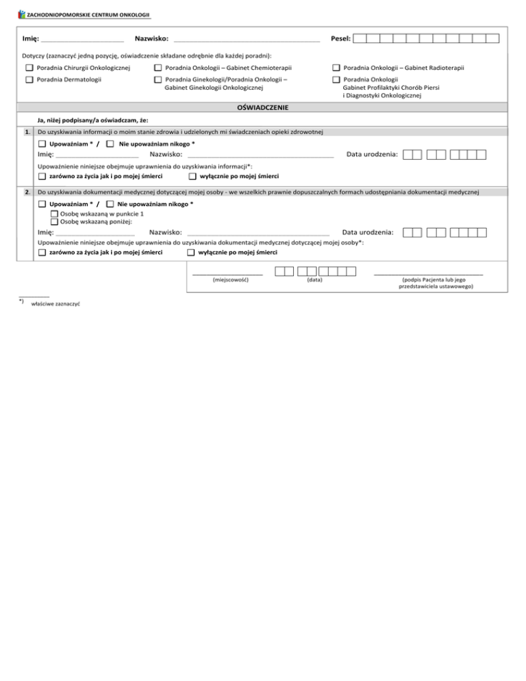 ZACHODNIOPOMORSKIE CENTRUM ONKOLOGII Imię: _____________________ Nazwisko: _____________________________________ Pesel: Dotyczy (zaznaczyć jedną pozycję, oświadczenie składane odrębnie dla każdej poradni): Poradnia Chirurgii Onkologicznej Poradnia Onkologii – Gabinet Chemioterapii Poradnia Onkologii – Gabinet Radioterapii Poradnia Dermatologii Poradnia Ginekologii/Poradnia Onkologii – Gabinet Ginekologii Onkologicznej Poradnia Onkologii Gabinet Profilaktyki Chorób Piersi i Diagnostyki Onkologicznej OŚWIADCZENIE Ja, niżej podpisany/a oświadczam, że: 1. Do uzyskiwania informacji o moim stanie zdrowia i udzielonych mi świadczeniach opieki zdrowotnej Upoważniam * / Nie upoważniam nikogo * Imię: _____________________ Nazwisko: _____________________________________ Data urodzenia: Upoważnienie niniejsze obejmuje uprawnienia do uzyskiwania informacji*: zarówno za życia jak i po mojej śmierci 2. wyłącznie po mojej śmierci Do uzyskiwania dokumentacji medycznej dotyczącej mojej osoby - we wszelkich prawnie dopuszczalnych formach udostępniania dokumentacji medycznej Upoważniam * / Nie upoważniam nikogo * Osobę wskazaną w punkcie 1 Osobę wskazaną poniżej: Imię: ____________________ Nazwisko: ____________________________________ Data urodzenia: Upoważnienie niniejsze obejmuje uprawnienia do uzyskiwania dokumentacji medycznej dotyczącej mojej osoby*: zarówno za życia jak i po mojej śmierci wyłącznie po mojej śmierci ____________________ (miejscowość) __________ *) właściwe zaznaczyć _______________________________ (data) (podpis Pacjenta lub jego przedstawiciela ustawowego)