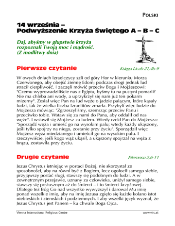 Polski Daj, abyśmy w głupstwie krzyża rozpoznali Twoją moc i mądrość. (Z modlitwy dnia) W owych dniach Izraelczycy szli od góry Hor w kierunku Morza Czerwonego, aby obejść ziemię Edom; podczas drogi jednak lud stracił cierpliwość. I zaczęli mówić przeciw Bogu i Mojżeszowi: "Czemu wyprowadziliście nas z Egiptu, byśmy tu na pustyni pomarli? Nie ma chleba ani wody, a uprzykrzył się nam już ten pokarm mizerny". Zesłał więc Pan na lud węże o jadzie palącym, które kąsały ludzi, tak że wielka liczba Izraelitów zmarła. Przybyli więc ludzie do Mojżesza mówiąc: "Zgrzeszyliśmy, szemrząc przeciw Panu i przeciwko tobie. Wstaw się za nami do Pana, aby oddalił od nas węże". I wstawił się Mojżesz za ludem. Wtedy rzekł Pan do Mojżesza: "Sporządź węża i umieść go na wysokim palu; wtedy każdy ukąszony, jeśli tylko spojrzy na niego, zostanie przy życiu". Sporządził więc Mojżesz węża miedzianego i umieścił go na wysokim palu. I rzeczywiście, jeśli kogo wąż ukąsił, a ukąszony spojrzał na węża z brązu, zostawiła przy życiu. Jezus Chrystus istniejąc w postaci Bożej, nie skorzystał ze sposobności, aby na równi być z Bogiem, lecz ogołocił samego siebie, przyjąwszy postać sługi, stawszy się podobnym do ludzi. A w zewnętrznym przejawie, uznany za człowieka, uniżył samego siebie, stawszy się posłusznym aż do śmierci – i to śmierci krzyżowej. Dlatego też Bóg Go nad wszystko wywyższył i darował Mu imię ponad wszelkie imię, aby na imię Jezusa zgięło się każde kolano istot niebieskich i ziemskich i podziemnych. I aby wszelki język wyznał, że Jezus Chrystus jest Panem – ku chwale Boga Ojca. Vienna International Religious Centre www.virc.at Jezus powiedział do Nikodema: "Nikt nie wstąpił do nieba, oprócz Tego, który z nieba zstąpił, Syna Człowieczego. A jak Mojżesz wywyższył węża na pustyni, tak potrzeba, by wywyższono Syna Człowieczego, aby każdy, kto w Niego wierzy, miał życie wieczne. Tak bowiem Bóg umiłował świat, że Syna swego Jednorodzonego dał, aby każdy, kto w Niego wierzy, nie zginął, ale miał życie wieczne. Albowiem Bóg nie posłał swego Syna na świat po to, aby świat potępił, ale po to, by świat został przez Niego zbawiony." Żadnego z symboli chrześcijańskich nie spotykamy tak często, jak krzyża; żaden nie spowszedniał nam też tak bardzo, jak krzyż. Jako znak utracił swoją moc, gdyż mamy go przed oczyma w zbyt wielu sytuacjach codzienności. Nie odbieramy go ani jako znaku hańby, ani znaku zwycięstwa. W tej sytuacji potrzebujemy ciągle nowego impulsu, aby uświadamiać sobie, jakie znaczenie ma on dla nas. Dla pierwszych chrześcijan krzyż był wielkim wyzwaniem; odbijał w sobie jednakże największą hańbę i najgłębsze poniżenie, które mogłoby się człowiekowi przytrafić. Również dzisiaj spotykamy krzyż tam, gdzie cierpią ludzie lub w miejscach, które świadczą o ich cierpieniu. Krzyż mówi nam wyraźnie: nic w tym świecie nie jest doskonałe; nasze plany, ideały i marzenia są krzyżowane przez rozczarowania, choroby i przeznaczenie. Krzyż jako ostrzeżenie przypomina nam, że śmierć, a z nią cierpienie i niesprawiedliwość – nawet po dziele zbawczym Chrystusa – dalej egzystują w naszym świecie. W naszym życiu ciągle pozostajemy w cieniu krzyża, a na koniec nadejdzie śmierć. Zhańbiony i skazany na krzyż Jezus z Nazaretu zostaje jednak wskrzeszony ze śmierci do życia. Poprzez takie działanie Boga zmienia się znaczenie krzyża. Bóg, wzywając Ukrzyżowanego do życia, stawia znak sprzeciwu wobec wszelkiemu cierpieniu i niesprawiedliwości, wobec wszelkiej bezsensowności i wobec śmierci jako absolutnemu końcowi. Wcielony Bóg musi wytrzymać cierpienie w opuszczeniu i beznadziejności aż do gorzkiego końca. W ten sposób jednak Bóg identyfikuje się z zalęknionym i zrozpaczonym człowiekiem i ukazuje się jako Ten, który idzie razem aż do granic śmierci. Krzyż mówi nam więc: Bóg jest blisko nas w niesprawiedliwości, cierpieniu, śmierci – egzystujących w naszym życiu. Krzyż staje się znakiem pocieszenia i nadziei, gdyż Jezus, cierpiący i opuszczony na krzyżu, nie pozostał w otchłani śmierci, lecz zmartwychwstał do życia. Krzyż symbolizuje wiarę, w której można mieć nadzieję. Nic, co nas spotyka, nie jest bezsensowne, gdyż nawet w pozornej bezsensowności możemy czuć się zanurzeni i bezpieczni w miłości Boga. Z powodu śmierci i zmartwychwstania Jezusa świat nie stał się zewnętrznie lepszy. Gdy jednak nazywamy siebie zbawionymi, wówczas możemy zaakceptować go taki jakim jest – ze wszystkimi jego cieniami. Krzyż jako znak zbawienia posyła nas ciągle do ludzi i zaprasza do takiego działania jakim charakteryzował się Jezus – bez rezygnacji. Wierzyć w krzyż oznacza: nie wątpić w świat, lecz angażować się na rzecz sprawiedliwości, pokoju i miłości, gdyż Jezus Chrystus pokonał na krzyżu grzech i śmierć oraz pozyskał dla nas nowe życie. Vienna International Religious Centre [email protected]