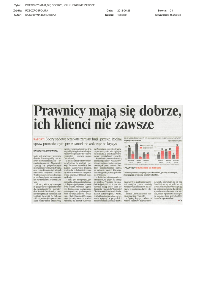Tytu³: PRAWNICY MAJ¡ SIÊ DOBRZE, ICH KLIENCI NIE ZAWSZE ¬ród³o: RZECZPOSPOLITA Autor: KATARZYNA BOROWSKA Data: Nak³ad: 2012-06-28 Strona: 138 380 C1 Ekwiwalent: 45 250,33 Prawnicy mają się dobrze, ich klienci nie zawsze Spory sądowe o zapłatę zamiast fuzji i przejęć. Rodzaj spraw prowadzonych przez kancelarie wskazuje na kryzys RAPORT zanej z wprowadzaniem firm na giełdę i ciągle niewielka jest ruchliwość, jeśli chodzi o nieru Mało jest pracy przy wprowa chomości - zwraca uwagę dzaniu firm na giełdę czy też Ostrichansky. przy nieruchomościach - sy Z kolei Marcin Wystrychowgnalizują prawnicy. Najczęściej ski, dyrektor ds. strategii i roz woju biznesu kancelarii Do zajmują się gospodarczymi sporami sądowymi, windykacją mański Zakrzewski Palinka, oraz restmkturyzacją trudnych podkreśla, że Polską interesuje należności - wynika z badania się wielu inwestorów z zagrani WK Index, przeprowadzonego cy i są branże, w których dużo przez firmę Ipsos na zamówie się dzieje. nie wydawnictwa Wolters Klu - Silna jest energetyka, go wer. spodarka odpadami czy farma - Rzeczywiście, sądowe spo cja. Pojawiają się nowe, rozwo ry gospodarcze są teraz istotne jowe branże, które nie są jesz dla naszej praktyki - potwier cze dostatecznie dostrzegane dza Rudolf Ostrihansky, part przez rynek, np. gry kompute ner zarządzający kancelarii Soł- rowe czy szpitalnictwo - wska tysiński Kawecki & Szlęzak. zuje. - Są też branże, które mają - Wciąż jednak jest sporo trans kłopoty, związane m.in. z wize akcji. Mamy mniej pracy zwią runkiem, np. sektor budowla KATARZYNA BOROWSKA ny. Zmienia się przez to struktu ra pracy na rynku, ale ciągle jest jej niemało, a trend jest wzro stowy- ocenia Wystrychowski. Kancelarie prawne nie widzą u siebie spadków - własne wy niki oceniają na podobnym po ziomie jak przed rokiem. Bar dziej pesymistycznie patrzą na sytuację swoich klientów. Tendencję taką pokazuje bada nie WK Index. - Jeśli chodzi o największe kancelarie, to popyt na usługi nie maleje. Prawnicy nie spo dziewają się też, że on spadnie, obecnie mają duże pole do działania - mówi „Rz" Krzysztof Chmielewski, kierownik bada nia WK Index w Ipsos. - Ale to, że ich klienci radzą sobie gorzej, może wpłynąć w przyszłości na ich dochody. Chociaż trzeba Jak sytuacig obsługiwanych firm oceniaią kancelarie (w porównaniu rocznym)9 Największe kancelarie Kancelarie lokalne 58.0 £2" 56.0" m poprawita sit; • pogorszyła się * . " • ; ) Wiosna 2010 Jesień 2010 Wiosna 2012 Wiosna 2010 Jesień 2010 Wiosna 2012 zrodto: badania WK index przygotowane przez Ipsos na zlecenie Woliers Kluwer Polska Sp z o o. -PRAWNICY O KRYZYSIE W BIZNESIE Zarówno partnerzy największych kancelarii, jak i tych lokalnych, dostrzegają problemy swoich klientów. zauważyć, że partnerzy kance larii mniej korzystnie oceniają wyniki swoich klientów niż sy tuację w całej gospodarce - do daje. Rudolf Ostrihansky nie oce nia sytuacji na rynku źle. - Ogólny kryzys, zwłaszcza wśród klientów międzynaro dowych, powoduje, że są oni bardziej oszczędni, jeśli chodzi o wydawanie pieniędzy i optują za korzystniejszym dla siebie sposobem rozliczania. Ale są dzę, że nie wpłynie to znacząco na ogólną skalę przychodów i zysków - przewiduje. *C3