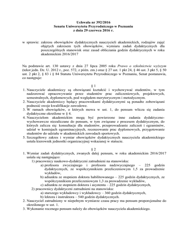 Uchwała nr 392/2016 Senatu Uniwersytetu Przyrodniczego w Poznaniu z dnia 29 czerwca 2016 r. w sprawie: zakresu obowiązków dydaktycznych nauczycieli akademickich, rodzajów zajęć objętych zakresem tych obowiązków, wymiaru zadań dydaktycznych dla poszczególnych stanowisk oraz zasad obliczania godzin dydaktycznych w roku akademickim 2016/2017 Na podstawie art. 130 ustawy z dnia 27 lipca 2005 roku Prawo o szkolnictwie wyższym (tekst jedn. Dz. U. 2012 r., poz. 572, z późn. zm.) oraz § 27 ust. 1 pkt 24, § 46 ust. 3 pkt 5, § 50 ust. 2 pkt 2, § 83 i § 84 Statutu Uniwersytetu Przyrodniczego w Poznaniu, Senat postanawia, co następuje: §1 1. Nauczyciele akademiccy są obowiązani kształcić i wychowywać studentów, w tym nadzorować opracowywanie przez studentów prac zaliczeniowych, projektowych, semestralnych, dyplomowych, pod względem merytorycznym i metodycznym. 2. Nauczyciele akademiccy będący pracownikami dydaktycznymi są ponadto zobowiązani podnosić swoje kwalifikacje zawodowe. 3. W ramach obowiązków, o których mowa w ust. 1, do pensum wlicza się zadania dydaktyczne określone w § 4. 4. Nauczycielom akademickim mogą być powierzone inne zadania dydaktycznowychowawcze niezaliczane do pensum, w tym związane z procesem dydaktycznym, do których zalicza się: konsultacje dla studentów, przeprowadzanie zaliczeń i egzaminów, udział w komisjach egzaminacyjnych, recenzowanie prac dyplomowych, przygotowanie studentów do udziału w akademickich zawodach sportowych. 5. Szczegółowy zakres i wymiar obowiązków dydaktycznych nauczyciela akademickiego ustala kierownik jednostki organizacyjnej wskazanej w statucie. §2 1. Wymiar zadań dydaktycznych, zwanych dalej pensum, w roku akademickim 2016/2017 ustala się następująco: 1) pracownicy naukowo-dydaktyczni zatrudnieni na stanowisku: a) profesora zwyczajnego i profesora nadzwyczajnego – 225 godzin dydaktycznych, ze współczynnikiem przeliczeniowym 1,5 za prowadzenie wykładów, b) adiunkta ze stopniem doktora habilitowanego – 225 godzin dydaktycznych, ze współczynnikiem przeliczeniowym 1,3 za prowadzenie wykładów, c) adiunkta ze stopniem doktora i asystenta – 225 godzin dydaktycznych, 2) pracownicy dydaktyczni zatrudnieni na stanowisku: a) starszego wykładowcy i wykładowcy – 360 godzin dydaktycznych, b) lektora i instruktora – 540 godzin dydaktycznych. 2. Nauczyciel zatrudniony w niepełnym wymiarze czasu pracy ma pensum proporcjonalne do określonego w ust. 1. 3. Wykonanie rocznego pensum należy do obowiązków nauczyciela akademickiego. §3 1. Jednostką organizacyjną, w ramach której rozlicza się pensum jest instytut, katedra lub ogólnouczelniana jednostka dydaktyczna. 2. Niedobór pensum nauczyciela akademickiego w macierzystej jednostce organizacyjnej może być uzupełniony w innej jednostce naukowo-dydaktycznej, w której występują godziny ponadwymiarowe, za zgodą dziekana, kierownika właściwej jednostki organizacyjnej i kierownika przedmiotu. 3. Nadzór nad umożliwieniem wykonania pensum przez każdego nauczyciela akademickiego sprawuje dziekan wydziału, a w przypadku nauczycieli ogólnouczelnianych jednostek dydaktycznych – Prorektor ds. Studiów. 4. W przypadku niedoboru godzin w jednostce, zajęcia dydaktyczne wykonane przez doktoranta, którego opiekunem jest osoba nieposiadająca tytułu profesora, w wysokości określonej w uchwale Senatu nr 360/2016, umniejszają ten niedobór. §4 1. Do pensum zalicza się prowadzenie następujących rodzajów zajęć dydaktycznych, zgodnie z obowiązującymi planami studiów i studiów doktoranckich: 1) wykłady, 2) ćwiczenia konwersatoryjne, praktyczne i terenowe, 3) zajęcia laboratoryjne, projektowe i warsztatowe, 4) seminaria dyplomowe i doktoranckie, 5) lektoraty i zajęcia z wychowania fizycznego, 6) zajęcia w grupach dodatkowych utworzonych na zasadach określonych przez Rektora. 2. Do pensum zalicza się sprawowanie opieki naukowej nad realizacją prac dyplomowych oraz nad działalnością kół naukowych. 3. Do pensum może być zaliczone prowadzenie zajęć: 1) trenerskich w sekcjach sportowych AZS, 2) na studiach podyplomowych, kursach dokształcających lub szkoleniach, 3) na terenie Uczelni dla uczniów gimnazjum lub szkoły ponadgimnazjalnej, w ramach promocji lub umowy dwustronnej, 4) w klasach akademickich szkół ponadgimnazjalnych, na podstawie umowy z Uczelnią. 4. Decyzją Prorektora ds. Studiów, do pensum może być zaliczona opieka nad dyplomantem lub praktykantem innej uczelni lub ośrodka naukowego, np. w ramach programu Erasmus+, studiów interdyscyplinarnych lub innej współpracy. 5. Zaliczenie do pensum zajęć lub opieki, o których mowa w ust. 3 i 4, następuje, gdy prowadzący nie otrzymuje wynagrodzenia za te aktywności z innego źródła. 6. Prowadzenie wykładów i seminariów powierza się nauczycielom akademickim z tytułem naukowym profesora lub stopniem naukowym doktora habilitowanego, a dopiero po wyczerpaniu tej możliwości – innym nauczycielom, za zgodą rady wydziału właściwej dla danego kierunku studiów. 7. Nauczyciele akademiccy z tytułem profesora lub stopniem doktora habilitowanego realizują inne zajęcia niż wyszczególnione w ust. 6 dla uzupełnienia pensum. 8. Wielkość grup studenckich dla poszczególnych rodzajów zajęć dydaktycznych określa uchwała nr 365/2012 Senatu z dnia 27 czerwca 2012 r. w sprawie liczebności studenckich grup dydaktycznych. 2 §5 1. Ustala się następujące przeliczniki dla zadań, o których mowa w § 4 ust 2 i 3: 1) za sprawowanie opieki naukowej nad realizacją prac dyplomowych: a) 10 godzin dydaktycznych za jedną ukończoną pracę magisterską – w liczbie nie większej niż 8, przy zachowaniu możliwie równomiernego rozdziału pomiędzy nauczycieli samodzielnej jednostki naukowo-dydaktycznej, b) 5 godzin dydaktycznych za jedną ukończoną pracę licencjacką lub inżynierską, w liczbie nie większej niż 8, z zastrzeżeniem jak