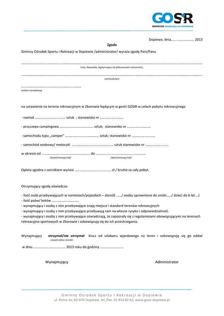 Dopiewo, dnia........……………… 2013 Zgoda Gminny Ośrodek Sportu i Rekreacji w Dopiewie /administrator/ wyraża zgodę Pani/Panu ………………………………………………………………………………………………………………………………………………………………………. Imię i Nazwisko, legitymujący się dokumentem tożsamości, ………………………………………………………………………………………………………………………………………………………………………. zamieszkałym ……………………………………………………… telefon kontaktowy na ustawienie na terenie rekreacyjnym w Zborowie będącym w gestii GOSiR w celach pobytu rekreacyjnego - namiot …………………………….. sztuk ; stanowisko nr ……………………… - przyczepa campingowa ………………………………… sztuk; stanowisko nr ……………………… - samochodu typu „camper” ………………………………… sztuk; stanowisko nr ……………………… - samochód osobowy/ motocykl ………………………………………… sztuk stanowisko nr ……………………… w okresie od ………………………………………………. do …………………………………………………. /dzień/miesiąc/rok/ /dzień/miesiąc/rok/ Opłata zgodna z cennikiem wynosi …………………………………….zł./ brutto za cały pobyt. Otrzymujący zgodę oświadcza: - ilość osób przebywających w namiotach/pojazdach – dorośli .…../ osoby uprawnione do zniżki……/ dzieci do 6 lat….) - ilość psów/ kotów …………………………. - wynajmujący i osoby z nim przebywające znają miejsce i standard terenów rekreacyjnych - wynajmujący i osoby z nim przebywające przebywają tam na własne ryzyko i odpowiedzialność. - wynajmujący i osoby z nim przebywające oświadczają, że zapoznały się z regulaminami obowiązującymi na terenach rekreacyjno-sportowych w Zborowie i zobowiązują się do ich przestrzegania. Wynajmujący otrzymał/nie otrzymał klucz od szlabanu wjazdowego na teren i zobowiązuję się go oddać niepotrzebne skreślić w dniu ………………………………. 2013 roku do godziny ……………………... Wynajmujący Administrator Gminny Ośrodek Sportu i Rekreacji w Dopiewie ul. Polna 1a; 62-070 Dopiewo, tel./fax. 61 814 82 62, www.gosir.dopiewo.pl