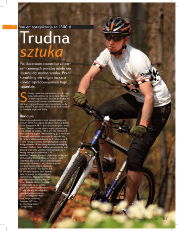 Rower: specjalizacja za 1300 zł Trudna sztuka Producentom rowerów zaprezentowanych poniżej udała się naprawdę trudna sztuka. Przekonaliśmy się o tym na sam koniec opracowywania tego materiału. S zukając rowerów porównawczych do tego testu, natknęliśmy się na nie lada kłopoty. Okazało się bowiem, że za te pieniądze nie można kupić roweru sprofilowanego na maraton czy umożliwiającego rozpoznanie jazdy typu enduro. A jak wieść niesie, są to dwie dziedziny wiodące prym nad Wisłą. Budowa Obie ramy wykonano z tego samego stopu aluminium 6061. Co więcej jak głosi napis na dolnej rurze Scrappera AR1 - jest ona podwójnie cieniowana. Dowód, że nie chodzi wyłącznie o dolną rurę, widać na wadze. 1953 g to dla rozmiaru L bardzo dobry wynik. Porównaliśmy go z rowerami z naszej kwietniowej prezentacji i okazało się, że rama ta uplasowałaby się na 3. miejscu na 8, z ceną niższą o 5 stów od najtańszego roweru! X-Light Dream 08 ma zdecydowanie mocniejszą posturę. Grubsze rury, solidne wzmocnienie pod główką oraz tylny widelec, który przyjął nawet Kendę Nevegal w rozmiarze 2,35”. Widelec Dreama, pomimo większego skoku, jest blisko 600 g lżejszy! Mimo to Spinner Eagle H w terenie pracował całym jedenastocentymetrowym skokiem. I to całkiem poprawnie, brakowało jedynie tłumienia. Suntour XCM V2 z Go Sporta jest na początku ugięcia dość twardy, dobrze spisuje się w środkowej części skoku. Rezultatem braku tłumienia było zbyt szybkie odbicie. Blokada skoku z manetki (sic!) przyda się na asfaltowych odcinkach i podjazdach. Działa, ale aby się odblokowała po wciśnięciu przycisku, amortyzator musi trafić na przeszkodę. Scrapper AR1 ma 27-biegowy napęd i w tej klasie bikeBoar d #5 maj 2009 87