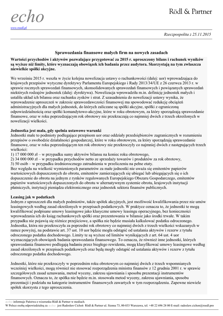 echo www.roedl.pl Rzeczpospolita z 25.11.2015 Sprawozdania finansowe małych firm na nowych zasadach Wartości przychodów i aktywów pozwalające przygotować za 2015 r. uproszczony bilans i rachunek wyników są wyższe niż limity, które wyznaczają obowiązek ich badania przez audytora. Skorzystają na tym zwłaszcza niewielkie spółki akcyjne. We wrześniu 2015 r. weszła w życie kolejna nowelizacja ustawy o rachunkowości (dalej: uor) wprowadzająca do krajowych przepisów wytyczne dyrektywy Parlamentu Europejskiego i Rady 2013/34/UE z 26 czerwca 2013 r. w sprawie rocznych sprawozdań finansowych, skonsolidowanych sprawozdań finansowych i powiązanych sprawozdań niektórych rodzajów jednostek (dalej: dyrektywa). Nowelizacja wprowadziła m.in. definicję jednostek małych i ustaliła układ ich bilansu oraz rachunku zysków i strat. Z uzasadnienia do nowelizacji ustawy wynika, że wprowadzenie uproszczeń w zakresie sprawozdawczości finansowej ma spowodować redukcję obciążeń administracyjnych dla małych jednostek, do których zaliczane są spółki akcyjne, spółki z ograniczoną odpowiedzialnością oraz spółki komandytowo-akcyjne, które w roku obrotowym, za który sporządzają sprawozdanie finansowe, oraz w roku poprzedzającym rok obrotowy nie przekraczają co najmniej dwóch z trzech określonych w nowelizacji wielkości. Jednostka jest mała, gdy spełnia ustawowe warunki Jednostki małe to podmioty podlegające przepisom uor oraz oddziały przedsiębiorców zagranicznych w rozumieniu przepisów o swobodzie działalności gospodarczej, które w roku obrotowym, za który sporządzają sprawozdanie finansowe, oraz w roku poprzedzającym ten rok obrotowy nie przekroczyły co najmniej dwóch z następujących trzech wielkości: 1) 17 000 000 zł – w przypadku sumy aktywów bilansu na koniec roku obrotowego, 2) 34 000 000 zł – w przypadku przychodów netto ze sprzedaży towarów i produktów za rok obrotowy, 3) 50 osób – w przypadku średniorocznego zatrudnienia w przeliczeniu na pełne etaty. Bez względu na wielkość wymienionych parametrów za małe jednostki nie uważa się emitentów papierów wartościowych dopuszczonych do obrotu, emitentów zamierzających się ubiegać lub ubiegających się o ich dopuszczenie do obrotu na jednym z rynków regulowanych Europejskiego Obszaru Gospodarczego, emitentów papierów wartościowych dopuszczonych do obrotu w alternatywnym systemie obrotu, krajowych instytucji płatniczych, instytucji pieniądza elektronicznego oraz jednostek sektora finansów publicznych. Leasing jak w podatkach Jednym z uproszczeń dla małych podmiotów, także spółek akcyjnych, jest możliwość kwalifikowania przez nie umów leasingowych według zasad określonych w przepisach podatkowych. W praktyce oznacza to, że jednostki te mogą kwalifikować podpisane umowy leasingowe jako klasyczne umowy leasingu operacyjnego, bez konieczności wprowadzania ich do ksiąg rachunkowych spółki oraz prezentowania w bilansie jako środki trwałe. W takim przypadku nie pojawią się różnice przejściowe, a spółka nie będzie musiała kalkulować podatku odroczonego. Jednostka, która nie przekroczyła za poprzedni rok obrotowy co najmniej dwóch z trzech wielkości wskazanych w ramce powyżej, na podstawie art. 37 ust. 10 uor będzie mogła odstąpić od ustalania aktywów i rezerw z tytułu odroczonego podatku dochodowego. Limity te są wyższe od limitów wynikających z art. 64 ust. 4 uor wyznaczających obowiązek badania sprawozdania finansowego. To oznacza, że również inne jednostki, których sprawozdania finansowe podlegają badaniu przez biegłego rewidenta, mogą klasyfikować umowy leasingowe według zasad określonych w przepisach podatkowych oraz będą mogły odstąpić od ustalania aktywów i rezerw z tytułu odroczonego podatku dochodowego. Jednostki, które nie przekroczyły w poprzednim roku obrotowym co najmniej dwóch z trzech wspomnianych wcześniej wielkości, mogą również nie stosować rozporządzenia ministra finansów z 12 grudnia 2001 r. w sprawie szczegółowych zasad uznawania, metod wyceny, zakresu ujawniania i sposobu prezentacji instrumentów finansowych. Oznacza to, że spółka nie będzie m.in. stosowała metod wyceny, zakresu ujawniania, sposobu prezentacji i podziału na kategorie instrumentów finansowych zawartych w tym rozporządzeniu. Zapewne niewiele spółek skorzysta z tego uproszczenia. echo informuje Państwa o wizerunku Rödl & Partner w mediach. W Polsce osobą odpowiedzialną za echo jest Radosław Cichoń Rödl & Partner ul. Sienna 73, 00-833 Warszawa, tel. +48 22 696 28 00 E-mail: [email protected] Wprowadzone przez nowelizację uor uproszczenia są najbardziej widoczne w samej prezentacji sprawozdania finansowego. Załącznik nr 5 do uor przedstawia zakres informacji wykazywanych w sprawozdaniu finansowym dla jednostek małych korzystających z uproszczeń. Jednostka mała może przygotować zarówno bilans, jak i rachunek zysków i strat w okrojonej wersji. Stopień szczegółowości prezentowanych danych finansowych zakończy się wtedy na cyfrach rzymskich (z pewnymi wyjątkami) – dotychczasowej wersji tych elementów sprawozdania: - W rzeczowych aktywach trwałych prezentuje się środki trwałe i środki trwałe w budowie. - Inwestycje długoterminowe są podzielone na nieruchomości i długoterminowe aktywa finansowe. - W należnościach i zobowiązaniach krótkoterminowych podmiot pokaże rozrachunki z tytułu dostaw i usług w podziale na do i powyżej 12 miesięcy. - W kapitałach spółka zaprezentuje kapitał zapasowy z wyszczególnieniem nadwyżki agio oraz kapitał z aktualizacji wyceny z wydzielonym kapitałem, który powstał z tytułu aktualizacji wartości godziwej. - W rezerwach spółka pokaże rezerwę na świadczenia emerytalne i podobne. - W zobowiązaniach długo- i krótkoterminowych wykazuje się kredyty i pożyczki. - W zobowiązaniach krótkoterminowych – p