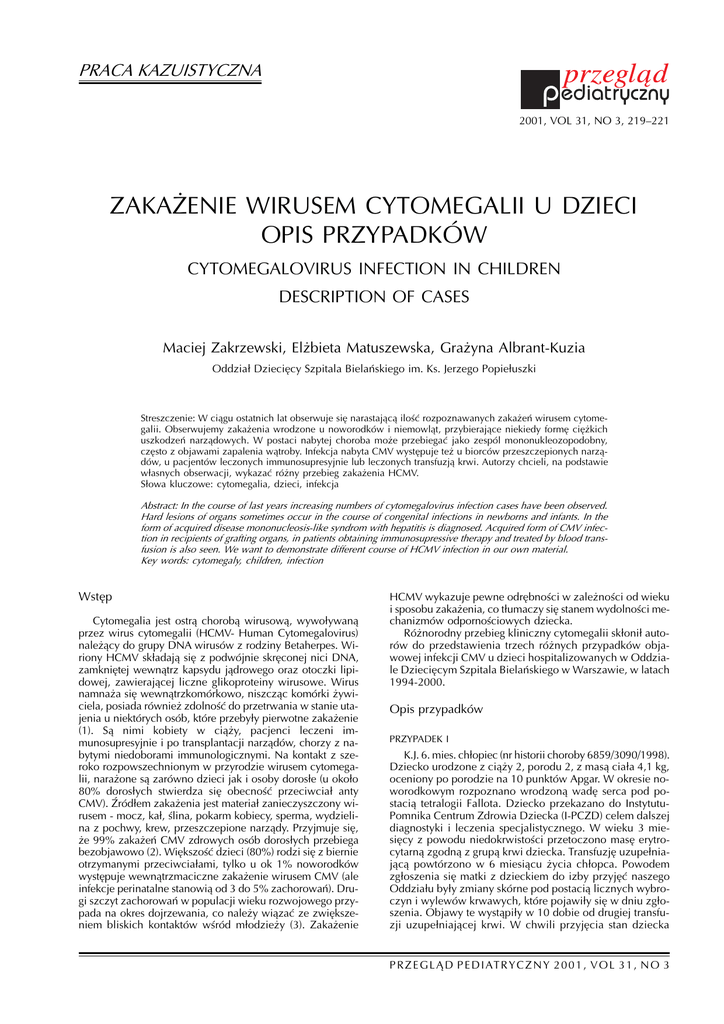 PRACA KAZUISTYCZNA 2001, VOL 31, NO 3, 219221 ZAKA¯ENIE WIRUSEM CYTOMEGALII U DZIECI OPIS PRZYPADKÓW CYTOMEGALOVIRUS INFECTION IN CHILDREN DESCRIPTION OF CASES Maciej Zakrzewski, El¿bieta Matuszewska, Gra¿yna Albrant-Kuzia Oddzia³ Dzieciêcy Szpitala Bielañskiego im. Ks. Jerzego Popie³uszki Streszczenie: W ci¹gu ostatnich lat obserwuje siê narastaj¹c¹ iloæ rozpoznawanych zaka¿eñ wirusem cytomegalii. Obserwujemy zaka¿enia wrodzone u noworodków i niemowl¹t, przybieraj¹ce niekiedy formê ciê¿kich uszkodzeñ narz¹dowych. W postaci nabytej choroba mo¿e przebiegaæ jako zespól mononukleozopodobny, czêsto z objawami zapalenia w¹troby. Infekcja nabyta CMV wystêpuje te¿ u biorców przeszczepionych narz¹dów, u pacjentów leczonych immunosupresyjnie lub leczonych transfuzj¹ krwi. Autorzy chcieli, na podstawie w³asnych obserwacji, wykazaæ ró¿ny przebieg zaka¿enia HCMV. S³owa kluczowe: cytomegalia, dzieci, infekcja Abstract: In the course of last years increasing numbers of cytomegalovirus infection cases have been observed. Hard lesions of organs sometimes occur in the course of congenital infections in newborns and infants. In the form of acquired disease mononucleosis-like syndrom with hepatitis is diagnosed. Acquired form of CMV infection in recipients of grafting organs, in patients obtaining immunosupressive therapy and treated by blood transfusion is also seen. We want to demonstrate different course of HCMV infection in our own material. Key words: cytomegaly, children, infection Wstêp Cytomegalia jest ostr¹ chorob¹ wirusow¹, wywo³ywan¹ przez wirus cytomegalii (HCMV- Human Cytomegalovirus) nale¿¹cy do grupy DNA wirusów z rodziny Betaherpes. Wiriony HCMV sk³adaj¹ siê z podwójnie skrêconej nici DNA, zamkniêtej wewn¹trz kapsydu j¹drowego oraz otoczki lipidowej, zawieraj¹cej liczne glikoproteiny wirusowe. Wirus namna¿a siê wewn¹trzkomórkowo, niszcz¹c komórki ¿ywiciela, posiada równie¿ zdolnoæ do przetrwania w stanie utajenia u niektórych osób, które przeby³y pierwotne zaka¿enie (1). S¹ nimi kobiety w ci¹¿y, pacjenci leczeni immunosupresyjnie i po transplantacji narz¹dów, chorzy z nabytymi niedoborami immunologicznymi. Na kontakt z szeroko rozpowszechnionym w przyrodzie wirusem cytomegalii, nara¿one s¹ zarówno dzieci jak i osoby doros³e (u oko³o 80% doros³ych stwierdza siê obecnoæ przeciwcia³ anty CMV). ród³em zaka¿enia jest materia³ zanieczyszczony wirusem - mocz, ka³, lina, pokarm kobiecy, sperma, wydzielina z pochwy, krew, przeszczepione narz¹dy. Przyjmuje siê, ¿e 99% zaka¿eñ CMV zdrowych osób doros³ych przebiega bezobjawowo (2). Wiêkszoæ dzieci (80%) rodzi siê z biernie otrzymanymi przeciwcia³ami, tylko u ok 1% noworodków wystêpuje wewn¹trzmaciczne zaka¿enie wirusem CMV (ale infekcje perinatalne stanowi¹ od 3 do 5% zachorowañ). Drugi szczyt zachorowañ w populacji wieku rozwojowego przypada na okres dojrzewania, co nale¿y wi¹zaæ ze zwiêkszeniem bliskich kontaktów wród m³odzie¿y (3). Zaka¿enie HCMV wykazuje pewne odrêbnoci w zale¿noci od wieku i sposobu zaka¿enia, co t³umaczy siê stanem wydolnoci mechanizmów odpornociowych dziecka. Ró¿norodny przebieg kliniczny cytomegalii sk³oni³ autorów do przedstawienia trzech ró¿nych przypadków objawowej infekcji CMV u dzieci hospitalizowanych w Oddziale Dzieciêcym Szpitala Bielañskiego w Warszawie, w latach 1994-2000. Opis przypadków PRZYPADEK I K.J. 6. mies. ch³opiec (nr historii choroby 6859/3090/1998). Dziecko urodzone z ci¹¿y 2, porodu 2, z mas¹ cia³a 4,1 kg, oceniony po porodzie na 10 punktów Apgar. W okresie noworodkowym rozpoznano wrodzon¹ wadê serca pod postaci¹ tetralogii Fallota. Dziecko przekazano do InstytutuPomnika Centrum Zdrowia Dziecka (I-PCZD) celem dalszej diagnostyki i leczenia specjalistycznego. W wieku 3 miesiêcy z powodu niedokrwistoci przetoczono masê erytrocytarn¹ zgodn¹ z grup¹ krwi dziecka. Transfuzjê uzupe³niaj¹c¹ powtórzono w 6 miesi¹cu ¿ycia ch³opca. Powodem zg³oszenia siê matki z dzieckiem do izby przyjêæ naszego Oddzia³u by³y zmiany skórne pod postaci¹ licznych wybroczyn i wylewów krwawych, które pojawi³y siê w dniu zg³oszenia. Objawy te wyst¹pi³y w 10 dobie od drugiej transfuzji uzupe³niaj¹cej krwi. W chwili przyjêcia stan dziecka P R Z E G L ¥ D P E D I AT R Y C Z N Y 2 0 0 1 , V O L 3 1 , N O 3 Zakrzewski M., Matuszewska E., Albrant-Kuzia G. oceniano jako doæ dobry. Oprócz licznych wybroczyn na skórze ca³ego cia³a obserwowano krwisty wylew do bia³kówki oka lewego, wylewy do luzówki warg, podniebienia i jêzyka, krwist¹ wydzielinê w przewodzie s³uchowym zewnêtrznym prawym. Nad ca³ym sercem obecny szmer holosystoliczny 5/6 w skali Levina, najg³oniejszy w dolnej czêci mostka. Stwierdzono ponadto powiêkszenie w¹troby do 3 cm poni¿ej ³uku ¿ebrowego. Ch³opiec nie gor¹czkowa³, nie obserwowano klinicznych objawów infekcji dróg oddechowych. W badaniach laboratoryjnych OB 6/1h, HGB 12,3g/dl, WBC 13,9G/L, w rozmazie krwi obwodowej 70% limfocytów, liczba p³ytek krwi 6,0G/L. Badanie rentgenowskie klatki piersiowej w normie. Posiewy krwi, moczu, ka³u ja³owe. Stwierdzono zaburzenia w uk³adzie krzepniêcia pod postaci¹ wyd³u¿enia czasu protrombinowego do 25s (norma 10-16s), obni¿enia wskanika protrombinowego do 60% (norma powy¿ej 90%), oraz nisk¹ wartoæ stê¿enia fibrynogenu 2,26g/l (norma 2-5g/l). W badaniu szpiku kostnego poza nieznacznym pobudzeniem uk³adu ch³onnego i granulocytarnego, innych nieprawid³owoci nie znaleziono. Wykazano obecnoæ dojrza³ych megakariocytów nie odsznurowuj¹cych p³ytek. Nie stwierdzono obecnoci przeciwcia³ przeciwp³ytkowych w surowicy krwi matki. Badanie USG czaszki wykaza³o prawid³owy obraz struktur mózgowych. Przeprowadzono diagnostykê w kierunku zaka¿enia HBV, HCV, CMV (krew na badania pobrano przed wdro¿eniem leczenia). W badaniach wirusologicznych metod¹ PCR stwierdzono obecnoæ RNA 