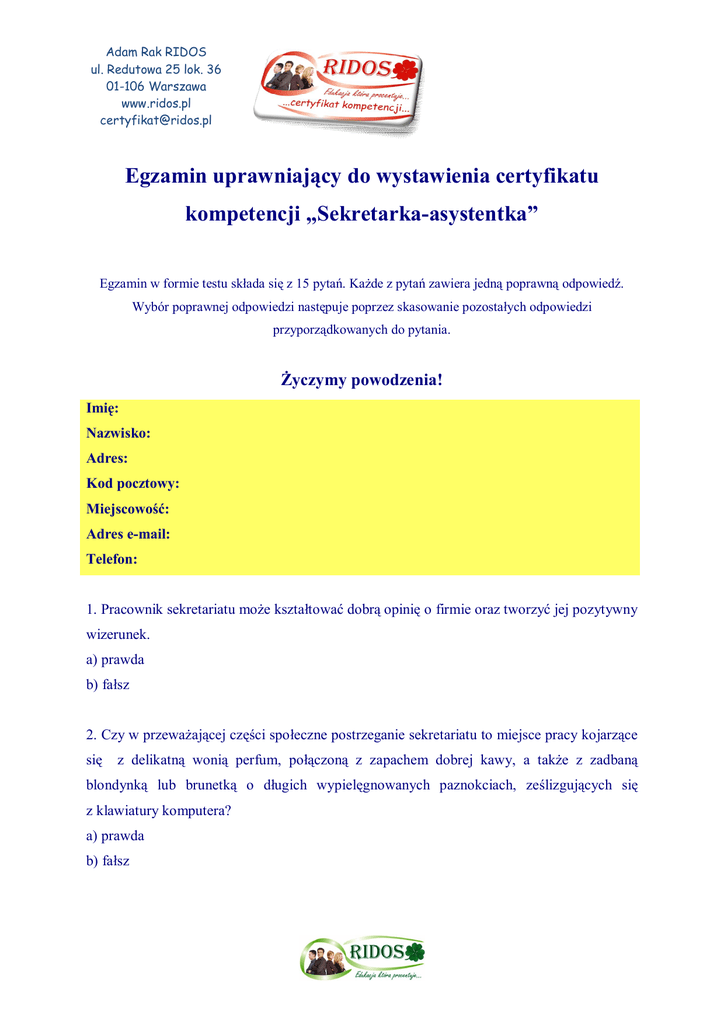 Adam Rak RIDOS ul. Redutowa 25 lok. 36 01-106 Warszawa www.ridos.pl [email protected] Egzamin uprawniający do wystawienia certyfikatu kompetencji „Sekretarka-asystentka” Egzamin w formie testu składa się z 15 pytań. Każde z pytań zawiera jedną poprawną odpowiedź. Wybór poprawnej odpowiedzi następuje poprzez skasowanie pozostałych odpowiedzi przyporządkowanych do pytania. Życzymy powodzenia! Imię: Nazwisko: Adres: Kod pocztowy: Miejscowość: Adres e-mail: Telefon: 1. Pracownik sekretariatu może kształtować dobrą opinię o firmie oraz tworzyć jej pozytywny wizerunek. a) prawda b) fałsz 2. Czy w przeważającej części społeczne postrzeganie sekretariatu to miejsce pracy kojarzące się z delikatną wonią perfum, połączoną z zapachem dobrej kawy, a także z zadbaną blondynką lub brunetką o długich wypielęgnowanych paznokciach, ześlizgujących się z klawiatury komputera? a) prawda b) fałsz Adam Rak RIDOS ul. Redutowa 25 lok. 36 01-106 Warszawa www.ridos.pl [email protected] 3. Różnica między sekretarką, a sekretarką-asystentką polega na zakresie kompetencji oraz samodzielności działania. a) prawda b) fałsz 4. Sekretarka powinna nadrabiać braki w kwalifikacjach podkreślaniem walorów zewnętrznych, przez agresywny makijaż, wyzywające ubranie i zachowanie. a) prawda b) fałsz 5. Szybkość przepływu informacji w firmie zależy w dużym stopniu od znajomości przez sekretarkę-asystentkę struktury organizacyjnej przedsiębiorstwa. a) prawda b) fałsz 6. Regulamin organizacyjny firmy określa jej funkcjonowanie, zarówno w formie opisowej, jak i graficznej. a) prawda b) fałsz 7. Instrukcja kancelaryjna określa, w jaki sposób należy wykonywać czynności kancelaryjne w danej firmie. Potocznie nazywamy ją „przewodnikiem po pracy sekretarsko-biurowej”. a) prawda b) fałsz Adam Rak RIDOS ul. Redutowa 25 lok. 36 01-106 Warszawa www.ridos.pl [email protected] 8. Tworząc korespondencję warto zrobić to w pierwszej kolejności w notesie lub przy użyciu komputera. Warto też „pisać” korespondencję za „jednym posiedzeniem z uwzględnieniem przerw”, gdyż wówczas wzrasta prawdopodobieństwo, że zakończymy list z tą sama koncepcją jaką mieliśmy na początku. a) prawda b) fałsz 9. Obwoluty to papierowe (częściej plastikowe okładki) służące do przenoszenia pojedynczych dokumentów biurowych lub niewielkiej ich liczby. Używanie obwolut w różnym kolorze umożliwia już wstępną wizualną segregację dokumentów. a) prawda b) fałsz 10. System dziennikowy występuje w dwóch odmianach, jako system dwudziennikowy i jednodziennikowy. W systemie dwudziennikowym do rejestracji pism wykorzystuje się dwa dzienniki podawcze, jeden przeznaczony jest do rejestracji pism wpływających, drugi do rejestracji pism wysłanych. a) prawda b) fałsz 11. Największym błędem jaki może popełnić sekretarka-asystentka jest przyznanie, że nie lubi szefa albo się go boi. a) prawda b) fałsz 12. Sekretarka nie powinna ociągać się z podnoszeniem słuchawki, gdyż telefonujący może pomyśleć, że zajmuje się nie wiadomo czym, podczas gdy on ma do firmy ważną (jego zdaniem) sprawę. a) prawda b) fałsz Adam Rak RIDOS ul. Redutowa 25 lok. 36 01-106 Warszawa www.ridos.pl [email protected] 13. Drukarka laserowa w dużej mierze pozwala ograniczyć koszty wydruku. a) prawda b) fałsz 14. Czy projektor multimedialny to inaczej rzutnik? a) prawda b) fałsz 15. Synonimem kopiowania jest skanowanie. a) prawda b) fałsz Rozwiązany test Sekretarka-asystentka prosimy przesłać na adres e-mail: [email protected]