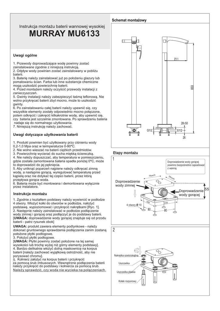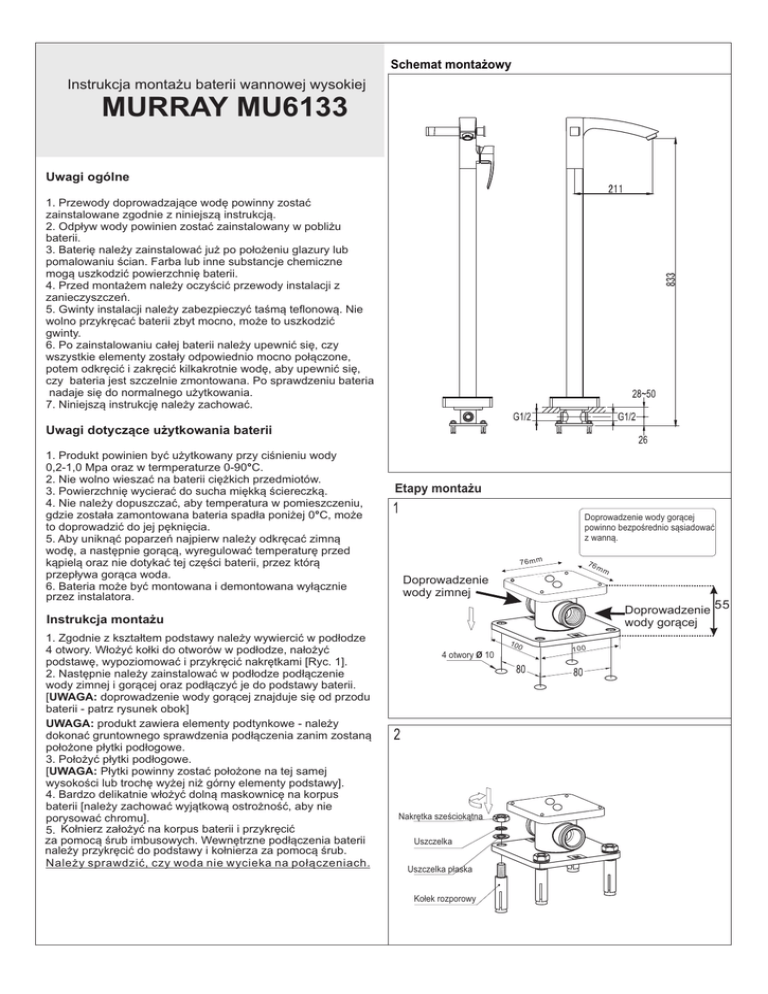 Schemat monta¿owy Instrukcja monta¿u baterii wannowej wysokiej MURRAY MU6133 Uwagi ogólne 1. Przewody doprowadzaj¹ce wodê powinny zostaæ zainstalowane zgodnie z niniejsz¹ instrukcj¹. 2. Odp³yw wody powinien zostaæ zainstalowany w pobli¿u baterii. 3. Bateriê nale¿y zainstalowaæ ju¿ po po³o¿eniu glazury lub pomalowaniu œcian. Farba lub inne substancje chemiczne mog¹ uszkodziæ powierzchniê baterii. 4. Przed monta¿em nale¿y oczyœciæ przewody instalacji z zanieczyszczeñ. 5. Gwinty instalacji nale¿y zabezpieczyæ taœm¹ teflonow¹. Nie wolno przykrêcaæ baterii zbyt mocno, mo¿e to uszkodziæ gwinty. 6. Po zainstalowaniu ca³ej baterii nale¿y upewniæ siê, czy wszystkie elementy zosta³y odpowiednio mocno po³¹czone, potem odkrêciæ i zakrêciæ kilkakrotnie wodê, aby upewniæ siê, czy bateria jest szczelnie zmontowana. Po sprawdzeniu bateria nadaje siê do normalnego u¿ytkowania. 7. Niniejsz¹ instrukcjê nale¿y zachowaæ. Uwagi dotycz¹ce u¿ytkowania baterii 1. Produkt powinien byæ u¿ytkowany przy ciœnieniu wody 0,2-1,0 Mpa oraz w termperaturze 0-90°C. 2. Nie wolno wieszaæ na baterii ciê¿kich przedmiotów. 3. Powierzchniê wycieraæ do sucha miêkk¹ œciereczk¹. 4. Nie nale¿y dopuszczaæ, aby temperatura w pomieszczeniu, gdzie zosta³a zamontowana bateria spad³a poni¿ej 0°C, mo¿e to doprowadziæ do jej pêkniêcia. 5. Aby unikn¹æ poparzeñ najpierw nale¿y odkrêcaæ zimn¹ wodê, a nastêpnie gor¹c¹, wyregulowaæ temperaturê przed k¹piel¹ oraz nie dotykaæ tej czêœci baterii, przez któr¹ przep³ywa gor¹ca woda. 6. Bateria mo¿e byæ montowana i demontowana wy³¹cznie przez instalatora. Etapy monta¿u Doprowadzenie wody gor¹cej powinno bezpoœrednio s¹siadowaæ z wann¹. 76mm 76 Doprowadzenie 55 wody gor¹cej Instrukcja monta¿u 1. Zgodnie z kszta³tem podstawy nale¿y wywierciæ w pod³odze 4 otwory. W³o¿yæ ko³ki do otworów w pod³odze, na³o¿yæ podstawê, wypoziomowaæ i przykrêciæ nakrêtkami [Ryc. 1]. 2. Nastêpnie nale¿y zainstalowaæ w pod³odze pod³¹czenie wody zimnej i gor¹cej oraz pod³¹czyæ je do podstawy baterii. [UWAGA: doprowadzenie wody gor¹cej znajduje siê od przodu baterii - patrz rysunek obok] UWAGA: produkt zawiera elementy podtynkowe - nale¿y dokonaæ gruntownego sprawdzenia pod³¹czenia zanim zostan¹ po³o¿one p³ytki pod³ogowe. 3. Po³o¿yæ p³ytki pod³ogowe. [UWAGA: P³ytki powinny zostaæ po³o¿one na tej samej wysokoœci lub trochê wy¿ej ni¿ górny elementy podstawy]. 4. Bardzo delikatnie w³o¿yæ doln¹ maskownicê na korpus baterii [nale¿y zachowaæ wyj¹tkow¹ ostro¿noœæ, aby nie porysowaæ chromu]. 5. Ko³nierz za³o¿yæ na korpus baterii i przykrêciæ za pomoc¹ œrub imbusowych. Wewnêtrzne pod³¹czenia baterii nale¿y przykrêciæ do podstawy i ko³nierza za pomoc¹ œrub. Nale¿y sprawdziæ, czy woda nie wycieka na po³¹czeniach. mm Doprowadzenie wody zimnej 100 4 otwory Ø 10 Nakrêtka szeœciok¹tna Uszczelka Uszczelka p³aska Ko³ek rozporowy 100 Przed dokrêceniem nakrêtek nale¿y upewniæ siê, ¿e dolny element pod³¹czeniowy zosta³ odpowiednio wypoziomowany. 5 Zaœlepki Poziomowanie 4 wê¿yk wody zimnej - przykrêciæ wê¿yk wody gor¹cej - przykrêciæ Korpus baterii Uwaga: po zainstalowaniu dolnego elementu pod³¹czeniowego zabezpieczyæ otwory wyp³ywowe przed zanieczyszczeniem. Wewnêtrzne doprowadzenie wody zimnej Wewnêtrzne doprowadzenie wody gor¹cej Rozetka Podstawa baterii Œruby mocuj¹ce Nakrêtki wê¿yków 6 7 Prze³¹cznik R¹czka prysznicowa Perlator Mieszacz W¹¿ prysznicowy 8 Pod³¹czenie wyp³ywowe do prysznica Po zainstalowaniu baterii nale¿y sprawdziæ, czy dzia³a ona prawid³owo i jest szczelna.