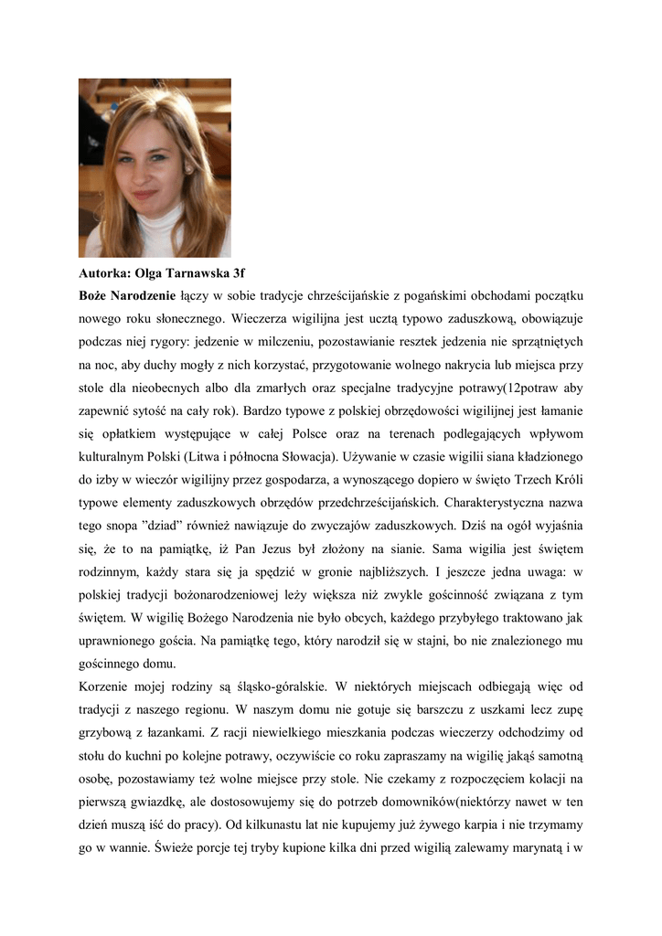 Autorka: Olga Tarnawska 3f Boże Narodzenie łączy w sobie tradycje chrześcijańskie z pogańskimi obchodami początku nowego roku słonecznego. Wieczerza wigilijna jest ucztą typowo zaduszkową, obowiązuje podczas niej rygory: jedzenie w milczeniu, pozostawianie resztek jedzenia nie sprzątniętych na noc, aby duchy mogły z nich korzystać, przygotowanie wolnego nakrycia lub miejsca przy stole dla nieobecnych albo dla zmarłych oraz specjalne tradycyjne potrawy(12potraw aby zapewnić sytość na cały rok). Bardzo typowe z polskiej obrzędowości wigilijnej jest łamanie się opłatkiem występujące w całej Polsce oraz na terenach podlegających wpływom kulturalnym Polski (Litwa i północna Słowacja). Używanie w czasie wigilii siana kładzionego do izby w wieczór wigilijny przez gospodarza, a wynoszącego dopiero w święto Trzech Króli typowe elementy zaduszkowych obrzędów przedchrześcijańskich. Charakterystyczna nazwa tego snopa ”dziad” również nawiązuje do zwyczajów zaduszkowych. Dziś na ogół wyjaśnia się, że to na pamiątkę, iż Pan Jezus był złożony na sianie. Sama wigilia jest świętem rodzinnym, każdy stara się ja spędzić w gronie najbliższych. I jeszcze jedna uwaga: w polskiej tradycji bożonarodzeniowej leży większa niż zwykle gościnność związana z tym świętem. W wigilię Bożego Narodzenia nie było obcych, każdego przybyłego traktowano jak uprawnionego gościa. Na pamiątkę tego, który narodził się w stajni, bo nie znalezionego mu gościnnego domu. Korzenie mojej rodziny są śląsko-góralskie. W niektórych miejscach odbiegają więc od tradycji z naszego regionu. W naszym domu nie gotuje się barszczu z uszkami lecz zupę grzybową z łazankami. Z racji niewielkiego mieszkania podczas wieczerzy odchodzimy od stołu do kuchni po kolejne potrawy, oczywiście co roku zapraszamy na wigilię jakąś samotną osobę, pozostawiamy też wolne miejsce przy stole. Nie czekamy z rozpoczęciem kolacji na pierwszą gwiazdkę, ale dostosowujemy się do potrzeb domowników(niektórzy nawet w ten dzień muszą iść do pracy). Od kilkunastu lat nie kupujemy już żywego karpia i nie trzymamy go w wannie. Świeże porcje tej tryby kupione kilka dni przed wigilią zalewamy marynatą i w wigilijny dzień są gotowe do smażeń. Moim zdaniem tak przyrządzona ryba według przepisu dziadka górala smakuje znacznie lepiej niż tradycyjna wersja. Nie stroimy żywej choinki lecz sztuczną ale nadal wysyłamy pocztówkowe życzenia. Moim zdaniem stare polskie obyczaje są znacznie piękniejsze od tych, z innych krajów, ale aby możliwe było ich pielęgnowanie musimy je dostosować do możliwości współczesnego życia.