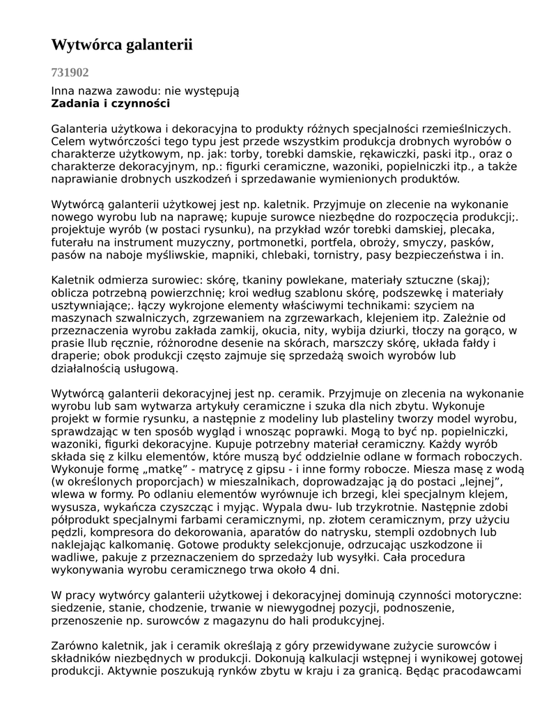 Wytwórca galanterii 731902 Inna nazwa zawodu: nie występują Zadania i czynności Galanteria użytkowa i dekoracyjna to produkty różnych specjalności rzemieślniczych. Celem wytwórczości tego typu jest przede wszystkim produkcja drobnych wyrobów o charakterze użytkowym, np. jak: torby, torebki damskie, rękawiczki, paski itp., oraz o charakterze dekoracyjnym, np.: figurki ceramiczne, wazoniki, popielniczki itp., a także naprawianie drobnych uszkodzeń i sprzedawanie wymienionych produktów. Wytwórcą galanterii użytkowej jest np. kaletnik. Przyjmuje on zlecenie na wykonanie nowego wyrobu lub na naprawę; kupuje surowce niezbędne do rozpoczęcia produkcji;. projektuje wyrób (w postaci rysunku), na przykład wzór torebki damskiej, plecaka, futerału na instrument muzyczny, portmonetki, portfela, obroży, smyczy, pasków, pasów na naboje myśliwskie, mapniki, chlebaki, tornistry, pasy bezpieczeństwa i in. Kaletnik odmierza surowiec: skórę, tkaniny powlekane, materiały sztuczne (skaj); oblicza potrzebną powierzchnię; kroi według szablonu skórę, podszewkę i materiały usztywniające;. łączy wykrojone elementy właściwymi technikami: szyciem na maszynach szwalniczych, zgrzewaniem na zgrzewarkach, klejeniem itp. Zależnie od przeznaczenia wyrobu zakłada zamkij, okucia, nity, wybija dziurki, tłoczy na gorąco, w prasie llub ręcznie, różnorodne desenie na skórach, marszczy skórę, układa fałdy i draperie; obok produkcji często zajmuje się sprzedażą swoich wyrobów lub działalnością usługową. Wytwórcą galanterii dekoracyjnej jest np. ceramik. Przyjmuje on zlecenia na wykonanie wyrobu lub sam wytwarza artykuły ceramiczne i szuka dla nich zbytu. Wykonuje projekt w formie rysunku, a następnie z modeliny lub plasteliny tworzy model wyrobu, sprawdzając w ten sposób wygląd i wnosząc poprawki. Mogą to być np. popielniczki, wazoniki, figurki dekoracyjne. Kupuje potrzebny materiał ceramiczny. Każdy wyrób składa się z kilku elementów, które muszą być oddzielnie odlane w formach roboczych. Wykonuje formę „matkę” - matrycę z gipsu - i inne formy robocze. Miesza masę z wodą (w określonych proporcjach) w mieszalnikach, doprowadzając ją do postaci „lejnej”, wlewa w formy. Po odlaniu elementów wyrównuje ich brzegi, klei specjalnym klejem, wysusza, wykańcza czyszcząc i myjąc. Wypala dwu- lub trzykrotnie. Następnie zdobi półprodukt specjalnymi farbami ceramicznymi, np. złotem ceramicznym, przy użyciu pędzli, kompresora do dekorowania, aparatów do natrysku, stempli ozdobnych lub naklejając kalkomanię. Gotowe produkty selekcjonuje, odrzucając uszkodzone ii wadliwe, pakuje z przeznaczeniem do sprzedaży lub wysyłki. Cała procedura wykonywania wyrobu ceramicznego trwa około 4 dni. W pracy wytwórcy galanterii użytkowej i dekoracyjnej dominują czynności motoryczne: siedzenie, stanie, chodzenie, trwanie w niewygodnej pozycji, podnoszenie, przenoszenie np. surowców z magazynu do hali produkcyjnej. Zarówno kaletnik, jak i ceramik określają z góry przewidywane zużycie surowców i składników niezbędnych w produkcji. Dokonują kalkulacji wstępnej i wynikowej gotowej produkcji. Aktywnie poszukują rynków zbytu w kraju i za granicą. Będąc pracodawcami prowadzą rozliczenia finansowe dotyczące zatrudnienia i rentowności firmy zgodnie z obowiązującymi przepisami o prowadzeniu działalności gospodarczej. Wymagania psychologiczne Ze względu na różnorodność czynności ruchowych, które wytwórca galanterii wykonuje, a są one związane z obróbką surowca, obsługą urządzeń i wytworzeniem artykułu o charakterze użytkowym bądź dekoracyjnym, niezwykle ważne w tym zawodzie są: duża sprawność manualna, bardzo dobry wzrok, prawidłowa koordynacja wzrokowo- ruchowa i prawidłowe czucie dotykowe. Wytwórcę powinna cechować wytrwałość, cierpliwość i dokładność; musi bezwzględnie przestrzegać zasady bhp oraz instrukcje produkcyjne. Często efekt końcowy - wyrób kaletniczy lub ceramiczny - jest widoczny po kilku dniach pracy. Nieodzowna jest umiejętność pracowania w warunkach monotonnych, gdyż czynności w tym zawodzie bardzo często mają charakter zrutynizowany. W pracy związanej z wytwarzaniem przedmiotów spełniających funkcje dekoracyjne niezbędne są uzdolnienia artystyczne, zwłaszcza plastyczne: projektowanie, malowanie, rzeźbienie. Ze względu na zespołowy charakter pracy nieodzowna jest umiejętność współdziałania, a przy załatwianiu spraw z klientem - umiejętność nawiązywania kontaktów z ludźmi. Wymagania fizyczne i zdrowotne PRACĘ WYTWÓRCY GALANTERII MOŻNA ZALICZYĆ DO ŚREDNIO CIĘŻKICH. WYMAGANIA FIZYCZNE I ZDROWOTNE SĄ ZRÓŻNICOWANE I UZALEŻNIONE OD PRODUKOWANEGO ASORTYMENTU I STANOWISKA PRACY. NAJWIĘKSZE ZNACZENIE W TYM ZAWODZIE MA DUŻA SPRAWNOŚĆ NARZĄDU WZROKU, PRAWIDŁOWY ZMYSŁ DOTYKU ORAZ DUŻA SPRAWNOŚĆ UKŁADU MIĘŚNIOWEGO I KOSTNO-STAWOWEGO. NIEODZOWNA JEST TAKŻE DOBRA SPRAWNOŚĆ UKŁADÓW ODDECHOWEGO I KRĄŻENIA. Bezwzględne przeciwwskazania do zawodu dotyczą chorób: padaczka i inne choroby centralnego układu nerwowego, psychozy, poważne, nie podlegające korekcji wady wzroku, poważne uszkodzenie słuchu, dysfunkcje w obrębie kończyn górnych, przewlekłe choroby upośledzające sprawność organizmu. Względne przeciwwskazania to: niedosłuch lekkiego stopnia, astma, cukrzyca, alergie, schorzenia skóry, obniżona sprawność kończyn dolnych. W zawodzie tym istnieje możliwość zatrudnienia - na niektórych stanowiskach pracy (kaletnik, zdobienie ceramiki) - osób niepełnosprawnych: niedosłyszących, z dysfunkcją kończyn dolnych, a nawet poruszających się na wózkach inwalidzkich. Warunki podjęcia pracy w zawodzie Do podjęcia pracy jako wytwórca galanterii trzeba mieć wykształcenie podstawowe, a zalecane jest zawodowe. Można je zdobyć w Zasadniczej Szkole Zawodowej, równocześnie podejmując praktyczną n