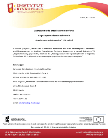 Lublin, 30.12.2010 Zaproszenie do przedstawienia oferty na przeprowadzenie szkolenia „Krawiectwo z projektowaniem” (170 godzin) w ramach projektu „Zmiana roli – szkolenia zawodowe dla osób odchodzących z rolnictwa” współfinansowanego ze środków Europejskiego Funduszu Społecznego w ramach Priorytetu VIII „Regionalne kadry gospodarki”, Działanie 8.1 „Rozwój pracowników i przedsiębiorstw w regionie”, Poddziałanie 8.1.2 „Wsparcie procesów adaptacyjnych i modernizacyjnych w regionie” Zamawiający: Europejski Dom Spotkao – Fundacja Nowy Staw 20-029 Lublin, ul. M. Skłodowskiej - Curie 3 REGON: 430308156 NIP: 946-17-71-036 Biuro projektu „Zmiana roli – szkolenia zawodowe dla osób odchodzących z rolnictwa” Ul. M. Skłodowskiej - Curie 3 20-029 Lublin Telefon: 81 536 10 95 Fax: 81 534 61 92 e-mail: [email protected] Projekt „Zmiana roli-szkolenia zawodowe dla osób odchodzących z rolnictwa” współfinansowany przez Unię Europejską w ramach Europejskiego Funduszu Społecznego Biuro projektu: tel.: (81) 536 10 95, e-mail: [email protected] I. Opis przedmiotu zamówienia Nazwa szkolenia: Krawiectwo z projektowaniem Ilośd godzin dydaktycznych na jedną grupę 170 (1 godzina dydaktyczna– 45 min.) Ilośd godzin dydaktycznych dziennie 8 System zajęd: W każdym tygodniu 2 – 3 dni robocze Godziny zajęd: 9:00-15:30 Ilośd grup szkoleniowych: 1 Liczba osób w grupie: 16 Miejsce realizacji szkolenia: Lokalizacja w centrum Lublina Termin realizacji: Styczeo – maj 2011 Materiały szkoleniowe: Dla każdego uczestnika: - 1 notatnik A4 w kratkę, 1 segregator i 1 długopis, - skrypt z zajęd i materiały ksero tematycznie związane z programem szkolenia - materiały niezbędne do realizacji teoretycznej i praktycznej części kursu (dostęp do pracowni wyposażonej w maszyny do szycia, materiałów typu igły krawieckie, maszyny, szpilki, centymetry, papier do projektowania, mydełka krawieckie) Wykładowcy z wykształceniem wyższym kierunkowym lub wykształceniem wyższym oraz doświadczeniem zawodowym min. 1 rok w pracy na stanowisku merytorycznie tożsamym z zakresem przedmiotowym szkolenia. Wykładowcy powinni posiadad uprawnienia pedagogiczne lub praktykę w prowadzeniu zajęd szkoleniowych dla osób dorosłych. Prowadzący: Projekt „Zmiana roli-szkolenia zawodowe dla osób odchodzących z rolnictwa” współfinansowany przez Unię Europejską w ramach Europejskiego Funduszu Społecznego Biuro projektu: tel.: (81) 536 10 95, e-mail: [email protected] Założenia organizacyjne: Wykonawca zobowiązany będzie zapewnid: na żądanie wykładowców sprzęt oraz inne pomoce dydaktyczne niezbędne do przeprowadzenia szkolenia (flipchart, projektor multimedialny, rzutnik na folię, ekran, kamera video, telewizor, odtwarzacz) - wynajęcie sali szkoleniowej i pracowni wyposażonej w maszyny do szycia, materiały typu igły krawieckie ręczne , maszynowe, szpilki, nożyce, centymetry, papier do projektowania, mydełka krawieckie itp. (w cenie szkolenia). - zapewnienie min. 40 % zajęd praktycznych w ramach szkolenia - zapewnienie 1 – 2 dni zajęd praktycznych poza salą szkoleniową/pracownią Egzamin podsumowujący na zakooczenie szkolenia składający się z pisemnej części teoretycznej (test jednokrotnego wyboru) oraz części praktycznej – zadania związanego z tematyką szkolenia (egzamin opracowany przez wykładowców prowadzących zajęcia dydaktyczne na szkoleniu) przewidziany na nie więcej niż 3 godziny szkoleniowe przeprowadzony przez Komisję Egzaminacyjną. Zostaną wydane zaświadczenia zgodne z wymogami postawionymi w Rozporządzeniu Ministra Edukacji i Nauki z dn. 03.02.2006r. w sprawie uzyskiwania i uzupełniania przez osoby dorosłe wiedzy ogólnej, umiejętności i kwalifikacji zawodowych w formach pozaszkolnych. - Sposób sprawdzania efektów nauczania: II. Obowiązki Wykonawcy 1. Organizacja i przeprowadzenie szkolenia. 2. Opracowanie programu i harmonogramu szkolenia. 3. Zapewnienie materiałów szkoleniowych (notatnik, długopis, skrypt z zajęd) oraz niezbędnych materiałów do przeprowadzenia zajęd praktycznych (dostęp do pracowni wyposażonej w maszyny do szycia, materiały typu igły krawieckie, maszyny, szpilki, centymetry, papier do projektowania, mydełka krawieckie itp.). Zapewnienie kadry dydaktycznej: wykładowcy z wykształceniem wyższym kierunkowym lub wykształceniem wyższym oraz doświadczeniem zawodowym min. 1 rok w pracy na stanowisku merytorycznie tożsamym z zakresem przedmiotowym szkolenia. Wykładowcy winni posiadad uprawnienia pedagogiczne lub Projekt „Zmiana roli-szkolenia zawodowe dla osób odchodzących z rolnictwa” współfinansowany przez Unię Europejską w ramach Europejskiego Funduszu Społecznego Biuro projektu: tel.: (81) 536 10 95, e-mail: [email protected] praktykę w prowadzeniu zajęd szkoleniowych dla osób dorosłych. 4. Zapewnienie sali szkoleniowej wraz z niezbędnym wyposażeniem. 5. Zapewnienie bezpiecznych i higienicznych warunków pracy. 6. Przeprowadzenie egzaminu koocowego na zakooczenie szkolenia. 7. Wydanie zaświadczenia o ukooczeniu kursu (zgodnie z rozporządzeniem Ministra Edukacji i Nauki z dnia 03.02.2006 w sprawie uzyskiwania i uzupełniania przez osoby dorosłe wiedzy ogólnej, umiejętności i kwalifikacji zawodowych w formach pozaszkolnych) oraz zaświadczeo o podniesieniu kwalifikacji zawodowych. III. Uprawnieni Wykonawcy Warunkiem udziału w postępowaniu jest spełnianie następujących kryteriów: 1. Posiadanie uprawnieo do wykonywania określonej działalności. 2. Posiadanie niezbędnej wiedzy i doświadczenia oraz potencjału technicznego do organizacji szkoleo. 3. Sytuacja ekonomiczna zapewniająca wykonanie zamówienia. IV. Przygotowanie oferty: 1. Oferta powinna byd przygotowana na wzorze stanowiącym załącznik nr 1 do zaproszenia do składania ofert i powinna zawierad - proponowany termin realizacji szkolenia (termin rozpoczęcia i zakooczenia) - o
