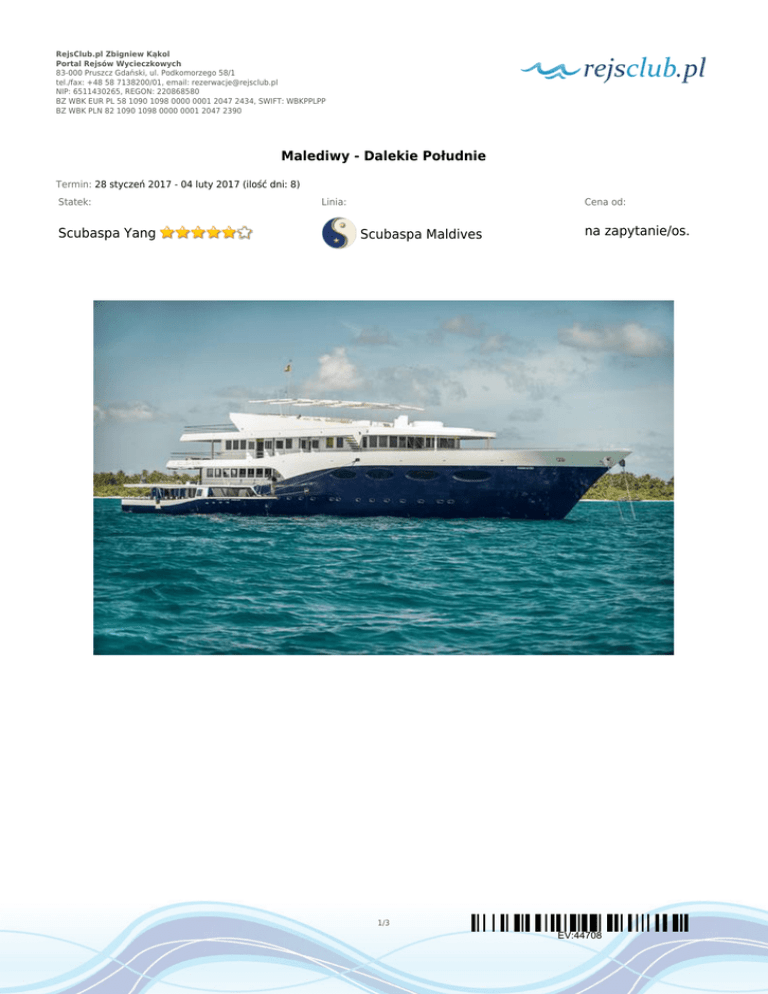 RejsClub.pl Zbigniew Kąkol Portal Rejsów Wycieczkowych 83-000 Pruszcz Gdański, ul. Podkomorzego 58/1 tel./fax: +48 58 7138200/01, email: [email protected] NIP: 6511430265, REGON: 220868580 BZ WBK EUR PL 58 1090 1098 0000 0001 2047 2434, SWIFT: WBKPPLPP BZ WBK PLN 82 1090 1098 0000 0001 2047 2390 Malediwy - Dalekie Południe Termin: 28 styczeń 2017 - 04 luty 2017 (ilość dni: 8) Statek: Scubaspa Yang Linia: Cena od: Scubaspa Maldives na zapytanie/os. 1/3 EV:44708 RejsClub.pl Zbigniew Kąkol Portal Rejsów Wycieczkowych 83-000 Pruszcz Gdański, ul. Podkomorzego 58/1 tel./fax: +48 58 7138200/01, email: [email protected] NIP: 6511430265, REGON: 220868580 BZ WBK EUR PL 58 1090 1098 0000 0001 2047 2434, SWIFT: WBKPPLPP BZ WBK PLN 82 1090 1098 0000 0001 2047 2390 TRASA REJSU dzień 1 Data Port Wpłynięcie Wypłynięcie sobota 28.01.2017 Kooddoo --:-- --:-- Legenda Malediwy Przywitanie na lotnisku, transfer na statek, koktajl powitalny i zakwaterowanie w kabinie. Prezentacja załogi i szkolenie z zakresu bezpieczeństwa. dzień 2 niedziela 29.01.2017 Boaddoo House Reef --:-- --:-- --:-- --:-- --:-- --:-- --:-- --:-- --:-- --:-- --:-- --:-- --:-- --:-- --:-- --:-- --:-- --:-- --:-- --:-- --:-- --:-- --:-- --:-- Malediwy Poranne nurkowanie. dzień 2 Vilingili Kandu niedziela 29.01.2017 Malediwy Drugie nurkowanie. dzień 2 Nilandhoo Kandu niedziela 29.01.2017 Malediwy Trzecie nurkowanie. dzień 3 poniedziałek 30.01.2017 Gemanafushi Muli Malediwy Poranne nurkowanie. dzień 3 Maareha Kandu poniedziałek 30.01.2017 Malediwy Drugie nurkowanie. dzień 3 Kondey Kandu poniedziałek 30.01.2017 Malediwy Trzecie nurkowanie. dzień 4 Fuvamullah wtorek 31.01.2017 Malediwy Pierwsze i drugie nurkowanie. dzień 5 Koattey Muli środa 01.02.2017 Malediwy Poranne nurkowanie. dzień 5 Kuda Kandu środa 01.02.2017 Malediwy Drugie nurkowanie. dzień 5 środa 01.02.2017 British Loyalty Wreck Malediwy Trzecie nurkowanie dzień 6 czwartek 02.02.2017 Fuvamullah Malediwy Pierwsze i drugie nurkowanie. dzień 7 piątek 03.02.2017 Gadhdhoo Kandu Malediwy 2/3 EV:44708 RejsClub.pl Zbigniew Kąkol Portal Rejsów Wycieczkowych 83-000 Pruszcz Gdański, ul. Podkomorzego 58/1 tel./fax: +48 58 7138200/01, email: [email protected] NIP: 6511430265, REGON: 220868580 BZ WBK EUR PL 58 1090 1098 0000 0001 2047 2434, SWIFT: WBKPPLPP BZ WBK PLN 82 1090 1098 0000 0001 2047 2390 Data Port Wpłynięcie Wypłynięcie Maareha Kandu --:-- --:-- --:-- --:-- --:-- --:-- Legenda Poranne nurkowanie. dzień 7 piątek 03.02.2017 Malediwy Drugie nurkowanie. dzień 7 piątek 03.02.2017 Coral Garden Malediwy Trzecie nurkowanie dzień 8 sobota 04.02.2017 Kooddoo Malediwy Pokazane w tabelce punkty na trasie to w większości miejsca nurkowe. Elementy trasy mogą ulec zmianie w zależności od pogody lub warunków. CENNIK Cena katalogowa Kabina zewnętrzna z oknem Suite (apartament) Kabina jednoosobowa 3 osoba dorosła w kabinie Cena promocyjna $2 610.00 od $2 901.00 +50% zniżka 25% Uwaga! Ceny za osobę w kabinie dwuosobowej. Cena zawiera: zakwaterowanie w wybranej kabinie - 7 noclegów; serwis kabinowy; serwis bagażowy podczas wejścia i zejścia ze statku; pełne wyżywienie - 3 posiłki dziennie, owoce i przekąski między posiłkami; napoje serwowane do śniadania oraz woda do lunchu i kolacji; woda w kabinie i butelkowana bez ograniczeń; drink powitalny; udział we wszystkich imprezach organizowanych podczas rejsu, m.in.: BBQ na plaży, dyskoteka, kino pod gwiazdami, występy lokalnych zespołów; korzystanie z zaplecza sportowo - rekreacyjnego znajdującego się na pokładzie statku (jacuzzi, sala fitness, joga, sprzęt do snorkelingu, kajak); wycieczki na lokalne wyspy; transfery lotnisko - statek - lotnisko (wyłącznie w dniu rozpoczęcia i zakończenia rejsu). W przypadku przylotu lub odlotu w trakcie trwania rejsu z przyjemnością zorganizujemy dla Państwa transport za dodatkową opłatą); bezpłatny nitrox dla nurków. Dodatkowo jeden z pakietów do wyboru: Podstawowe pakiety wakacyjne: SCUBA HOLIDAY - 15/17 nurkowań + 1 zabieg w SPA; SPA HOLIDAY - 12 zabiegów w SPA; SCUBA&SPA HOLIDAY - 6 nurkowań + 6 zabiegów w SPA. Specjalne pakiety wakacyjne (limitowane do 2 na rejs): SCUBA TASTER HOLIDAY – kurs „Discover Scuba Diving Course” + 2 nurkowania + 6 zabiegów w SPA; SPA TASTER HOLIDAY – 10 nurkowań + 2 zabiegi w SPA. Cena nie zawiera: kosztów przelotu na Malediwy; ewentualnych noclegów w hotelu przed/po rejsie; korzystania z baru oraz napojów zamawianych w restauracji; uznaniowych napiwków dla obsługi statku; zabiegów w Spa i nurkowań zamawianych poza wybranym pakietem; obowiązkowego ubezpieczenia turystycznego i nurkowego; wydatków osobistych; sprzętu nurkowego (za wyjątkiem kursu dla początkujących); Green Tax 42 USD za osobe (płatne na pokładzie). 3/3 EV:44708