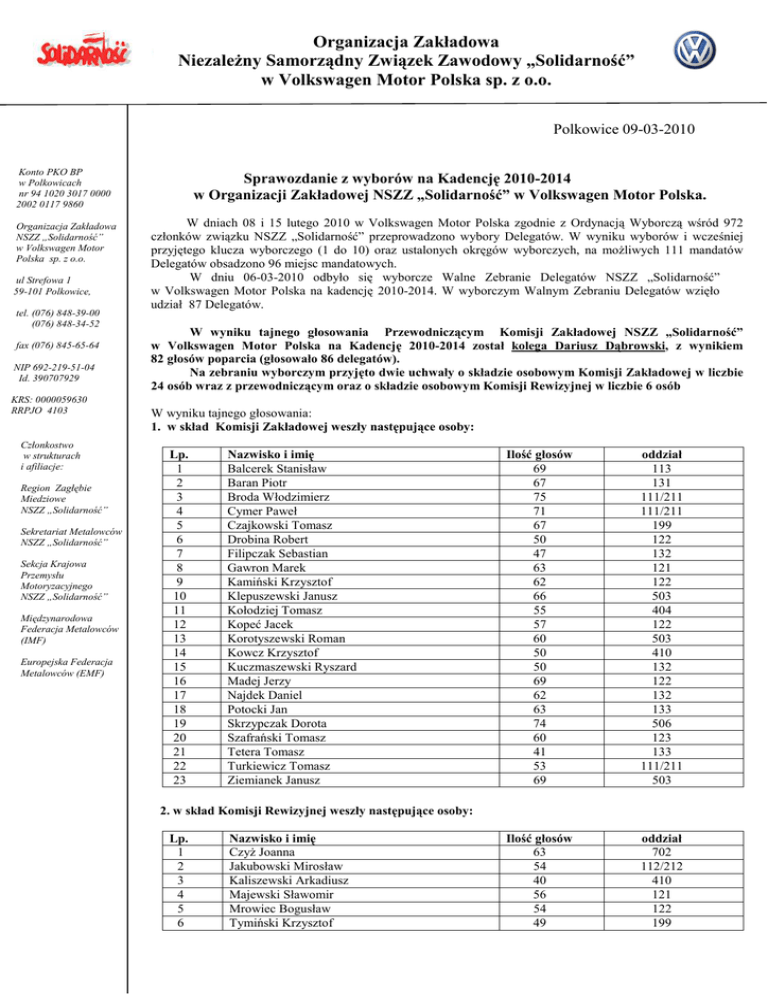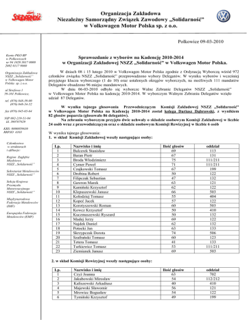 Organizacja Zakładowa NiezaleŜny Samorządny Związek Zawodowy „Solidarność” w Volkswagen Motor Polska sp. z o.o. Polkowice 09-03-2010 Konto PKO BP w Polkowicach nr 94 1020 3017 0000 2002 0117 9860 Organizacja Zakładowa NSZZ „Solidarność” w Volkswagen Motor Polska sp. z o.o. ul Strefowa 1 59-101 Polkowice, tel. (076) 848-39-00 (076) 848-34-52 fax (076) 845-65-64 NIP 692-219-51-04 Id. 390707929 KRS: 0000059630 RRPJO 4103 Członkostwo w strukturach i afiliacje: Region Zagłębie Miedziowe NSZZ „Solidarność” Sekretariat Metalowców NSZZ „Solidarność” Sekcja Krajowa Przemysłu Motoryzacyjnego NSZZ „Solidarność” Międzynarodowa Federacja Metalowców (IMF) Europejska Federacja Metalowców (EMF) Sprawozdanie z wyborów na Kadencję 2010-2014 w Organizacji Zakładowej NSZZ „Solidarność” w Volkswagen Motor Polska. W dniach 08 i 15 lutego 2010 w Volkswagen Motor Polska zgodnie z Ordynacją Wyborczą wśród 972 członków związku NSZZ „Solidarność” przeprowadzono wybory Delegatów. W wyniku wyborów i wcześniej przyjętego klucza wyborczego (1 do 10) oraz ustalonych okręgów wyborczych, na moŜliwych 111 mandatów Delegatów obsadzono 96 miejsc mandatowych. W dniu 06-03-2010 odbyło się wyborcze Walne Zebranie Delegatów NSZZ „Solidarność” w Volkswagen Motor Polska na kadencję 2010-2014. W wyborczym Walnym Zebraniu Delegatów wzięło udział 87 Delegatów. W wyniku tajnego głosowania Przewodniczącym Komisji Zakładowej NSZZ „Solidarność” w Volkswagen Motor Polska na Kadencję 2010-2014 został kolega Dariusz Dąbrowski, z wynikiem 82 głosów poparcia (głosowało 86 delegatów). Na zebraniu wyborczym przyjęto dwie uchwały o składzie osobowym Komisji Zakładowej w liczbie 24 osób wraz z przewodniczącym oraz o składzie osobowym Komisji Rewizyjnej w liczbie 6 osób W wyniku tajnego głosowania: 1. w skład Komisji Zakładowej weszły następujące osoby: Lp. 1 2 3 4 5 6 7 8 9 10 11 12 13 14 15 16 17 18 19 20 21 22 23 Nazwisko i imię Balcerek Stanisław Baran Piotr Broda Włodzimierz Cymer Paweł Czajkowski Tomasz Drobina Robert Filipczak Sebastian Gawron Marek Kamiński Krzysztof Klepuszewski Janusz Kołodziej Tomasz Kopeć Jacek Korotyszewski Roman Kowcz Krzysztof Kuczmaszewski Ryszard Madej Jerzy Najdek Daniel Potocki Jan Skrzypczak Dorota Szafrański Tomasz Tetera Tomasz Turkiewicz Tomasz Ziemianek Janusz Ilość głosów 69 67 75 71 67 50 47 63 62 66 55 57 60 50 50 69 62 63 74 60 41 53 69 oddział 113 131 111/211 111/211 199 122 132 121 122 503 404 122 503 410 132 122 132 133 506 123 133 111/211 503 Ilość głosów 63 54 40 56 54 49 oddział 702 112/212 410 121 122 199 2. w skład Komisji Rewizyjnej weszły następujące osoby: Lp. 1 2 3 4 5 6 Nazwisko i imię CzyŜ Joanna Jakubowski Mirosław Kaliszewski Arkadiusz Majewski Sławomir Mrowiec Bogusław Tymiński Krzysztof Organizacja Zakładowa NiezaleŜny Samorządny Związek Zawodowy „Solidarność” w Volkswagen Motor Polska sp. z o.o. Konto PKO BP w Polkowicach nr 94 1020 3017 0000 2002 0117 9860 Organizacja Zakładowa NSZZ „Solidarność” w Volkswagen Motor Polska sp. z o.o. ul Strefowa 1 59-101 Polkowice, tel. (076) 848-39-00 (076) 848-34-52 3. Na delegatów na Walne Zebranie Delegatów Regionu „Zagłębie Miedziowe” NSZZ „Solidarność” w liczbie 7 osób zostali wybrani następujący koledzy: Lp. 1 2 3 4 5 6 7 Nazwisko i imię Dąbrowski Dariusz Broda Włodzimierz Mrowiec Bogusław Gawron Marek Madej Jerzy Klepuszewski Janusz Ściana Jarosław Ilość głosów oddział 55 51 48 47 45 46 44 112/212 111/211 122 121 122 503 122 fax (076) 845-65-64 NIP 692-219-51-04 Id. 390707929 KRS: 0000059630 RRPJO 4103 4. Na delegatów na Walne Zebranie Delegatów sekcji Krajowej Przemysłu Motoryzacyjnego NSZZ „Solidarność” w liczbie 4 osób zostali wybrani następujący koledzy: Lp. Członkostwo w strukturach i afiliacje: Region Zagłębie Miedziowe NSZZ „Solidarność” Sekretariat Metalowców NSZZ „Solidarność” Sekcja Krajowa Przemysłu Motoryzacyjnego NSZZ „Solidarność” Międzynarodowa Federacja Metalowców (IMF) Europejska Federacja Metalowców (EMF) 1 2 3 4 Nazwisko i imię Dąbrowski Dariusz Klepuszewski Janusz Kamiński Krzysztof Czajkowski Tomasz Ilość głosów oddział 52 42 40 38 112/212 503 122 199 Wyciąg z protokołów Komisji Skrutacyjnej NSZZ „Solidarność” w Volkswagen Motor Polska sp. z o.o. z dnia 06.03.2010
