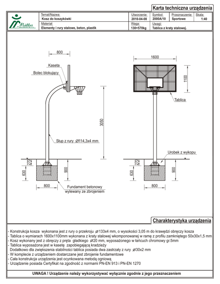 Karta techniczna urz¹dzenia Temat/Nazwa: Kosz do koszykówki Materia³: Elementy i rury stalowe, beton, plastik Utworzenie: 2010-04-08 Waga: 130+570kg Przeznaczenie: Skala: Symbol: 2000A/10 Sportowe 1:40 Uwagi: Tablica z kraty stalowej. 800 1600 Kaseta 1100 Bolec blokuj¹cy 3050 Tablica S³up z rury 114,3x4 mm Fundament betonowy wylewany ze zbrojeniem 900 270 800 630 630 900 270 Urobek z wykopu 800 Charakterystyka urz¹dzenia - Konstrukcja kosza wykonana jest z rury o przekroju 133x4 mm, o wysokoœci 3,05 m do krawêdzi obrêczy kosza - Tablica o wymiarach 1600x1100mm wykonana z kraty stalowej wkomponowanej w ramê z profilu zamkniêtego 50x30x1,5 mm - Kosz wykonany jest z obrêczy z prêta g³adkiego 20 mm, wyposa¿onego w ³añcuch chromowy gr.5mm - Tablica wyposa¿ona jest w kasetê zapobiegaj¹c¹ kradzie¿y Dodatkowo dla zwiêkszenia stabilnoœci tablica posiada dwa zastrza³y z rury 30x2 mm - W komplecie z urz¹dzeniem dostarczane jest zbrojenie fundamentowe - Ca³a konstrukcja urz¹dzenia jest ocynkowana metod¹ ogniow¹ - Urz¹dzenie posiada Certyfikat na zgodnoœæ z normami PN-EN 913 i PN-EN 1270 UWAGA ! Urz¹dzenie nale¿y wykorzystywaæ wy³¹cznie zgodnie z jego przeznaczeniem
