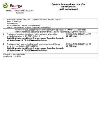 ENERGA – OPERATOR SA. Oddział w Koszalinie Ogłoszenie o wyniku przetargów na wykonanie robót budowlanych Zamawiający: ENERGA-OPERATOR SA z siedzibą w Gdańsku Oddział w Koszalinie adres: ul. Morska 10, 75-950 Koszalin NIP 583-000-11-90; REGON: 190275904-00050 internet: energa-operator.pl e-mail : [email protected] 1 2 W wyniku rozstrzygnięć przetargów zamieszczonych w ogłoszeniu nr 694/W/16/Szczecinek wybrano najkorzystniejsze oferty z cenami brutto – złożone przez następujących Wykonawców: Przyłączenie budynku mieszkalnego - wielorodzinnego w Szczecinku ZN/5360/5454MZI/2016/1600990 ul. Wodociągowa dz. nr 3/6 OBI/54/1600990 12 103,20 zł. Zakład Instalatorstwa Elektro-Energetycznego Eugeniusz Brzostek, ul. Spółdzielcza 26, 72-410 Wysoka Kamieńska Przyłączenie stacji bazowej telefonii komórkowej w miejscowości Porost dz. nr 219, gm. Bobolice OBI/54/1502459 Zakład Instalatorstwa Elektro-Energetycznego Eugeniusz Brzostek, ul. Spółdzielcza 26, 72-410 Wysoka Kamieńska Sporządził(a): Joanna Kucharska Koszalin, dnia 21-12-2016 ZN/5361/5454MZI/2016/1502459 10 725,60 zł.