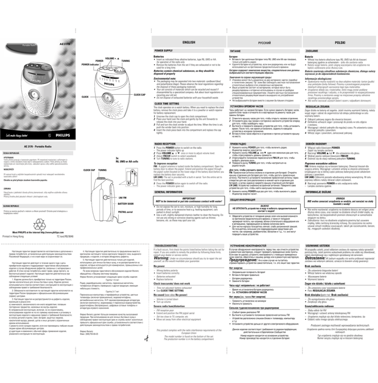 ENGLISH AE2170 Portable Radio POWER SUPPLY POWER TUNNI TUNNING NG VOLUM VOLUMEE VOLUME 4 , 3 POWER POWER indicator POWER Batteries • Insert as indicated three alkaline batteries, type R6, UM3 or AA. for operation of the radio only • Remove the batteries from the set if they are exhausted or not to be used for a long time. Batteries contain chemical substances, so they should be disposed of properly TUNING TUNNING VOLUME AE2170 Portable Radio LW LW FM FM 530 530 88 88 630 630 92 92 800 800 96 96 AE2170 100 10000 100 100 130 13000 104 104 1600 1600 108 108 KHz KHz MHz MHz LW FM 530 88 630 800 92 96 Portable 1000 100 Radio 1300 104 1600 108 Environmental note: KHz MHz CLOCK CAP CLOCK • The packaging may be separated into two materials: cardboard (box) and polyethylene (bags). Please observe the local regulations regarding the disposal of these packaging materials. • Your set consists of materials which can be recycled and reused if disassembled by a specialized company. Ask about local regulations on recycling your old set. • Do not dispose of exhausted batteries with your household waste. POLSKI êìëëäàâ èàíÄçàÖ Å‡Ú‡ÂË • ÇÒÚ‡‚¸Ú ÚË ˘ÂÎÓ˜Ì˚ ·‡Ú‡ÂË ÚËÔ‡ R6, UM3 ËÎË ÄÄ Í‡Í ÔÓ͇Á‡ÌÓ, ÚÓθÍÓ ‰Îfl ‡·ÓÚ˚ ‡‰ËÓ. • 쉇ÎËÚ ·‡Ú‡ÂË ËÁ ÛÒÚÓÈÒÚ‚‡, ÂÒÎË ÓÌË ‡Áfl‰ËÎËÒ¸ ËÎË Ì ·Û‰ÛÚ ËÒÔÓθÁÓ‚‡Ú¸Òfl ̇ ÔÓÚflÊÂÌËË ÔÓ‰ÓÎÊËÚÂθÌÓ„Ó ‚ÂÏÂÌË. ŇڇÂË ÒÓ‰ÂÊ‡Ú ıËÏ˘ÂÒÍË ‚¢ÂÒÚ‚‡, ÒΉӂ‡ÚÂθÌÓ ÓÌË ‰ÓÎÊÌ˚ ‚˚·‡Ò˚‚‡Ú¸Òfl ÒÓÓÚ‚ÂÚÒÚ‚Û˛˘ËÏ Ó·‡ÁÓÏ. á‡Ï˜‡ÌËfl ÔÓ Óı‡Ì ÓÍÛʇ˛˘ÂÈ Ò‰˚: • ìÔ‡Íӂ͇ ÏÓÊÂÚ ·˚Ú¸ ‡Á‰ÂÎÂ̇ ̇ ‰‚‡ χÚ¡·: ͇ÚÓÌ (ÍÓӷ͇) Ë ÔÓÎË˝ÚËÎÂÌ (ϯÍË). è ÓÒËÏ Ç‡Ò Òӷβ‰‡Ú¸ ÏÂÒÚÌ˚ ÔÓÒÚ‡ÌÓ‚ÎÂÌËfl ÓÚÌÓÒËÚÂθÌÓ ‚˚·ÓÒ‡ ˝ÚËı ÛÔ‡ÍÓ‚Ó˜Ì˚ı χÚ¡ÎÓ‚. • LJ¯Â ÛÒÚÓÈÒÚ‚Ó ÒÓÒÚÓËÚ ËÁ χÚ¡ÎÓ‚, ÍÓÚÓ˚ ÏÓ„ÛÚ ·˚Ú¸ ˆËÍÛÎËÓ‚‡Ì˚ Ë ‚ÚÓ˘ÌÓ ËÒÔÓθÁÓ‚‡Ì˚ ‚ ÒÎÛ˜‡Â Ëı ‡Á·ÓÍË ÒÔˆˇÎËÁËÓ‚‡ÌÌ˚Ï Ô‰ÔËflÚËÂÏ. ìÁ̇ÈÚ ÏÂÒÚÌ˚ ÔÓÒÚ‡ÌÓ‚ÎÂÌËfl ÓÚÌÓÒËÚÂθÌÓ ÂˆËÍÛÎflˆËË ‚‡¯Â„Ó ‚˚¯Â‰¯Â„Ó ËÁ ÛÔÓÚ·ÎÂÌËfl ÛÒÚÓÈÒÚ‚‡. • ç ‚˚·‡Ò˚‚‡ÈÚ ·‡Ú‡ÂË ‚ÏÂÒÚÂ Ò ‚‡¯ËÏË ·˚ÚÓ‚˚ÏË ÓÚıÓ‰‡ÏË. ZASILANIE Baterie • W¬o¿yæ trzy baterie alkaliczne typu R6, UM3 lub AA do kieszeni bateryjnej zgodnie ze schematem - tylko dla zasilania radia. • Nale¿y wyjåæ baterie, je¿eli ulegnå wyczerpaniu lub urzådzenie nie bêdzie u¿ytkowane przez d¬u¿szy czas. Baterie zawierajå szkodliwe substancje chemiczne, dlatego nale¿y wyrzucaæ je do odpowiednich kontenerów. Informacje ekologiczne: • Opakowanie mo¿na rozdzieliæ na dwa odrêbne materia¬y: karton (pud¬o) oraz polietylen (torby foliowe). Prosimy o przestrzeganie przepisów lokalnych dotyczåcych wyrzucania tego typu materia¬ów. • Urzådzenie sk¬ada siê z materia¬ów, które mogå zostaæ poddane procesowi recyklingu i odzysku, o ile przeprowadzi to wyspecjalizowana firma. Prosimy o zwrócenie uwagi na miejscowe przepisy odnoœnie recyklingu przestarza¬ego sprzêtu. • Nie wolno wyrzucaæ zu¿ytych baterii razem z odpadkami domowymi. CLOCK TIME SETTING The clock operates on a watch battery. When you need to replace the clock battery, remove the clock piece and take it to a jeweller or watch repairer for battery replacement. 1 Unscrew the clock cap to open the clock compartment. 2 Place your hand over the clock and gently tip the unit forwards to release the clock into your hand. 3 Pull and turn the clock winder to adjust the time. When the time is set, push the winder back into position. 4 Insert the clock piece back into the compartment and replace the cap tightly. RADIO RECEPTION 1 Press the POWER button to switch on the radio. – The power indicator lights up 2 Press VOLUME 3 or 4 once or more to adjust volume level. 3 Adjust FM/LW switch to select waveband. 4 Turn TUNING to tune to radio stations. AE 2170 - Portable Radio ÈESKA REPUBLIKÁ V‡STRAHA! Tento pøístroj pracuje s laserov¥m paprskem. Pøi nesprávné manipulaci s pøístrojem (v rozporu s tímto návodem) mù¿e dojít k nebezpeènému ozáøení. Proto pøístroj za chodu neotevírejte ani nesnímejte jeho kryty. Jakoukoli opravu v|dy svìøte specializovanému servisu. NEBEZPEÈÍ! 3x R6, UM3 or AA cells CLOCK CAP To improve reception FM: A pigtail antenna is tucked inside the battery compartment. Open the battery door to obtain the pigtail. Extend and position the pigtail through the pigtail outlet (located on the lower edge of the battery door) before you replace the battery door securely. LW (AM): The set is provided with a built-in aerial. Turn the entire set to find the best position. 5 Press the POWER button again to switch off the radio. – The power indicator goes out. TUNING Pøi sejmutí krytù a odji∂tìní bezpeènostních spínaèù hrozí nebezpeèí neviditelného laserového záøení! Chraòte se pøed pøím¥m zásahem laserového paprsku. ZÁRUKA GENERAL INFORMATION Pokud byste z jakéhokoli dùvodu pøístroj demontovali, v|dy nejdøíve vytáhnìte sí†ovou zástrèku. Pøístroj chraòte pøed jakoukoli vlhkostí i pøed kapkami vody. •FM •LW LW/ FM IMPORTANT NOT to be immersed or put into continuous contact with water! ìëíÄçéÇäÄ ÇêÖåÖçà óÄëéÇ ó‡Ò˚ ‡·ÓÚ‡˛Ú ̇ ˜‡ÒÓ‚ÓÈ ·‡Ú‡ÂË. ÖÒÎË ÌÛÊÌÓ Á‡ÏÂÌËÚ¸ ·‡Ú‡Â˛ ˜‡ÒÓ‚, Û‰‡ÎËÚ ·ÎÓÍ ˜‡ÒÓ‚ Ë ÓÚÌÂÒËÚ Ëı ‚ χÒÚÂÒÍÛ˛ ÔÓ ÂÏÓÌÚÛ ˜‡ÒÓ‚ ‰Îfl Á‡ÏÂ