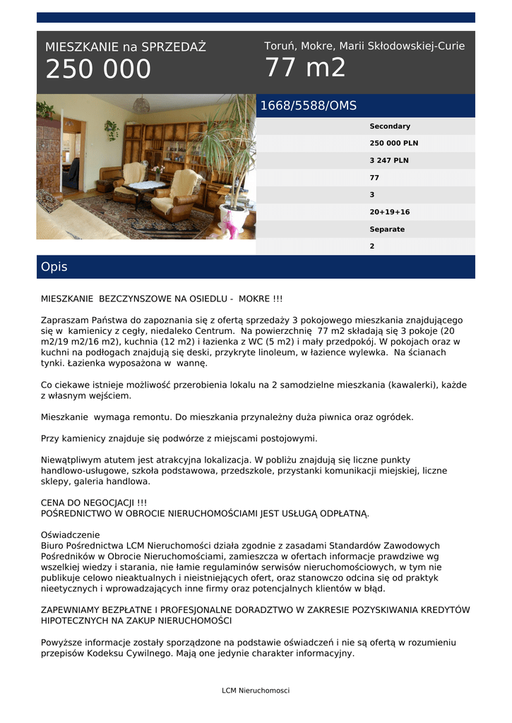 MIESZKANIE na SPRZEDAŻ 250 000 Toruń, Mokre, Marii Skłodowskiej-Curie 77 m2 1668/5588/OMS Secondary 250 000 PLN 3 247 PLN 77 3 20+19+16 Separate 2 Opis MIESZKANIE BEZCZYNSZOWE NA OSIEDLU - MOKRE !!! Zapraszam Państwa do zapoznania się z ofertą sprzedaży 3 pokojowego mieszkania znajdującego się w kamienicy z cegły, niedaleko Centrum. Na powierzchnię 77 m2 składają się 3 pokoje (20 m2/19 m2/16 m2), kuchnia (12 m2) i łazienka z WC (5 m2) i mały przedpokój. W pokojach oraz w kuchni na podłogach znajdują się deski, przykryte linoleum, w łazience wylewka. Na ścianach tynki. Łazienka wyposażona w wannę. Co ciekawe istnieje możliwość przerobienia lokalu na 2 samodzielne mieszkania (kawalerki), każde z własnym wejściem. Mieszkanie wymaga remontu. Do mieszkania przynależny duża piwnica oraz ogródek. Przy kamienicy znajduje się podwórze z miejscami postojowymi. Niewątpliwym atutem jest atrakcyjna lokalizacja. W pobliżu znajdują się liczne punkty handlowo-usługowe, szkoła podstawowa, przedszkole, przystanki komunikacji miejskiej, liczne sklepy, galeria handlowa. CENA DO NEGOCJACJI !!! POŚREDNICTWO W OBROCIE NIERUCHOMOŚCIAMI JEST USŁUGĄ ODPŁATNĄ. Oświadczenie Biuro Pośrednictwa LCM Nieruchomości działa zgodnie z zasadami Standardów Zawodowych Pośredników w Obrocie Nieruchomościami, zamieszcza w ofertach informacje prawdziwe wg wszelkiej wiedzy i starania, nie łamie regulaminów serwisów nieruchomościowych, w tym nie publikuje celowo nieaktualnych i nieistniejących ofert, oraz stanowczo odcina się od praktyk nieetycznych i wprowadzających inne firmy oraz potencjalnych klientów w błąd. ZAPEWNIAMY BEZPŁATNE I PROFESJONALNE DORADZTWO W ZAKRESIE POZYSKIWANIA KREDYTÓW HIPOTECZNYCH NA ZAKUP NIERUCHOMOŚCI Powyższe informacje zostały sporządzone na podstawie oświadczeń i nie są ofertą w rozumieniu przepisów Kodeksu Cywilnego. Mają one jedynie charakter informacyjny. LCM Nieruchomosci Damian Januszewski tel. 531941093 email: [email protected] LCM Nieruchomosci Powered by TCPDF (www.tcpdf.org)