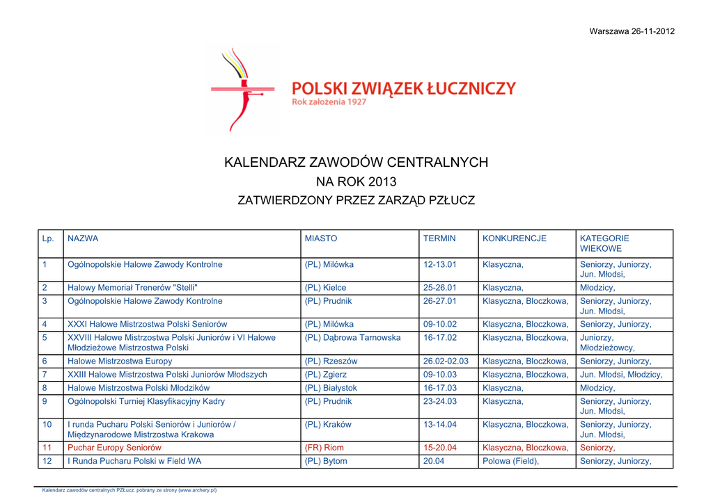 Warszawa 26-11-2012 KALENDARZ ZAWODÓW CENTRALNYCH NA ROK 2013 ZATWIERDZONY PRZEZ ZARZĄD PZŁUCZ Lp. NAZWA MIASTO TERMIN KONKURENCJE KATEGORIE WIEKOWE 1 Ogólnopolskie Halowe Zawody Kontrolne (PL) Milówka 12-13.01 Klasyczna, Seniorzy, Juniorzy, Jun. Młodsi, 2 Halowy Memoriał Trenerów "Stelli" (PL) Kielce 25-26.01 Klasyczna, Młodzicy, 3 Ogólnopolskie Halowe Zawody Kontrolne (PL) Prudnik 26-27.01 Klasyczna, Bloczkowa, Seniorzy, Juniorzy, Jun. Młodsi, 4 XXXI Halowe Mistrzostwa Polski Seniorów (PL) Milówka 09-10.02 Klasyczna, Bloczkowa, Seniorzy, Juniorzy, 5 XXVIII Halowe Mistrzostwa Polski Juniorów i VI Halowe Młodzieżowe Mistrzostwa Polski (PL) Dąbrowa Tarnowska 16-17.02 Klasyczna, Bloczkowa, Juniorzy, Młodzieżowcy, 6 Halowe Mistrzostwa Europy (PL) Rzeszów 26.02-02.03 Klasyczna, Bloczkowa, Seniorzy, Juniorzy, 7 XXIII Halowe Mistrzostwa Polski Juniorów Młodszych (PL) Zgierz 09-10.03 Klasyczna, Bloczkowa, Jun. Młodsi, Młodzicy, 8 Halowe Mistrzostwa Polski Młodzików (PL) Białystok 16-17.03 Klasyczna, Młodzicy, 9 Ogólnopolski Turniej Klasyfikacyjny Kadry (PL) Prudnik 23-24.03 Klasyczna, Seniorzy, Juniorzy, Jun. Młodsi, 10 I runda Pucharu Polski Seniorów i Juniorów / Międzynarodowe Mistrzostwa Krakowa (PL) Kraków 13-14.04 Klasyczna, Bloczkowa, Seniorzy, Juniorzy, Jun. Młodsi, 11 Puchar Europy Seniorów (FR) Riom 15-20.04 Klasyczna, Bloczkowa, Seniorzy, 12 I Runda Pucharu Polski w Field WA (PL) Bytom 20.04 Polowa (Field), Seniorzy, Juniorzy, Kalendarz zawodów centralnych PZŁucz. pobrany ze strony (www.archery.pl) 13 Międzynarodowy Puchar Gór Opawskich (PL) Prudnik 20-21.04 Klasyczna, Bloczkowa, Seniorzy, Juniorzy, Jun. Młodsi, 14 Memoriał Michała Sawickiego (PL) Radom 20-21.04 Klasyczna, Bloczkowa, Seniorzy, Juniorzy, Jun. Młodsi, 15 Ogólnopolski Turniej Klasyfikacyjny Kadry oraz Międzynarodowy Turniej Łuczniczy z okazji 772 rocznicy "Bitwy pod Legnicą" (PL) Legnica 27-28.04 Klasyczna, Seniorzy, Juniorzy, 16 Puchar Polski Juniorów Młodszych (PL) Zamość 11-12.05 Klasyczna, Jun. Młodsi, 17 Puchar Europy Juniorów (SI) Ljubljana 13-18.05 Klasyczna, Bloczkowa, Juniorzy, Jun. Młodsi, 18 I runda Pucharu Świata Seniorów (CN) Shanghai 14-19.05 Klasyczna, Bloczkowa, Seniorzy, 19 Ogólnopolskich Zawodów Łuczniczych Młodzików i Dzieci o Puchar Starosty Jędrzejowskiego (PL) Jędrzejów 18.05 Klasyczna, Młodzicy, 20 II runda Pucharu Polski Seniorów i Juniorów (PL) Kielce 18-19.05 Klasyczna, Bloczkowa, Seniorzy, Juniorzy, 21 I Mistrzostwa Polski w Field WA (PL) Ruda Śląska 25.05 Polowa (Field), Seniorzy, 22 VIII Międzynarodowy Memoriał Mieczysława Nowakowskiego (PL) Warszawa 25-26.05 Klasyczna, Bloczkowa, Seniorzy, Juniorzy, Jun. Młodsi, 23 Puchar Polski Juniorów Młodszych (PL) Prudnik 25-26.05 Klasyczna, Jun. Młodsi, 24 Puchar Europy Seniorów (AM) Echmiadzin 27.05-01.06 Klasyczna, Bloczkowa, Seniorzy, 25 Puchar Polski Juniorów Młodszych (PL) Kołobrzeg 01-02.06 Klasyczna, Jun. Młodsi, 26 III runda Pucharu Polski Seniorów i Juniorów (PL) Ścinawka Średnia 08-09.06 Klasyczna, Bloczkowa, Seniorzy, Juniorzy, 27 II runda Pucharu Świata Seniorów (TR) Antalya 10-15.06 Klasyczna, Bloczkowa, Seniorzy, 28 Eliminacje Srefowe do OOM (PL) wg regulaminu 15-16.06 Klasyczna, Jun. Młodsi, 29 Puchar Ziemi Dolnośląskiej (PL) Nowa Ruda 16.06 Klasyczna, Juniorzy, 30 Puchar Polski Juniorów Młodszych (PL) Jaworze 22-23.06 Klasyczna, Jun. Młodsi, 31 XXX Międzynarodowy Memoriał Ireny Szydłowskiej (PL) Warszawa 29-30.06 Klasyczna, Bloczkowa, Seniorzy, Juniorzy, Jun. Młodsi, 32 Mistrzostwa Zrzeszenia LZS (PL) VACAT 01-02.07 Klasyczna, Juniorzy, Jun. Młodsi, 33 II Runda Pucharu Polski w Field WA (PL) Jaworze 06.07 Polowa (Field), Seniorzy, 34 III runda Pucharu Świata Seniorów (CO) Medellin 15-21.07 Klasyczna, Bloczkowa, Seniorzy, 35 XIX Ogólnopolska Olimpiada Młodzieży i Mistrzostwa Polski Juniorów Młodszych (PL) Łódź 19-21.07 Klasyczna, Jun. Młodsi, 36 LXII Mistrzostwa Polski Juniorów (PL) Bydgoszcz 27-28.07 Klasyczna, Bloczkowa, Juniorzy, 37 Ogólnopolski Turniej Klasyfikacyjny Kadry (PL) Żywiec 02-03.08 Klasyczna, Seniorzy, Juniorzy, Jun. Młodsi, 38 XXVII Młodzieżowe Mistrzostwa Polski (PL) Żywiec 03-04.08 Klasyczna, Bloczkowa, Młodzieżowcy, 39 III Runda Pucharu Polski w Field WA (PL) Toszek 10.08 Polowa (Field), Seniorzy, Kalendarz zawodów centralnych PZŁucz. pobrany ze strony (www.archery.pl) 40 IV runda Pucharu Polski Seniorów i Juniorów (PL) Rzeszów 17-18.08 Klasyczna, Bloczkowa, Seniorzy, Juniorzy, 41 IV runda Pucharu Świata Seniorów (PL) Wrocław 19-25.08 Klasyczna, Bloczkowa, Seniorzy, 42 II Mistrzostwa Polski 3D WA (PL) Jaworze 31.08 3D, Seniorzy, 43 Klubowe Mistrzostwa Polski Nadziei Olimpijskich (PL) vacat 31.08-01.09 Klasyczna, Jun. Młodsi, 44 III Mistrzostwa Polski Młodzików (PL) Ludwikowice Kłodzkie 07-08.09 Klasyczna, Młodzicy, 45 LXXVII Mistrzostwa Polski Seniorów (PL) Głuchołazy 12-15.09 Klasyczna, Bloczkowa, Seniorzy, Juniorzy, 46 Jesienny Młodzieżowy Turniej - Lajkonik 2013 (PL) Kraków 21.09 Klasyczna, Dzieci, Młodzicy, 47 Finał Pucharu Świata (FR) Paryż 21-22.09 Klasyczna, Bloczkowa, Seniorzy, 48 Finał Ogólnopolskiej Ligi Młodzików (PL) Kraków 22.09 Klasyczna, Młodzicy, 49 V runda Pucharu Polski Seniorów i Juniorów (PL) Bytom 28-29.09 Klasyczna, Bloczkowa, Seniorzy, Juniorzy, 50 Mistrzostwa Świata Seniorów w łucznictwie klasycznym i bloczkowym (TR) Antalya 29.09-06.10 Klasyczna, Bloczkowa, Seniorzy, 51 Ogólnopolskie Zawody Młodzików i Dzieci "Złoty Liść Jesieni 2013" (PL) Kielce 05.10 Klasyczna, Dzieci, Młodzicy, 52 IX Puchar Beskidów (PL) Żywiec 05-06.10 Klasyczna, Bloczkowa, Seniorzy, Juniorzy, Jun. Młodsi, 53 XXV Międzynarodowy Turniej o Złotą Ciupagę Góralską (PL) Żywiec 12-13.10 Klasyczna, Bloczkowa, Seniorzy, Juniorzy, Jun. Młodsi, 54 Mistrzostwa Świata Juniorów (CN) Wuxii 13-20.10 Klasyczna, Bloczkowa, Juniorzy, Jun. Młodsi, 55 Ogólnopolskie Halow