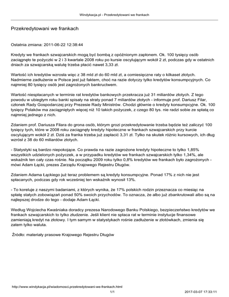 Windykacja.pl - Przekredytowani we frankach Przekredytowani we frankach Ostatnia zmiana: 2011-06-22 12:38:44 Kredyty we frankach szwajcarskich mogą być bombą z opóźnionym zapłonem. Ok. 100 tysięcy osób zaciągnęło te pożyczki w 2 i 3 kwartale 2008 roku po kursie oscylującym wokół 2 zł, podczas gdy w ostatnich dniach za szwajcarską walutę trzeba płacić nawet 3,33 zł. Wartość ich kredytów wzrosła więc z 38 mld zł do 60 mld zł, a comiesięczne raty o kilkaset złotych. Nadmierne zadłużenie w Polsce jest już faktem, choć na razie dotyczy tylko kredytów konsumpcyjnych. Co najmniej 80 tysięcy osób jest zagrożonych bankructwem. Wartość niespłacanych w terminie rat kredytów bankowych przekracza już 31 miliardów złotych. Z tego powodu w ubiegłym roku banki spisały na straty ponad 7 miliardów złotych - informuje prof. Dariusz Filar, członek Rady Gospodarczej przy Prezesie Rady Ministrów. Chodzi głównie o kredyty konsumpcyjne. Ok. 100 tysięcy Polaków ma zaciągniętych więcej niż 10 takich pożyczek, z czego 80 tys. nie radzi sobie ze spłatą co najmniej jednego z nich. Zdaniem prof. Dariusza Filara do grona osób, którym grozi przekredytowanie trzeba będzie też zaliczyć 100 tysięcy tych, które w 2008 roku zaciągnęły kredyty hipoteczne w frankach szwajcarskich przy kurcie oscylującym wokół 2 zł. Dziś za franka trzeba już zapłacić 3,31 zł. Tylko na skutek różnic kursowych, ich dług wzrósł z 38 do 60 miliardów złotych. - Statystyki są bardzo niepokojące. Co prawda na razie zagrożone kredyty hipoteczne to tylko 1,85% wszystkich udzielonych pożyczek, a w przypadku kredytów we frankach szwajcarskich tylko 1,34%, ale wskaźnik ten cały czas rośnie. Na początku 2009 roku tylko 0,8% kredytów we frankach było zagrożonych mówi Adam Łącki, prezes Zarządu Krajowego Rejestru Długów. Zdaniem Adama Łąckiego już teraz problemem są kredyty konsumpcyjne. Ponad 17% z nich nie jest spłacanych, podczas gdy rok wcześniej ten wskaźnik wynosił 13%. - To koreluje z naszymi badaniami, z których wynika, że 17% polskich rodzin przeznacza co miesiąc na spłatę stałych zobowiązań ponad 50% swoich przychodów. To oznacza, że albo już zbankrutowali albo są na najlepszej drodze do tego - dodaje Adam Łącki. Według Wojciecha Kwaśniaka doradcy prezesa Narodowego Banku Polskiego, bezpieczeństwo kredytów we frankach szwajcarskich to tylko złudzenie. Jeśli klient nie spłaca rat w terminie instytucje finansowe zamieniają kredyt na złotowy. I tym samym w statystykach rośnie zadłużenie w złotówkach, zmienia się zatem tylko waluta. Źródło: materiały prasowe Krajowego Rejestru Długów http://www.windykacja.pl/wiadomosci,przekredytowani-we-frankach.html 1/1 2017-03-07 17:33:11