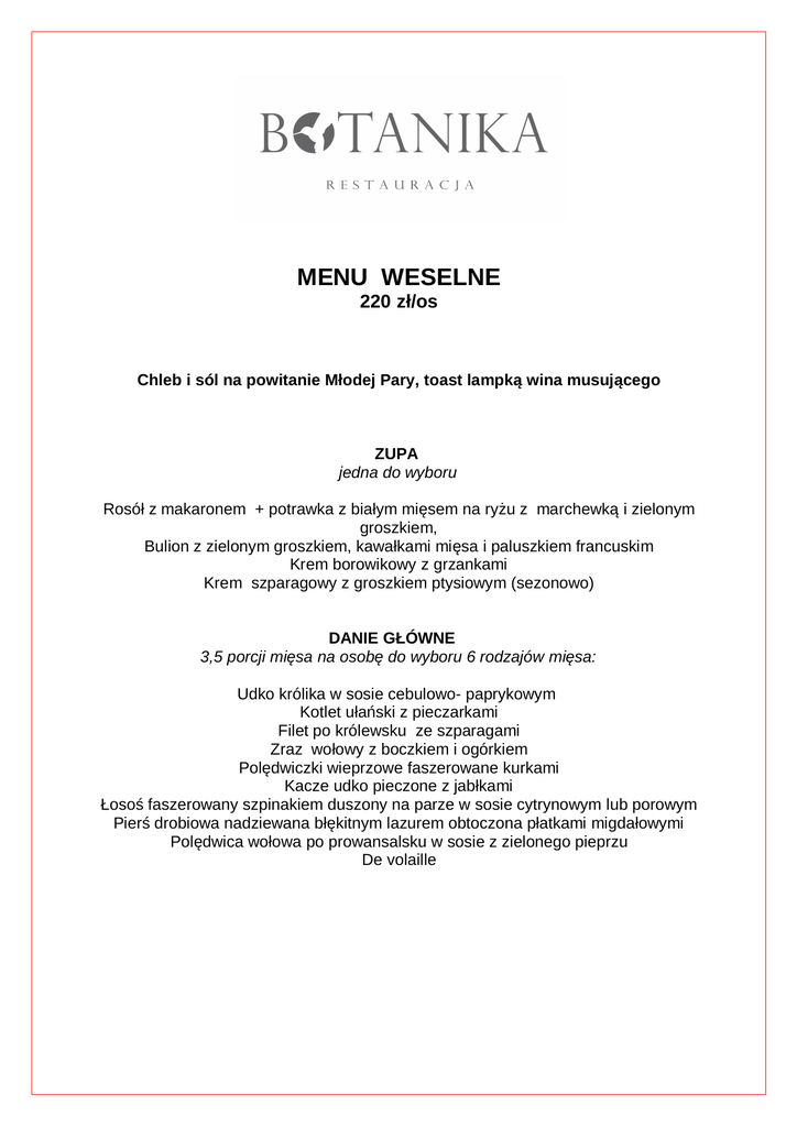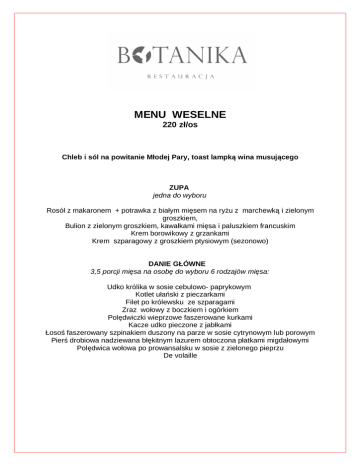 MENU WESELNE 220 zł/os Chleb i sól na powitanie Młodej Pary, toast lampką wina musującego ZUPA jedna do wyboru Rosół z makaronem + potrawka z białym mięsem na ryżu z marchewką i zielonym groszkiem, Bulion z zielonym groszkiem, kawałkami mięsa i paluszkiem francuskim Krem borowikowy z grzankami Krem szparagowy z groszkiem ptysiowym (sezonowo) DANIE GŁÓWNE 3,5 porcji mięsa na osobę do wyboru 6 rodzajów mięsa: Udko królika w sosie cebulowo- paprykowym Kotlet ułański z pieczarkami Filet po królewsku ze szparagami Zraz wołowy z boczkiem i ogórkiem Polędwiczki wieprzowe faszerowane kurkami Kacze udko pieczone z jabłkami Łosoś faszerowany szpinakiem duszony na parze w sosie cytrynowym lub porowym Pierś drobiowa nadziewana błękitnym lazurem obtoczona płatkami migdałowymi Polędwica wołowa po prowansalsku w sosie z zielonego pieprzu De volaille DODATKI SKROBIOWE do wyboru 3 rodzaje Ziemniaki gotowane z koperkiem Frytki Krokiety Ziemniaki opiekane w ziołach i czosnku Pyzy Kluski śląskie ZESTAW JARZYN Do wyboru 4 rodzaje Szparagi gotowane z masłem i tartą bułką (sezonowo) Młoda kapusta zasmażana (sezonowo) Fasolka szparagowa Kalafior Brokuły Marchewka paryska Modra kapusta ZESTAW SURÓWEK do wyboru 2 rodzaje Buraczki z chrzanem Surówka z białej kapusty Surówka z selera i rodzynkami Tarta marchewka z ananasem DESER jeden do wyboru Deser lodowy Sorbet owocowy Sernik domowy z musem malinowym CIASTO WESELNE 2 porcje na osobę, 7 rodzajów ZIMNY BUFET 3,5 porcji na osobę Schab ze śliwką Schab z morelą Indyk w maladze Filet z kurczaka z brzoskwinią Szynka ze szparagami Szynka z sałatką Tatar wołowy Galantyna z drobiu Ryba w galarecie (pstrąg i sandacz) Flaczki Żur staropolski z kiełbasą i jajkiem SAŁATKI do wyboru 2 rodzaje Sałatka jarzynowa Grecka Gyros Sałatka z paluszków krabowych Sałatka Szefa Kuchni Ciepłe bułeczki, pieczywo, masełko TORT WESELNY ŚNIADANIE 1,5 porcji na osobę Golonka po bawarsku lub gotowana Szaszłyk wieprzowy Sznycel drobiowy z czerwoną papryką i ziołami Bitka schabowa z ananasem i żurawiną Barszcz Kapusta zasmażana Pieczywo, masełko, chrzan, musztarda, ketchup W cenie oferujemy: Pokój dla Młodej Pary Pokoje dla Rodziców Pary Młodej Dekoracje krzeseł dla Młodej Pary i Rodziców (białe pokrowce + tiulowa wstęga) Dekoracje stołów ( świecami, stożkami, żywe kwiaty) Białe pokrowce na krzesła Napoje gazowane typu: Coca-Cola, Fanta, Sprite oraz napoje niegazowane i woda – bez ograniczeń Napoje ciepłe – kawa, herbata – bez ograniczeń Wino musujące na powitanie Młodej Pary Depozyt Parking monitorowany Nie pobieramy korkowego Dodatkowe propozycje: Szynka pieczona, sałatka Szefa Kuchni, gorące pieczywo, sos czosnkowy dla około 30 osób - 450zł/szt Udziec z dzika, sałatka Szefa Kuchni, gorące pieczywo, sos czosnkowy dla około 30 osób - 550/szt Indyk pieczony, sałatka Szefa Kuchni, gorące pieczywo, sos czosnkowy dla około 30 osób -450zł/szt Stół wiejski z tradycyjnymi wyrobami do 80 osób - 800/zł Beczka piwa 30l/ 300zł Wypuszczenie pary białych gołębi na szczęcie - 200zł Profesjonalna obsługa barmańska- ok. 1200zł Okrągłe stoły – 9zł/os Profesjonalne oświetlenie sali – lampy LED – 400zł Omówienie MENU weselnego po wcześniejszym telefonicznym uzgodnieniu terminu. Tel.: 604 405 529 / 606 101 642