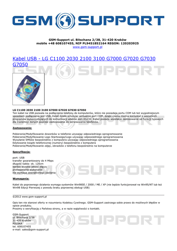 GSM-Support ul. Bitschana 2/38, 31-420 Kraków mobile +48 608107455, NIP PL9451852164 REGON: 120203925 www.gsm-support.pl Kabel USB - LG C1100 2030 2100 3100 G7000 G7020 G7030 G7050 LG C1100 2030 2100 3100 G7000 G7020 G7030 G7050 Ten kabel na USB pozwala na podłączenie telefonu do komputerów, które nie posiadają portu COM lub też wygodniejszym sposobem podłączenia jest USB. Kabel działa emulując wirtualnie port COM, dzięki czemu można korzystać z wszystkich programów wykorzystujących do komunikacji właśnie port RS232. Kabel posiada wszelakie zastosowanie od funkcji typowych dla transmisji danych poprzez zastosowanie do serwisowania telefonów. Zastosowanie: Pobieranie/Modyfikowanie dzwonków w telefonie używając odpowiedniego oprogramowanie Pobieranie/Modyfikowanie Logo Startowego/Logo używając odpowiedniego oprogramowania Wysyłanie SMSów bezpośrednio z komputera używając odpowiedniego oprogramowania Edytowanie książki telefonicznej (numery) bezpośrednio z komputera Pobieranie/Modyfikowanie zdjęc, obrazków z telefonu bezpośrednio na komputerze Specyfikacja: port: USB transfer gwarantowany do 4 Mbps długość kabla: ok. 120cm bardzo wysoka jakość złączy profesjonalne wykonanie nie wymaga zewnętrznego zasilania Wymagania: Kabel do poprawnego działania wymaga systemów Win98SE / 2000 / ME / XP (nie będzie funkcjonował na Win95/NT lub też Win98 Edycji Pierwszej z powodu braku poprawnej obsługi USB) ©2012 www.gsm-support.pl Opis ten nie stanowi oferty w rozumieniu Kodeksu Cywilnego. GSM-Support zastrzega sobie prawo do możliwych błędów w opisie produktu. Prosimy o weryfikację z Państwa strony, a w razie wątpliwości o kontakt. GSM-Support ul. Bitschana 2/38 31-420 Kraków POLSKA tel. 608107455 e-mail: [email protected] Powered by TCPDF (www.tcpdf.org)