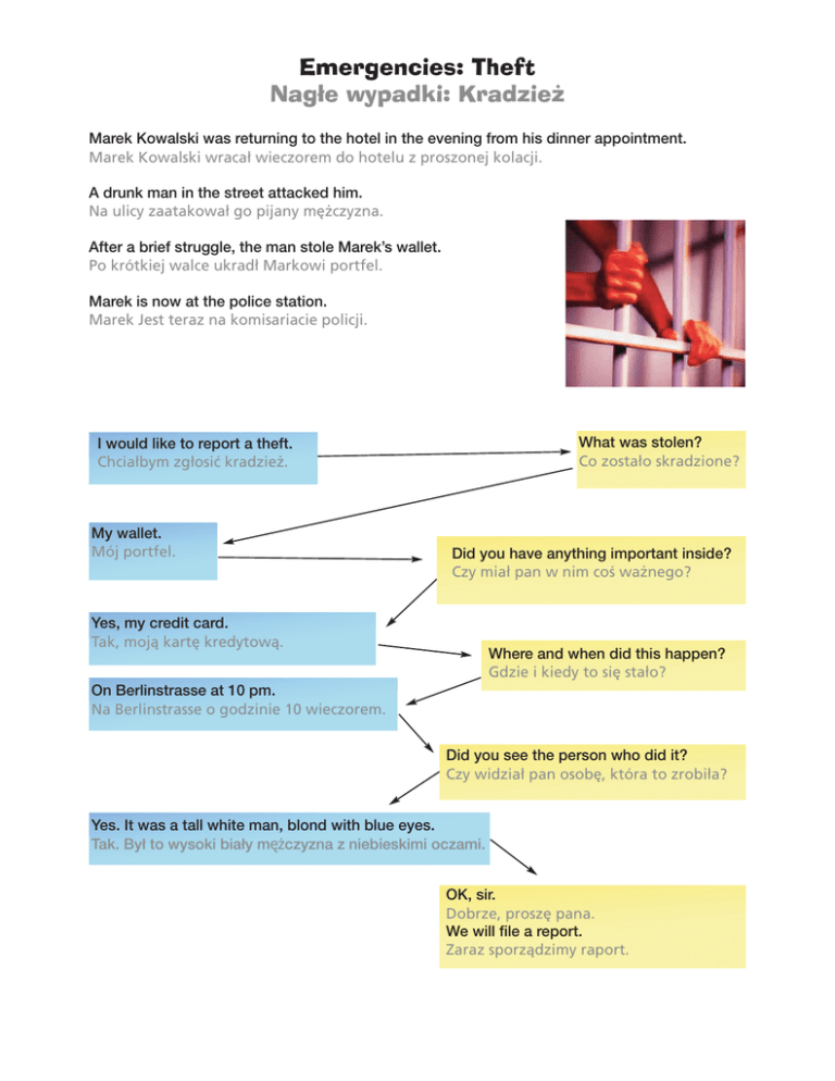 Emergencies: Theft Nagłe wypadki: Kradzież Marek Kowalski was returning to the hotel in the evening from his dinner appointment. Marek Kowalski wracał wieczorem do hotelu z proszonej kolacji. A drunk man in the street attacked him. Na ulicy zaatakował go pijany mężczyzna. After a brief struggle, the man stole Marek’s wallet. Po krótkiej walce ukradł Markowi portfel. Marek is now at the police station. Marek Jest teraz na komisariacie policji. What was stolen? Co zostało skradzione? I would like to report a theft. Chciałbym zgłosić kradzież. My wallet. Mój portfel. Did you have anything important inside? Czy miał pan w nim coś ważnego? Yes, my credit card. Tak, moją kartę kredytową. Where and when did this happen? Gdzie i kiedy to się stało? On Berlinstrasse at 10 pm. Na Berlinstrasse o godzinie 10 wieczorem. Did you see the person who did it? Czy widział pan osobę, która to zrobiła? Yes. It was a tall white man, blond with blue eyes. Tak. Był to wysoki biały mężczyzna z niebieskimi oczami. OK, sir. Dobrze, proszę pana. We will file a report. Zaraz sporządzimy raport. Details and Explanations Szczegóły i wyjaśnienia Note: First, the police will ask you for your name and personal information (see “Personal Data”) Uwaga: Najpierw policja poprosi cię o podanie imienia/nazwiska oraz informacji osobowych. (patrz “Dane Osobowe”) The police will ask you to describe the stolen items. Policja poprosi cię, żebyć opisał skradzione rzeczy. You should also give any extra information that might help the police. Powinieneś też podać wszelkie informacje dodatkowe, które mogłyby pomóc policji. Be sure to block any bank or credit cards, if these were in your wallet. Pamiętaj o zablokowaniu wszelkich kart bankomatowych albo kredytowych, jeżeli były w portfelu. Describe the time and place of the incident. Podaj miejsce i czas incydentu. A physical description of the thief would be helpful. Opis wyglądu złodzieja byłby pomocny. Template Szablon 2. I would like to report 1.__________. Chciałbym zgłosić __________. ________________? ________________? 3. ____________________ ____________________ 5. 4. ________________. ________________. ______________________? ______________________? 6. ________________. ________________. 7. ____________________. ____________________. 8. ____________________. ____________________. 9. ____________________. ____________________. OK, sir. Dobrze, proszę pana. We will file a report. Zaraz sporządzimy raport. Extra notes: Dodatkowe notatki: Options for the template Opcje do szablonu 1. Other possibilities: • a crime • a burglary • a mugging Inne możliwości: • przestępstwo • włamanie • rozbój 2. Other possibilities: • Please describe the stolen items. • Did you have anything stolen, sir? • Did anything go missing? Inne możliwości: • Proszę opisać skradzione przedmioty. • Czy coś panu ukradziono? • Czy coś zginęło? 3. Describe the stolen items. The most popular would include: • My wallet • My purse • My mobile phone • My watch Opisz skradzione przedmioty. Najczęściej będzie to: • Mój portfel • Moja portmonetka • Mój telefon komórkowy • Mój zegarek 4. Any additional questions about the stolen items. For example: • Is anything valuable missing? Tu mogą paść dodatkowe pytania na temat skradzionych przedmiotów. Na przykład: • Czy zginęło coś cennego? 5. Give any additional details. Podaj dodatkowe szczegóły. 6. Other possibilities: • Do you remember the time and location? •Can you remember the whereabouts and time of the incident? Inne możliwości: • Czy pamięta pan czas i miejsce? • Czy pamięta pan okoliczności i porę zdarzenia? 7. The place and time of the robbery. Czas i miejsce kradzieży. 8. Other possibilities: • Can you describe the robber/person? Czy może pan opisać złodzieja/osobę?