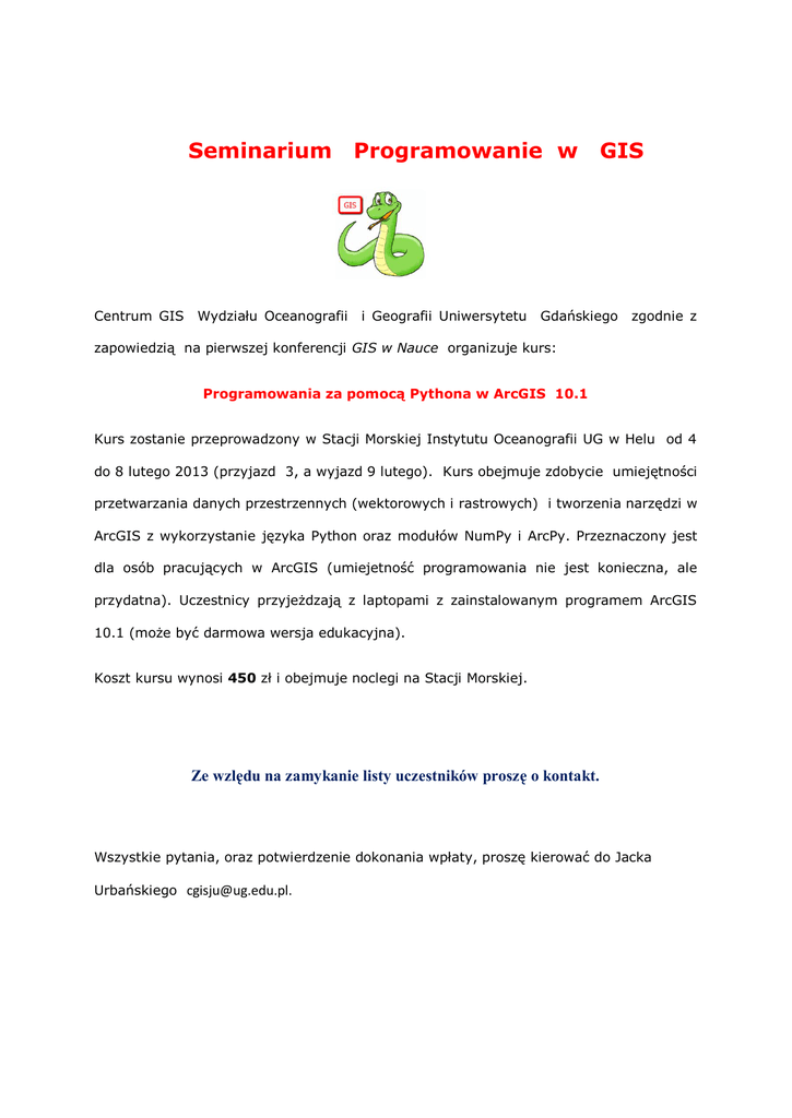 Seminarium Centrum GIS Wydziału Oceanografii Programowanie w i Geografii Uniwersytetu GIS Gdańskiego zgodnie z zapowiedzią na pierwszej konferencji GIS w Nauce organizuje kurs: Programowania za pomocą Pythona w ArcGIS 10.1 Kurs zostanie przeprowadzony w Stacji Morskiej Instytutu Oceanografii UG w Helu od 4 do 8 lutego 2013 (przyjazd 3, a wyjazd 9 lutego). Kurs obejmuje zdobycie umiejętności przetwarzania danych przestrzennych (wektorowych i rastrowych) i tworzenia narzędzi w ArcGIS z wykorzystanie języka Python oraz modułów NumPy i ArcPy. Przeznaczony jest dla osób pracujących w ArcGIS (umiejetność programowania nie jest konieczna, ale przydatna). Uczestnicy przyjeżdzają z laptopami z zainstalowanym programem ArcGIS 10.1 (może być darmowa wersja edukacyjna). Koszt kursu wynosi 450 zł i obejmuje noclegi na Stacji Morskiej. Ze wzlędu na zamykanie listy uczestników proszę o kontakt. Wszystkie pytania, oraz potwierdzenie dokonania wpłaty, proszę kierować do Jacka Urbańskiego [email protected].