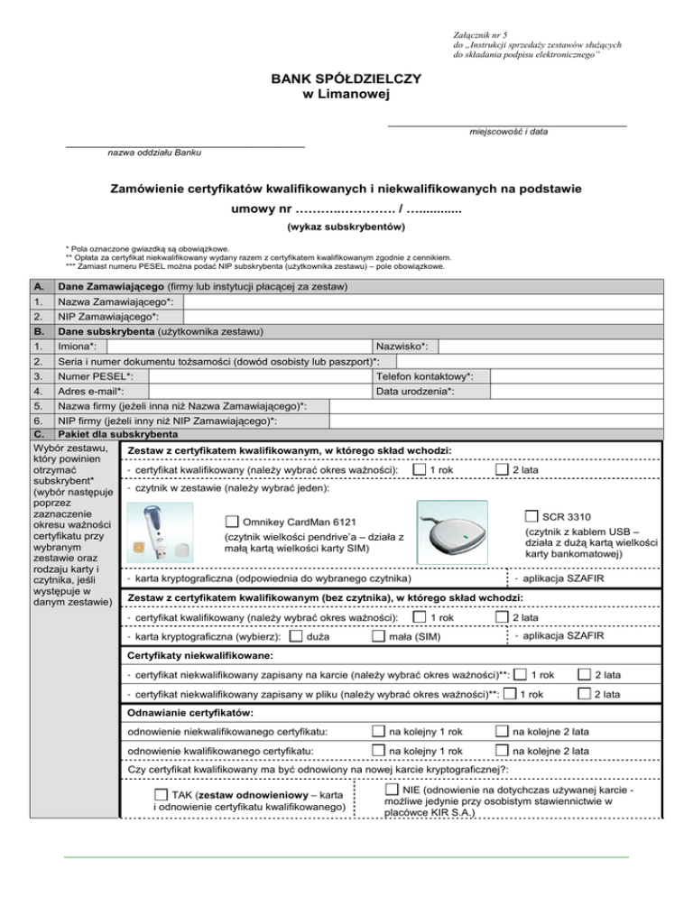 Załącznik nr 5 do „Instrukcji sprzedaŜy zestawów słuŜących do składania podpisu elektronicznego” BANK SPÓŁDZIELCZY w Limanowej _________________________________________ miejscowość i data _________________________________________ nazwa oddziału Banku Zamówienie certyfikatów kwalifikowanych i niekwalifikowanych na podstawie umowy nr ………..…………. / …............ (wykaz subskrybentów) * Pola oznaczone gwiazdką są obowiązkowe. ** Opłata za certyfikat niekwalifikowany wydany razem z certyfikatem kwalifikowanym zgodnie z cennikiem. *** Zamiast numeru PESEL moŜna podać NIP subskrybenta (uŜytkownika zestawu) – pole obowiązkowe. A. Dane Zamawiającego (firmy lub instytucji płacącej za zestaw) 1. Nazwa Zamawiającego*: 2. NIP Zamawiającego*: B. Dane subskrybenta (uŜytkownika zestawu) 1. Imiona*: 2. Seria i numer dokumentu toŜsamości (dowód osobisty lub paszport)*: 3. Numer PESEL*: Telefon kontaktowy*: 4. Adres e-mail*: Data urodzenia*: 5. Nazwa firmy (jeŜeli inna niŜ Nazwa Zamawiającego)*: Nazwisko*: 6. NIP firmy (jeŜeli inny niŜ NIP Zamawiającego)*: C. Pakiet dla subskrybenta Wybór zestawu, Zestaw z certyfikatem kwalifikowanym, w którego skład wchodzi: który powinien otrzymać - certyfikat kwalifikowany (naleŜy wybrać okres waŜności): 1 rok 2 lata subskrybent* (wybór następuje - czytnik w zestawie (naleŜy wybrać jeden): poprzez zaznaczenie SCR 3310 Omnikey CardMan 6121 okresu waŜności (czytnik z kablem USB – certyfikatu przy (czytnik wielkości pendrive’a – działa z działa z duŜą kartą wielkości wybranym małą kartą wielkości karty SIM) karty bankomatowej) zestawie oraz rodzaju karty i - karta kryptograficzna (odpowiednia do wybranego czytnika) - aplikacja SZAFIR czytnika, jeśli występuje w Zestaw z certyfikatem kwalifikowanym (bez czytnika), w którego skład wchodzi: danym zestawie) - certyfikat kwalifikowany (naleŜy wybrać okres waŜności): - karta kryptograficzna (wybierz): duŜa 1 rok mała (SIM) 2 lata - aplikacja SZAFIR Certyfikaty niekwalifikowane: - certyfikat niekwalifikowany zapisany na karcie (naleŜy wybrać okres waŜności)**: - certyfikat niekwalifikowany zapisany w pliku (naleŜy wybrać okres waŜności)**: 1 rok 1 rok 2 lata 2 lata Odnawianie certyfikatów: odnowienie niekwalifikowanego certyfikatu: na kolejny 1 rok na kolejne 2 lata odnowienie kwalifikowanego certyfikatu: na kolejny 1 rok na kolejne 2 lata Czy certyfikat kwalifikowany ma być odnowiony na nowej karcie kryptograficznej?: TAK (zestaw odnowieniowy – karta i odnowienie certyfikatu kwalifikowanego) NIE (odnowienie na dotychczas uŜywanej karcie moŜliwe jedynie przy osobistym stawiennictwie w placówce KIR S.A.) Jeśli TAK, to wybierz rodzaj karty: duŜa mała (SIM) Inne elementy oferty KIR S.A. związane z e-podpisem: D. 1. Dane do certyfikatu kwalifikowanego (dane osoby wprowadzonej w części B) Nazwisko* 2. Imiona* 3. PESEL*** 4. Data początku okresu waŜności certyfikatu* 5. Preferowana data odbioru zestawu 6. Adres e-mail 7. Organizacja (nazwa firmy) Adres pocztowy organizacji (ulica nr, kod pocztowy, miejscowość, województwo) 8. 9. Inne dane (np. stanowisko lub nazwa własna, czyli dowolna nazwa certyfikatu określona przez klienta – standardowo wpisywane jest: imiona i nazwisko) E. Dane do certyfikatu niekwalifikowanego (dane osoby wprowadzonej w części B) 10. Nazwisko* 11. Imiona* Nazwa własna* (dowolna nazwa certyfikatu określona przez 12. klienta, np. imię i nazwisko) 13. Adres e-mail * 14. Data początku okresu waŜności certyfikatu* Preferowana data odbioru zestawu (jeŜeli nie została wskazana 15. powyŜej) 16. Organizacja (nazwa firmy) Adres pocztowy organizacji 17. (ulica nr, kod pocztowy, miejscowość, województwo) Inne dane (np. stanowisko lub szczególne zastosowania certyfikatu – w standardzie w certyfikacie niekwalifikowanym zaznacza się następujące 18. zastosowania: podpis elektroniczny, szyfrowanie dokumentów, niezaprzeczalność, uwierzytelnianie klienta, ochrona poczty) _________________________________________ podpisy osób, które zawarły w imieniu Zamawiającego umowę na świadczenie usług certyfikacyjnych lub osób upowaŜnionych do reprezentowania Zamawiającego Bank Spółdzielczy z siedzibą w Limanowej, ul. Rynek 7, 34-600 Limanowa, którego dokumentacja jest przechowywana w Sądzie Rejonowym dla Krakowa-Śródmieścia w Krakowie XII Wydział Gospodarczy Krajowego Rejestru Sądowego, wpisany do rejestru przedsiębiorców pod numerem KRS 0000081900, NIP 737 00 005 743, będzie przetwarzał dane osobowe Subskrybenta – osoby wskazanej w umowie na świadczenie usług certyfikacyjnych przez Zamawiającego, jako osoby uprawnionej do otrzymania certyfikatu – w celu zawarcia i realizacji przedmiotowej umowy oraz działań marketingowych, z zachowaniem zasad i sposobu ich przetwarzania, wykorzystania i ochrony oraz prawa kontroli zgodnie z ustawą z dnia 29 sierpnia 1997 r. o ochronie danych osobowych (Dz. U. z 1997 r. Nr 133, poz 883 z późn. zm.). Oświadczam, Ŝe zapoznałam/em się z ww. informacją i wyraŜam zgodę na przetwarzanie moich danych osobowych przez Bank Spółdzielczy w Limanowej oraz wyraŜam zgodę na przekazywanie ww. danych przez Bank Spółdzielczy w Limanowej do Krajowej Izby Rozliczeniowej w celu świadczenia usług certyfikacyjnych. ________________________________________ podpis Subskrybenta _________________________________________ podpis operatora ORK 2
