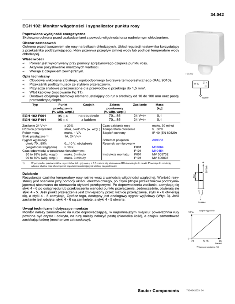 34.042 EGH 102: Monitor wilgotności i sygnalizator punktu rosy Poprawiona wydajność energetyczna Skuteczna ochrona przed uszkodzeniami z powodu wilgotności oraz nadmiernym chłodzeniem. Obszar zastosowań Ochrona przed tworzeniem się rosy na belkach chłodzących. Układ regulacji nastawnika korzystający z przekaźnika podtrzymującego, który przerywa przepływ zimnej wody lub podnosi temperaturę wody chłodzącej. Właściwości • Pomiar jest wykonywany przy pomocy spręŜynowego czujnika punktu rosy. • Aktywne pozyskiwanie mierzonych wartości. • Wersja z czujnikiem zewnętrznym. Opis techniczny • Obudowa wykonana z białego, ognioodpornego tworzywa termoplastycznego (RAL 9010). • Przekaźnik podtrzymujący ze stykiem przełącznym. • Przyłącza śrubowe przeznaczone dla przewodów o przekroju do 1,5 mm². • Wlot kablowy (mocowanie Pg 11). • Dostawa obejmuje taśmowy element ustalający do rur o średnicy od 10 do 100 mm oraz pastę przewodzącą ciepło. Typ Punkt przełączenia [% wilg. wzgl.] Czujnik Zakres pomiarowy [% wilg. wzgl.] Zasilanie Masa [kg] EGH 102 F001 EGH 102 F101 95 ± 4 95 ± 4 na obudowie z kablem 70…85 70…85 24 V~/= 24 V~/= 0,1 0,1 Zasilanie 24 V~/= ± 20% RóŜnica przełączania stała, około 5% (w. wzgl.) Pobór mocy maks. 1 VA Styki przełączne 1) 1A, 24 V~/= Sygnał wyjściowy około 70...85% 0...10 V, obciąŜenie (wilgotność względna) > 10 kΩ Czas odpowiedzi w powietrzu nieruchomym:80 to 99% (wilg. wzgl.) maks. 3 minuty 99 to 80% (wilg. wzgl.) maks. 3 minuty maks. 30 minut 5...60°C IP 40 (EN 60529) Schemat połączeń Rysunek wymiarowany F001 F101 Instrukcja montaŜu F001 F101 A09353 Y02859 M07664 M10454 MV 505732 MV 506037 W przypadku przetworników, styczników, itd., gdy cos ϕ < 0,3, zaleca się stosowanie RC równolegle do cewki. Powoduje to redukcję wŜerów styków oraz chroni przed impulsami zakłócającymi wielkiej częstotliwości. 95 %rh 1) Czas działania rosy Temperatura otoczenia Stopień ochrony H% XSd Działanie Rezystancja czujnika temperatury rosy rośnie wraz z wartością wilgotności względnej. Wartość rezystancji jest oceniana przy pomocy układu elektronicznego, po czym (dzięki przekaźnikowi podtrzymującemu) stosowana do sterowania stykami przełącznymi. Po doprowadzeniu zasilania, zamykają się styki 4 - 6 po osiągnięciu lub przekroczeniu wartości punktu przełączenia. Jednocześnie, otwierają się styki 4 - 5. Jeśli punkt przełączenia jest zmniejszony przez róŜnicę przełączania, styki 4 - 6 otwierają się, a styki 4 - 5 zamykają. Oprócz tego, dostępny jest analogowy sygnał wyjściowy (Wtyk 3). Jeśli zasilanie jest odcięte, styki 4 - 6 są zamknięte, a styki 4 - 5 otwarte. 6 5 4 B0944 4 Uwagi techniczne i dotyczące montaŜu Monitor naleŜy zamontować na rurze doprowadzającej, w najzimniejszym miejscu: powierzchnia rury powinna być czysta i odkryta, na rurę naleŜy nałoŜyć pastę (niewielka ilość), a czujnik zamontować zaciskając taśmę (mechanizm zatrzaskowy). 10 V- Sygnał wyjściowy Output signal 0 70 % r.h. 85 B06506 Wilgotność względna [%] Sauter Components 7134042003 04 34.042/2 EGH 102 Schemat połączeń EGH 102 F001/F101 0...10 V 2 H% 24 V~/= 1 5 4 6 3 A09353 Rysunek wymiarowany EGH 102 F101 36,4 22,5 32 60 44 M12x1,5 Pg11 81 36 38 20 12 11 1000 62 M10454 EGH 102 F001 Wydrukowano w Szwajcarii. ZastrzeŜone prawo do wprowadzania zmian. Uwaga: Przecinek między liczbami kardynalnymi oznacza przecinek dziesiętny © Fr. Sauter AG, CH-4016 Bazylea 7134042003 04 Sauter Components 32 60 44
