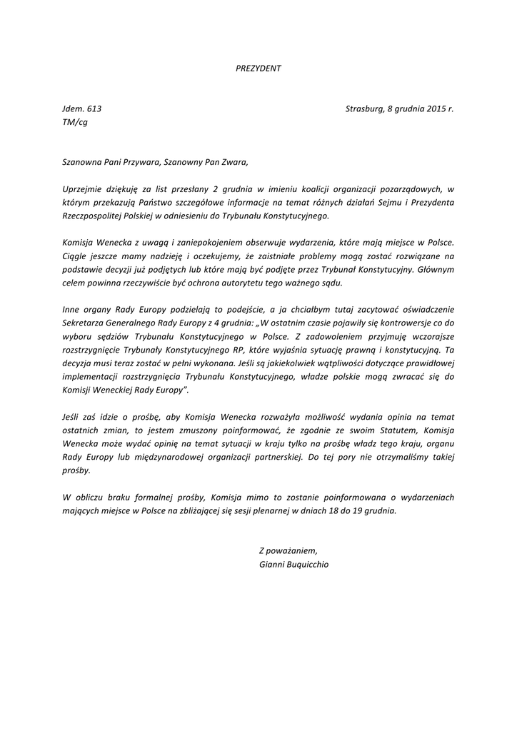 PREZYDENT Jdem. 613 Strasburg, 8 grudnia 2015 r. TM/cg Szanowna Pani Przywara, Szanowny Pan Zwara, Uprzejmie dziękuję za list przesłany 2 grudnia w imieniu koalicji organizacji pozarządowych, w którym przekazują Państwo szczegółowe informacje na temat różnych działań Sejmu i Prezydenta Rzeczpospolitej Polskiej w odniesieniu do Trybunału Konstytucyjnego. Komisja Wenecka z uwagą i zaniepokojeniem obserwuje wydarzenia, które mają miejsce w Polsce. Ciągle jeszcze mamy nadzieję i oczekujemy, że zaistniałe problemy mogą zostać rozwiązane na podstawie decyzji już podjętych lub które mają być podjęte przez Trybunał Konstytucyjny. Głównym celem powinna rzeczywiście być ochrona autorytetu tego ważnego sądu. Inne organy Rady Europy podzielają to podejście, a ja chciałbym tutaj zacytować oświadczenie Sekretarza Generalnego Rady Europy z 4 grudnia: „W ostatnim czasie pojawiły się kontrowersje co do wyboru sędziów Trybunału Konstytucyjnego w Polsce. Z zadowoleniem przyjmuję wczorajsze rozstrzygnięcie Trybunały Konstytucyjnego RP, które wyjaśnia sytuację prawną i konstytucyjną. Ta decyzja musi teraz zostać w pełni wykonana. Jeśli są jakiekolwiek wątpliwości dotyczące prawidłowej implementacji rozstrzygnięcia Trybunału Konstytucyjnego, władze polskie mogą zwracać się do Komisji Weneckiej Rady Europy”. Jeśli zaś idzie o prośbę, aby Komisja Wenecka rozważyła możliwość wydania opinia na temat ostatnich zmian, to jestem zmuszony poinformować, że zgodnie ze swoim Statutem, Komisja Wenecka może wydać opinię na temat sytuacji w kraju tylko na prośbę władz tego kraju, organu Rady Europy lub międzynarodowej organizacji partnerskiej. Do tej pory nie otrzymaliśmy takiej prośby. W obliczu braku formalnej prośby, Komisja mimo to zostanie poinformowana o wydarzeniach mających miejsce w Polsce na zbliżającej się sesji plenarnej w dniach 18 do 19 grudnia. Z poważaniem, Gianni Buquicchio