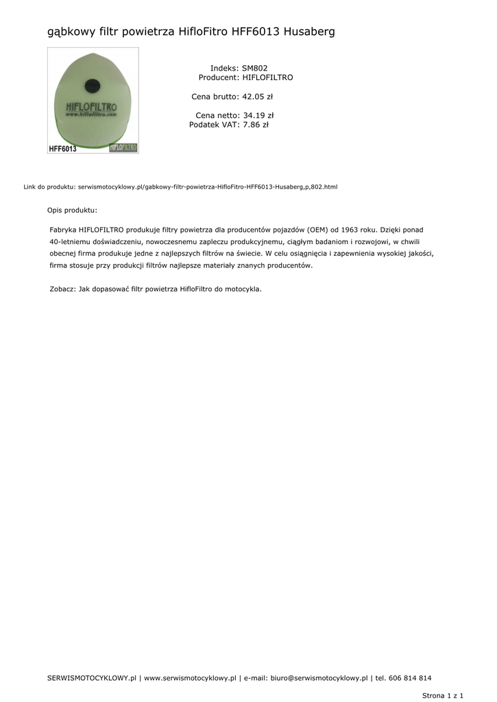 gąbkowy filtr powietrza HifloFitro HFF6013 Husaberg Indeks: SM802 Producent: HIFLOFILTRO Cena brutto: 42.05 zł Cena netto: 34.19 zł Podatek VAT: 7.86 zł Link do produktu: serwismotocyklowy.pl/gabkowy-filtr-powietrza-HifloFitro-HFF6013-Husaberg,p,802.html Opis produktu: Fabryka HIFLOFILTRO produkuje filtry powietrza dla producentów pojazdów (OEM) od 1963 roku. Dzięki ponad 40-letniemu doświadczeniu, nowoczesnemu zapleczu produkcyjnemu, ciągłym badaniom i rozwojowi, w chwili obecnej firma produkuje jedne z najlepszych filtrów na świecie. W celu osiągnięcia i zapewnienia wysokiej jakości, firma stosuje przy produkcji filtrów najlepsze materiały znanych producentów. Zobacz: Jak dopasować filtr powietrza HifloFiltro do motocykla. SERWISMOTOCYKLOWY.pl | www.serwismotocyklowy.pl | e-mail: [email protected] | tel. 606 814 814 Strona 1 z 1