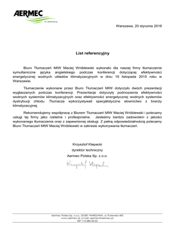 Warszawa, 20 stycznia 2016 List referencyjny Biuro Tłumaczeń MIW Maciej Wróblewski wykonało dla naszej firmy tłumaczenie symultaniczne języka angielskiego podczas konferencji dotyczącej efektywności energetycznej wodnych układów klimatyzacyjnych w dniu 19 listopada 2015 roku w Warszawie. Tłumaczenie wykonane przez Biuro Tłumaczeń MIW dotyczyło dwóch prezentacji wygłaszanych podczas konferencji. Prezentacje dotyczyły podnoszenia efektywności wodnych systemów klimatyzacyjnych oraz efektywności energetycznej wodnych systemów dystrybucji chłodu. Tłumacze wykorzystywali specjalistyczne słownictwo z branży klimatyzacyjnej. Rekomendujemy współpracę z Biurem Tłumaczeń MIW Maciej Wróblewski i polecamy usługi tej firmy jako rzetelne i profesjonalne. Jesteśmy bardzo zadowoleni z jakości wykonanego tłumaczenia oraz z zapewnionej obsługi. Z pełną odpowiedzialnością polecamy Biuro Tłumaczeń MIW Maciej Wróblewski w zakresie wykonywania tłumaczeń. Krzysztof Klepacki dyrektor techniczny Aermec Polska Sp. z o.o. Aermec Polska Sp. z o.o., 02-801 WARSZAWA, ul. Puławska 405 www.aermec.pl, e-mail: [email protected] NIP 113-285-55-03