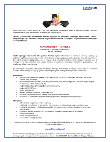 Firma Berendsen Textile Service Sp. z o.o. jest liderem na europejskim rynku w zakresie wynajmu i serwisu odzieży roboczej, mat wejściowych oraz urządzeo higienicznych. Obecnie poszukujemy absolwentów uczelni wyższych do programu stażowego Management Trainee. Program wiąże się z udziałem w czterech projektach biznesowych i współpracą z Dyrektorami Zarządzającymi w różnych krajach. MANAGEMENT TRAINEE miejsce pracy: Miszewko koło Gdaoska Nr Ref.: MT/2014 Osoba zajmująca stanowisko Management Trainee będzie zatrudniona w oparciu o umowę o pracą. Jej zadaniem będzie przeprowadzenie czterech projektów wspomagających realizację celów strategicznych firmy. Dwa z tych projektów będą realizowany w Polsce, a dwa w krajach skandynawskich. Każdy z projektów trwa 6 miesięcy i ma sprecyzowane cele, etapy działania i oczekiwane rezultaty. Projekty są prowadzone we współpracy z kadrą kierowniczą. Po zakooczeniu programu oferujemy możliwośd dalszego zatrudnienia i przejęcia stanowiska na wyższym szczeblu struktury organizacyjnej, zgodnie z predyspozycjami, wiedzą i zdobytym doświadczeniem. Wymagania:  ukooczone studia wyższe na kierunkach: ekonomia, zarządzanie, logistyka, transport, marketing, finanse, inne pokrewne,  mile widziane doświadczenie w międzynarodowych projektach, programie ERASMUS, organizacjach studenckich, kołach naukowych itp.  znajomośd języka angielskiego (warunek konieczny),  znajomośd MS Office,  prawo jazdy kat. B,  wysoko rozwinięte zdolności komunikacyjne,  szczerośd, odpowiedzialnośd, umiejętnośd znajdowania rozwiązao,  otwartośd na współpracę międzynarodową i gotowośd do wyjazdów zagranicznych. Oferujemy:  zatrudnienie w oparciu o umowę o pracę,  możliwośd zatrudnienia na stanowisku kierowniczym po zakooczeniu programu stażowego,  możliwośd współpracy z doświadczoną kadrą kierowniczą przy realizacji poważnych projektów biznesowych,  możliwośd udziału w szkoleniach i zdobywania cennego doświadczenia w środowisku międzynarodowym,  pakiet usług medycznych,  odpowiednie narzędzia pracy. Prosimy o przesłanie cv i listu motywacyjnego w języku polskim i angielskim wraz z numerem referencyjnym w temacie maila na adres: [email protected] Prosimy o dopisanie następującej klauzuli: "Wyrażam zgodę na przetwarzanie moich danych osobowych zawartych w ofercie pracy dla potrzeb procesu rekrutacji zgodnie z ustawą z dnia 27.08.1997r. Dz. U. z 2002 r., Nr 101, poz. 923 ze zm."