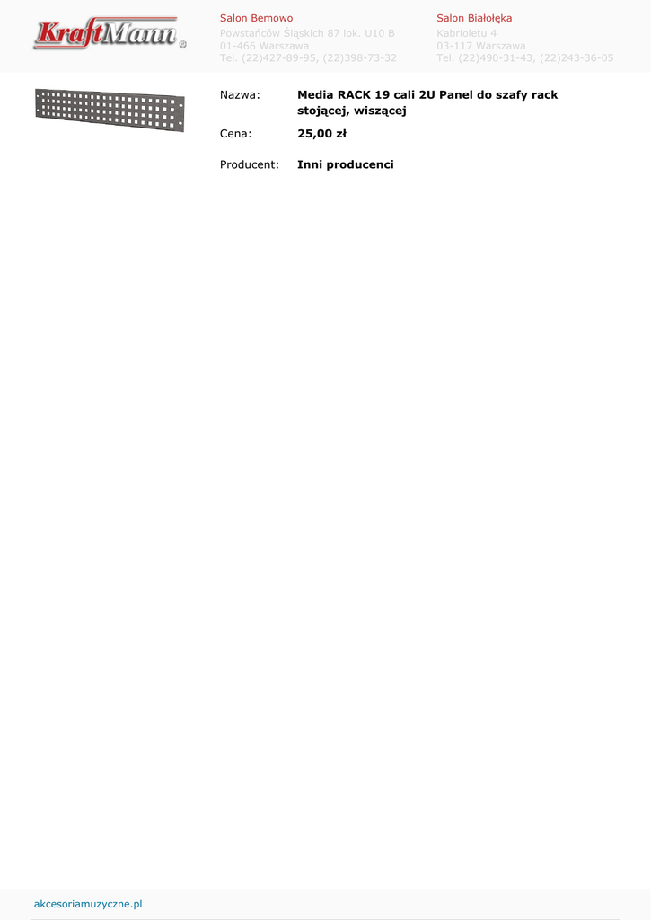 akcesoriamuzyczne.pl Salon Bemowo Salon Białołęka Powstańców Śląskich 87 lok. U10 B 01-466 Warszawa Tel. (22)427-89-95, (22)398-73-32 Kabrioletu 4 03-117 Warszawa Tel. (22)490-31-43, (22)243-36-05 Nazwa: Media RACK 19 cali 2U Panel do szafy rack stojącej, wiszącej Cena: 25,00 zł Producent: Inni producenci