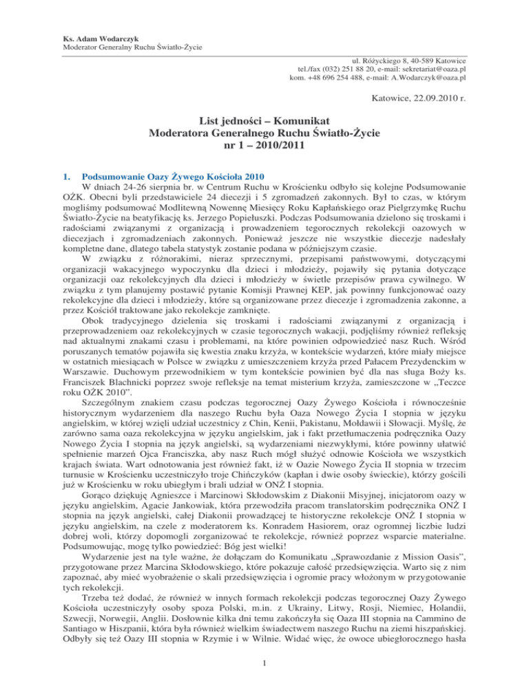 Ks. Adam Wodarczyk Moderator Generalny Ruchu wiatło- ycie ul. Ró yckiego 8, 40-589 Katowice tel./fax (032) 251 88 20, e-mail: [email protected] kom. +48 696 254 488, e-mail: [email protected] Katowice, 22.09.2010 r. List jedno ci – Komunikat Moderatora Generalnego Ruchu wiatło- ycie nr 1 – 2010/2011 1. Podsumowanie Oazy ywego Ko cioła 2010 W dniach 24-26 sierpnia br. w Centrum Ruchu w Kro cienku odbyło si kolejne Podsumowanie O K. Obecni byli przedstawiciele 24 diecezji i 5 zgromadze zakonnych. Był to czas, w którym mogli my podsumowa Modlitewn Nowenn Miesi cy Roku Kapła skiego oraz Pielgrzymk Ruchu wiatło- ycie na beatyfikacj ks. Jerzego Popiełuszki. Podczas Podsumowania dzielono si troskami i rado ciami zwi zanymi z organizacj i prowadzeniem tegorocznych rekolekcji oazowych w diecezjach i zgromadzeniach zakonnych. Poniewa jeszcze nie wszystkie diecezje nadesłały kompletne dane, dlatego tabela statystyk zostanie podana w pó niejszym czasie. W zwi zku z ró norakimi, nieraz sprzecznymi, przepisami pa stwowymi, dotycz cymi organizacji wakacyjnego wypoczynku dla dzieci i młodzie y, pojawiły si pytania dotycz ce organizacji oaz rekolekcyjnych dla dzieci i młodzie y w wietle przepisów prawa cywilnego. W zwi zku z tym planujemy postawi pytanie Komisji Prawnej KEP, jak powinny funkcjonowa oazy rekolekcyjne dla dzieci i młodzie y, które s organizowane przez diecezje i zgromadzenia zakonne, a przez Ko ciół traktowane jako rekolekcje zamkni te. Obok tradycyjnego dzielenia si troskami i rado ciami zwi zanymi z organizacj i przeprowadzeniem oaz rekolekcyjnych w czasie tegorocznych wakacji, podj li my równie refleksj nad aktualnymi znakami czasu i problemami, na które powinien odpowiedzie nasz Ruch. W ród poruszanych tematów pojawiła si kwestia znaku krzy a, w kontek cie wydarze , które miały miejsce w ostatnich miesi cach w Polsce w zwi zku z umieszczeniem krzy a przed Pałacem Prezydenckim w Warszawie. Duchowym przewodnikiem w tym kontek cie powinien by dla nas sługa Bo y ks. Franciszek Blachnicki poprzez swoje refleksje na temat misterium krzy a, zamieszczone w „Teczce roku O K 2010”. Szczególnym znakiem czasu podczas tegorocznej Oazy ywego Ko cioła i równocze nie historycznym wydarzeniem dla naszego Ruchu była Oaza Nowego ycia I stopnia w j zyku angielskim, w której wzi li udział uczestnicy z Chin, Kenii, Pakistanu, Mołdawii i Słowacji. My l , e zarówno sama oaza rekolekcyjna w j zyku angielskim, jak i fakt przetłumaczenia podr cznika Oazy Nowego ycia I stopnia na j zyk angielski, s wydarzeniami niezwykłymi, które powinny ułatwi spełnienie marze Ojca Franciszka, aby nasz Ruch mógł słu y odnowie Ko cioła we wszystkich krajach wiata. Wart odnotowania jest równie fakt, i w Oazie Nowego ycia II stopnia w trzecim turnusie w Kro cienku uczestniczyło troje Chi czyków (kapłan i dwie osoby wieckie), którzy go cili ju w Kro cienku w roku ubiegłym i brali udział w ON I stopnia. Gor co dzi kuj Agnieszce i Marcinowi Skłodowskim z Diakonii Misyjnej, inicjatorom oazy w j zyku angielskim, Agacie Jankowiak, która przewodziła pracom translatorskim podr cznika ON I stopnia na j zyk angielski, całej Diakonii prowadz cej te historyczne rekolekcje ON I stopnia w j zyku angielskim, na czele z moderatorem ks. Konradem Hasiorem, oraz ogromnej liczbie ludzi dobrej woli, którzy dopomogli zorganizowa te rekolekcje, równie poprzez wsparcie materialne. Podsumowuj c, mog tylko powiedzie : Bóg jest wielki! Wydarzenie jest na tyle wa ne, e doł czam do Komunikatu „Sprawozdanie z Mission Oasis”, przygotowane przez Marcina Skłodowskiego, które pokazuje cało przedsi wzi cia. Warto si z nim zapozna , aby mie wyobra enie o skali przedsi wzi cia i ogromie pracy wło onym w przygotowanie tych rekolekcji. Trzeba te doda , e równie w innych formach rekolekcji podczas tegorocznej Oazy ywego Ko cioła uczestniczyły osoby spoza Polski, m.in. z Ukrainy, Litwy, Rosji, Niemiec, Holandii, Szwecji, Norwegii, Anglii. Dosłownie kilka dni temu zako czyła si Oaza III stopnia na Cammino de Santiago w Hiszpanii, która była równie wielkim wiadectwem naszego Ruchu na ziemi hiszpa skiej. Odbyły si te Oazy III stopnia w Rzymie i w Wilnie. Wida wi c, e owoce ubiegłorocznego hasła 1 roku „Czy cie uczniów ze wszystkich narodów” s bardzo konkretne i pokazuj nam skal misji, która stoi przed naszym Ruchem! Jeste my równie po Podsumowaniu pracy rocznej Domowego Ko cioła, które miało miejsce w dniach 10-12.09.2010 r. w Przemy lu. Równie to spotkanie pokazało wiele dzieł Bo ych, które w minionym roku formacyjnym dokonały si w ród rodzin Domowego Ko cioła w Polsce i w innych krajach. Za ten dynamiczny rozwój Domowego Ko cioła trzeba Bogu gor co dzi kowa , szczególnie za wielkie owoce ró nych form rekolekcji dla rodzin. Wart jest równie podkre lenia fakt rozwoju kr gów Domowego Ko cioła w coraz wi kszej liczbie krajów Europy i na innych kontynentach (USA, Kanada). Bogu niech b d dzi ki!!! Bardzo dzi kuj wszystkim, którzy podj li podczas wakacji trud organizacji i prowadzenia Oaz ywego Ko cioła. Wierz gł boko, e Wasz trud słu by i wiadectwa wyda wielkie owoce w sercach ludzi, których powierzyła Wam Opatrzno Bo a. Dzi kuj równie wszystkim, którzy wzi li udział w radosnym dzi kczynieniu i refleksji, jakim jest czas Podsumowania O K w Kro cienku oraz Podsumowania Domowego Ko cioła w Przemy lu. Moderatorów diecezjalnych i zakonnych Ruchu wiatło- ycie, którzy nie wzi li udziału w tegorocznym Podsumowaniu i nie przysłali swoich reprezentantów, prosz , aby w przyszło ci zadbali o udział swoich diecezji w ogólnopolskich spotkaniach naszego Ruchu. 2. Oaza misyjna Mission: Oasis – Life Friendly Solution SPRAWOZDANIE Przygotowanie oraz przeprowadzenie Oazy Nowego ycia I stopnia w j zyku angielskim Organizacja pobytu w Polsce Chi czykom bior cym udział w ON II stopnia ORGANIZATORZY: Diakonia Misyjna Ruchu wiatło- ycie; Odpowiedzialni: Agnieszka 