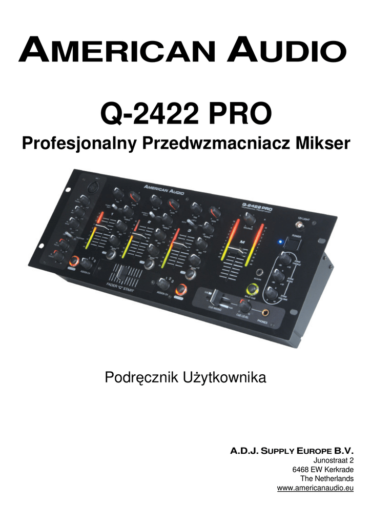 AMERICAN AUDIO Q-2422 PRO Profesjonalny Przedwzmacniacz Mikser Podręcznik UŜytkownika A.D.J. SUPPLY EUROPE B.V. Junostraat 2 6468 EW Kerkrade The Netherlands www.americanaudio.eu Q-2422 PRO SPIS TREŚCI GŁÓWNE CECHY ................................................................................................................................................................... 2 ŚRODKI OSTROśNOŚCI ZWIĄZANE Z ELEKTRYCZNOŚCIA ............................................................................................ 3 INSTRUKCJE DOTYCZĄCE BEZPIECZEŃSTWA ................................................................................................................ 5 WSTĘP.................................................................................................................................................................................... 6 ŚRODKI OSTROśNOŚCI PRZY SETUPIE ............................................................................................................................ 6 WYPAKOWANIE ..................................................................................................................................................................... 7 PODSTAWOWE WSKAZÓWKI .............................................................................................................................................. 7 ELEMENTY STERUJĄCE I FUNKCJE ................................................................................................................................... 8 PANEL PRZEDNI ................................................................................................................................................................ 8 PANEL TYLNY .................................................................................................................................................................. 12 TYPOWE USTAWIENIA MIKSERA ...................................................................................................................................... 15 CZYSZCZENIE ..................................................................................................................................................................... 17 WYMIANA CROSSFADERA................................................................................................................................................. 17 ROZWIĄZYWANIE PROBLEMÓW ...................................................................................................................................... 18 DANE TECHNICZNE ............................................................................................................................................................ 19 Q-2422 PRO • • • • • • • • • • • GŁÓWNE CECHY WyposaŜony w wysokiej jakości Crossfader (Wymienny) Wysoki poziom wyjścia słuchawkowego Wybór napięcia 115v~230v 3 kanałowy Mikser Wejścia 2 Phono, 4 Liniowe, 3 Aux 2 wejścia mikrofonowe – (1) XLR/ 1/4" wtyczka combo, (1) 1/4" Jacki wejściowe Kontrola głośności dla kaŜdego Mikrofonu Kontrola Master Balans Złącze 12v lampy BNC na elastycznym statywie Fader „Q” Start Przycisk On/Off funkcji Fader „Q” Start (wraz z odtwarzaczami CD American Audio z Fader „Q” Start) • • • • • • • • • • • Pokrętła typu „rotary kill” dla sopranów, basów i tonów średnich na wszystkich trzech kanałach Kontrola wzmocnienia dla kaŜdego kanału Ergonomiczny projekt Bardzo wysoki współczynnik sygnał/szum Przełącznik Odsłuchu – zmniejsza wzmocnienie wyjścia kanału o 14dB +/-2dB NiezaleŜne Wyjście Poziomu Strefy Diodowy wskaźnik stereo Monitorowanie Split Cue Cue Mixing Zbalansowane Wyjście Master XLR 4 opcje sygnału wyjścia – Master (RCA i Zbalansowane XLR), Strefa (RCA) i REC (RCA) Dane techniczne mogą być zmieniane bez uprzedzenia. ©American D.J.Supply® - www.americandj.eu – Q-2422 PRO Podręcznik UŜytkownika Strona 2 Q-2422 PRO ŚRODKI OSTROśNOŚCI ZWIĄZANE Z ELEKTRYCZNOŚCIA OSTRZEśENIE: ABY ZAPOBIEGAĆ ZAGROśENIU POśAREM LUB , PORAśENIEM PRĄDEM NALEśY CHRONIĆ MIKSER PRZED WODĄ I WILGOCIĄ WYBÓR NAPIĘCIA SIECI • • UWAGA: ABY UNIKNĄĆ PORAśENIA PRĄDEMNIE WOLNO UśYWAĆ TEJ (SPOLARYZOWANEJ) WTYCZKI Z PRZEDŁUśACZEM, PRZEJŚCIÓWKA LUB INNYM WYJŚCIEM, JEŚLI NIE MOśNA WŁOśYĆ WTYKÓW DO KOŃCA. • MoŜna ustawić Ŝądane napięcie za pomocą przełącznika VOLTAGE SELECTOR umieszczonym na tylnym panelu (naleŜy uŜyć śrubokręta z płaską główką). UŜywaj przełącznika VOLTAGE SELECTOR delikatnie. JeŜeli VOLTAGE SELECTOR przełącza się z problemami, skontaktuj się z pracownikiem serwisu. PRZEŁĄCZNIK WYBORU NAPIĘCIA FCC gdy do podłączenia urządzenia oraz Numer seryjny oraz numer modelu tego urządzenia znajdują się na tylnym panelu. Prosimy o wpisanie tych numerów poniŜej i ich zachowanie. innego wyposaŜenia uŜywane są kable i Nr Modelu _________________________ UWAGA: Produkt ten spełnia przepisy złącza ekranowane. Aby zapobiegać zakłóceń elektromagnetycznych z innymi urządzeniami elektrycznymi takimi jak radia i telewizory naleŜy ekranowanych kabli i złączy. uŜywać Nr Seryjny _________________________ Uwagi dotyczące zakupu: Data zakupu ___________________ Nazwa sprzedawcy _____________________ Adres sprzedawcy _____________________ ____________________________________ ____________________________________ Nr telefonu sprzedawcy _________________ ©American D.J.Supply® - www.americandj.eu – Q-2422 PRO Podręcznik UŜytkownika Strona 3 Q-2422 PRO ŚRODKI OSTROśNOŚCI ZWIĄZANE Z ELEKTRYCZNOŚCIĄ UWAGA RYZYKO PORAśENIA PRĄDEM NIE OTWIERAĆ Błyskawica umieszczona wewnątrz trójkąta równoramiennego oznacza ostrzeŜenie przed występowaniem wewnątrz obudowy nie izolowanych części pod napięciem wystarczająco wysokim, Ŝe występuje niebezpieczeństwo poraŜenia elektrycznego. UWAGA: ABY
