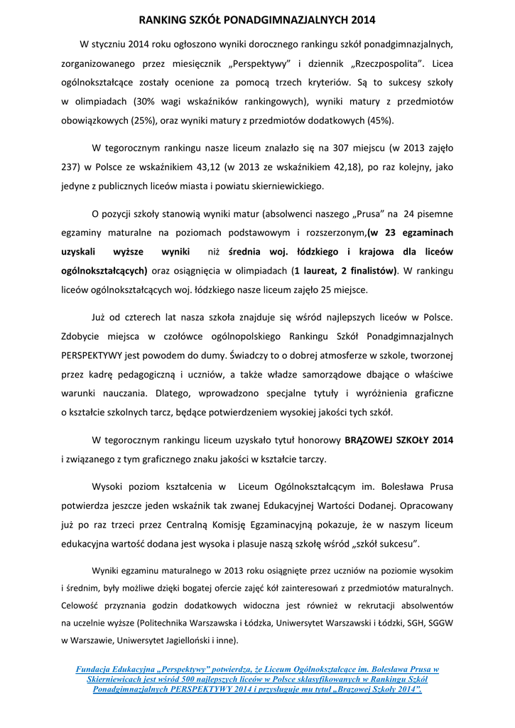RANKING SZKÓŁ PONADGIMNAZJALNYCH 2014 W styczniu 2014 roku ogłoszono wyniki dorocznego rankingu szkół ponadgimnazjalnych, zorganizowanego przez miesięcznik „Perspektywy” i dziennik „Rzeczpospolita”. Licea ogólnokształcące zostały ocenione za pomocą trzech kryteriów. Są to sukcesy szkoły w olimpiadach (30% wagi wskaźników rankingowych), wyniki matury z przedmiotów obowiązkowych (25%), oraz wyniki matury z przedmiotów dodatkowych (45%). W tegorocznym rankingu nasze liceum znalazło się na 307 miejscu (w 2013 zajęło 237) w Polsce ze wskaźnikiem 43,12 (w 2013 ze wskaźnikiem 42,18), po raz kolejny, jako jedyne z publicznych liceów miasta i powiatu skierniewickiego. O pozycji szkoły stanowią wyniki matur (absolwenci naszego „Prusa” na 24 pisemne egzaminy maturalne na poziomach podstawowym i rozszerzonym,(w 23 egzaminach uzyskali wyższe wyniki niż średnia woj. łódzkiego i krajowa dla liceów ogólnokształcących) oraz osiągnięcia w olimpiadach (1 laureat, 2 finalistów). W rankingu liceów ogólnokształcących woj. łódzkiego nasze liceum zajęło 25 miejsce. Już od czterech lat nasza szkoła znajduje się wśród najlepszych liceów w Polsce. Zdobycie miejsca w czołówce ogólnopolskiego Rankingu Szkół Ponadgimnazjalnych PERSPEKTYWY jest powodem do dumy. Świadczy to o dobrej atmosferze w szkole, tworzonej przez kadrę pedagogiczną i uczniów, a także władze samorządowe dbające o właściwe warunki nauczania. Dlatego, wprowadzono specjalne tytuły i wyróżnienia graficzne o kształcie szkolnych tarcz, będące potwierdzeniem wysokiej jakości tych szkół. W tegorocznym rankingu liceum uzyskało tytuł honorowy BRĄZOWEJ SZKOŁY 2014 i związanego z tym graficznego znaku jakości w kształcie tarczy. Wysoki poziom kształcenia w Liceum Ogólnokształcącym im. Bolesława Prusa potwierdza jeszcze jeden wskaźnik tak zwanej Edukacyjnej Wartości Dodanej. Opracowany już po raz trzeci przez Centralną Komisję Egzaminacyjną pokazuje, że w naszym liceum edukacyjna wartość dodana jest wysoka i plasuje naszą szkołę wśród „szkół sukcesu”. Wyniki egzaminu maturalnego w 2013 roku osiągnięte przez uczniów na poziomie wysokim i średnim, były możliwe dzięki bogatej ofercie zajęć kół zainteresowań z przedmiotów maturalnych. Celowość przyznania godzin dodatkowych widoczna jest również w rekrutacji absolwentów na uczelnie wyższe (Politechnika Warszawska i Łódzka, Uniwersytet Warszawski i Łódzki, SGH, SGGW w Warszawie, Uniwersytet Jagielloński i inne). Fundacja Edukacyjna „Perspektywy” potwierdza, że Liceum Ogólnokształcące im. Bolesława Prusa w Skierniewicach jest wśród 500 najlepszych liceów w Polsce sklasyfikowanych w Rankingu Szkół Ponadgimnazjalnych PERSPEKTYWY 2014 i przysługuje mu tytuł „Brązowej Szkoły 2014”.